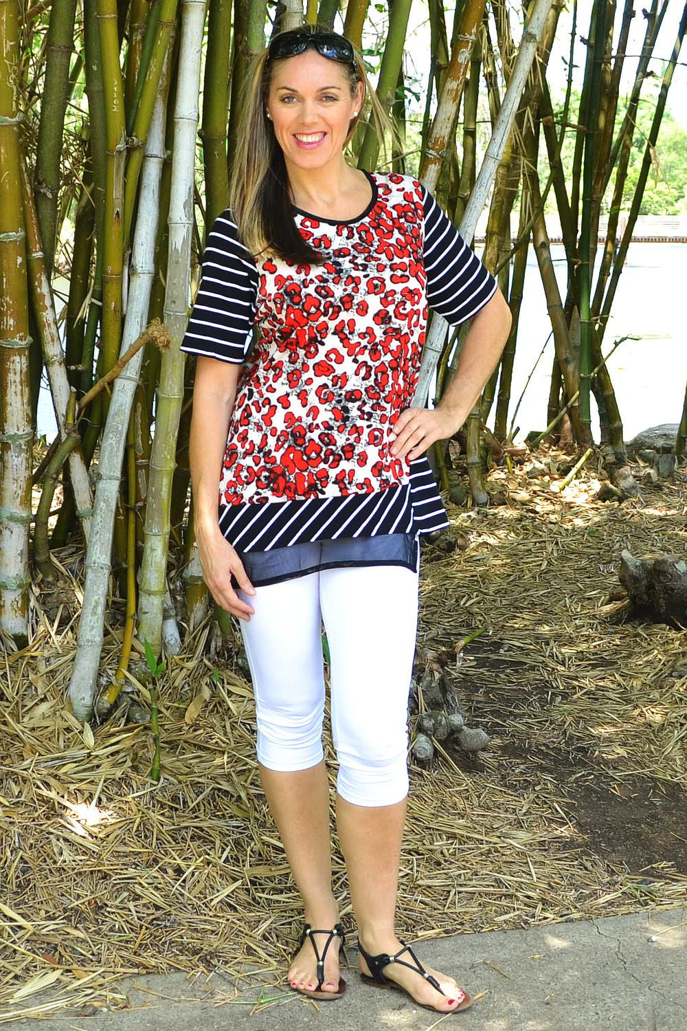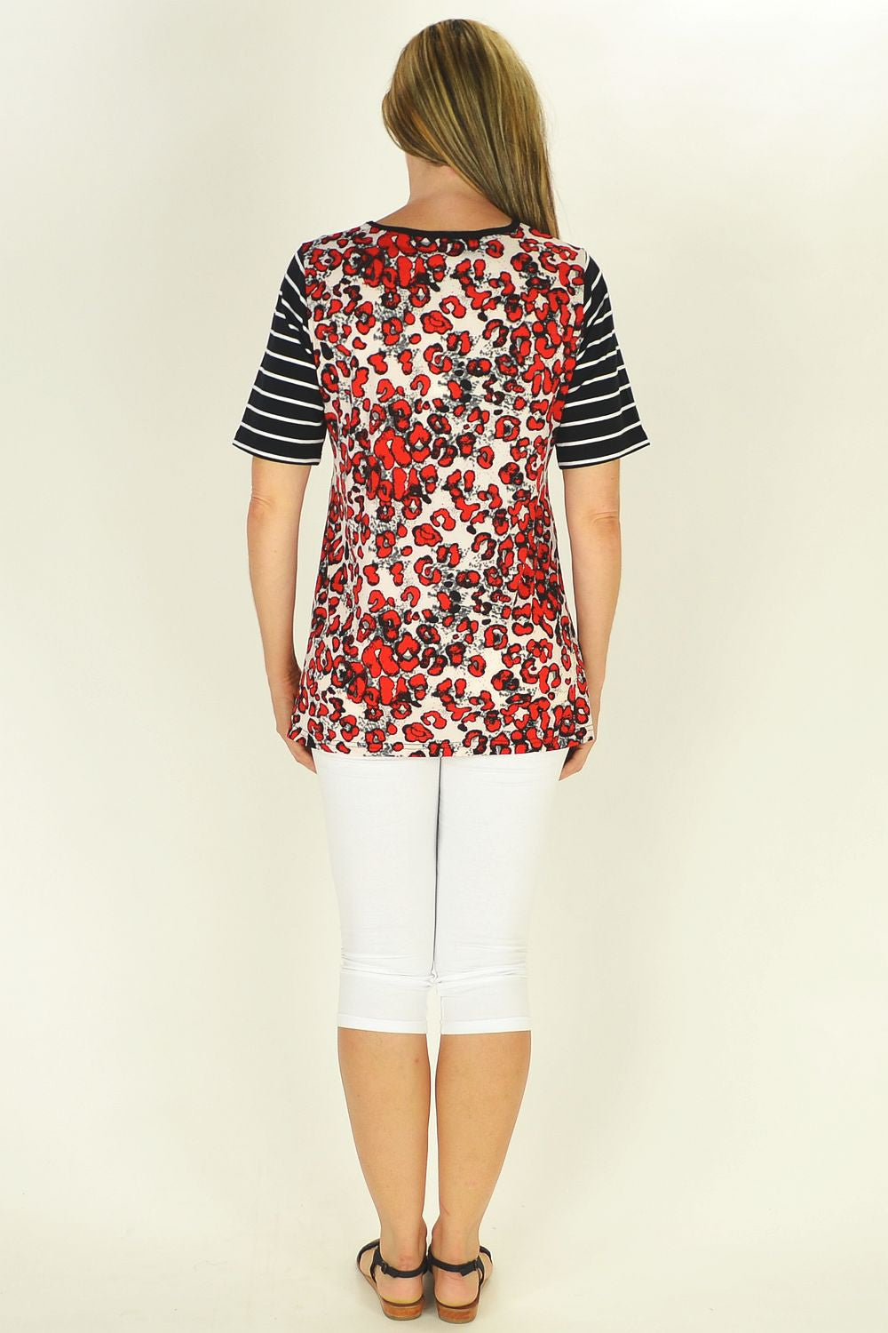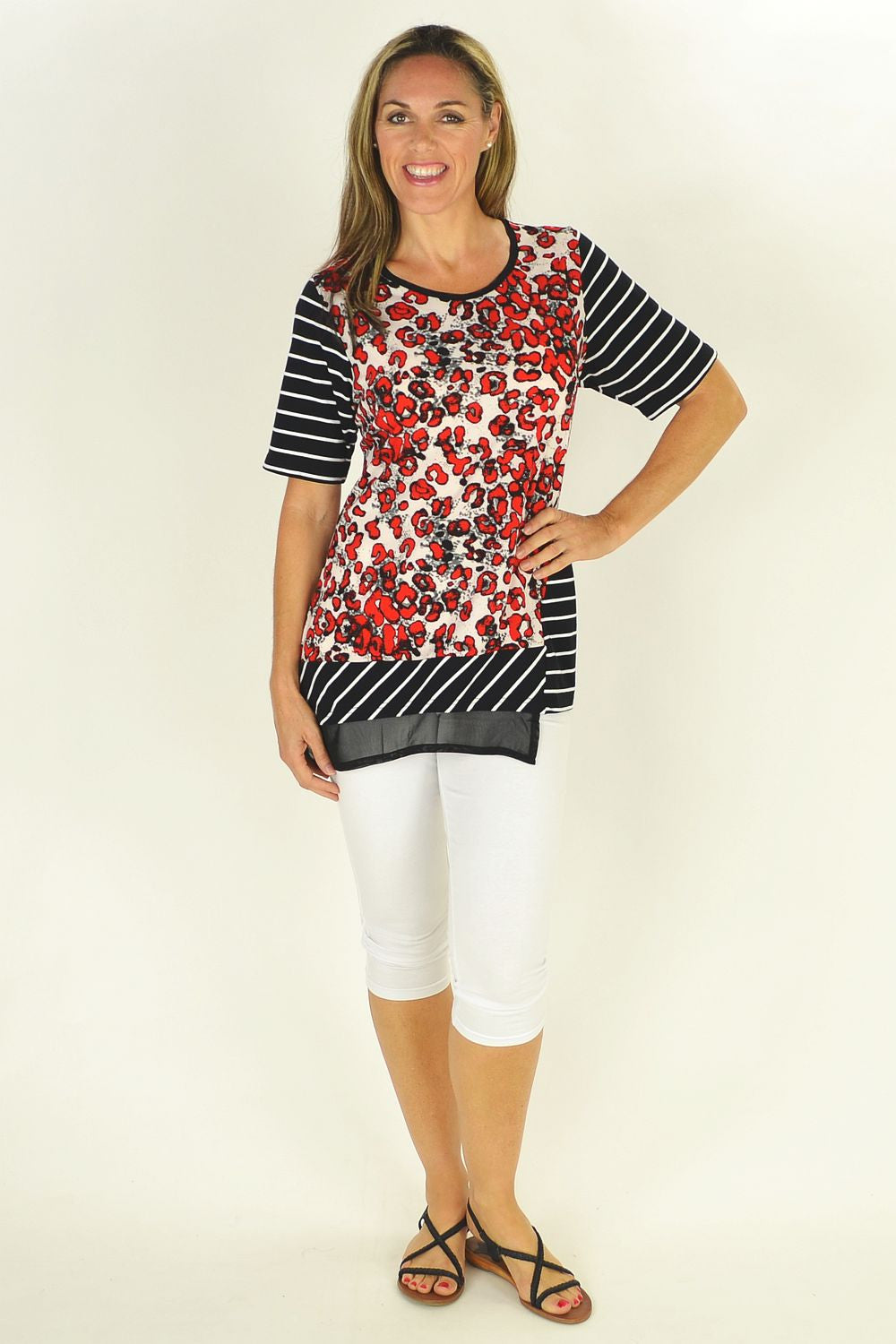 Regular price $59.99 Sale price $49.99Look stylish and feel relaxed in this Beverly tunic. With its bright red print and contracting cream base and black and white stripe sleeves. It will look great paired with 3/4 capris or leggings.