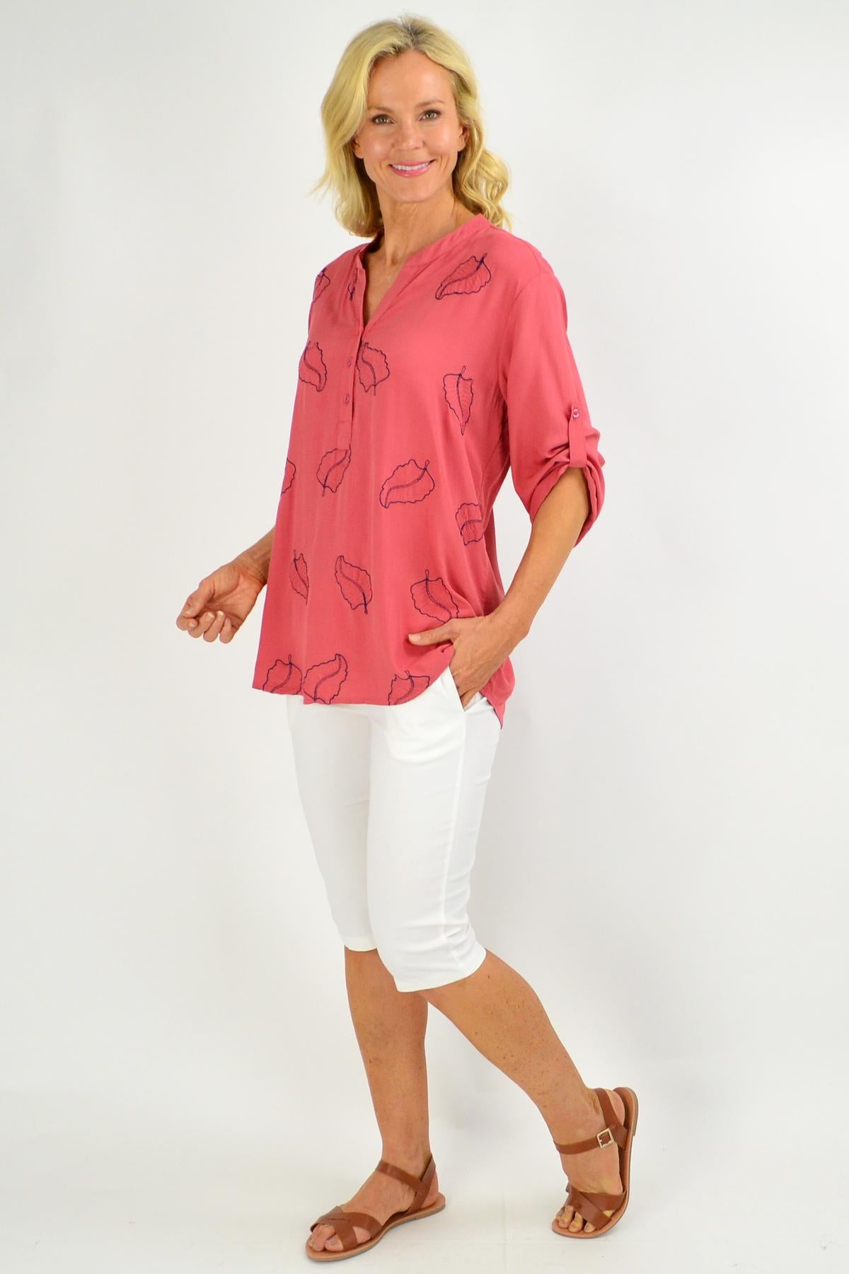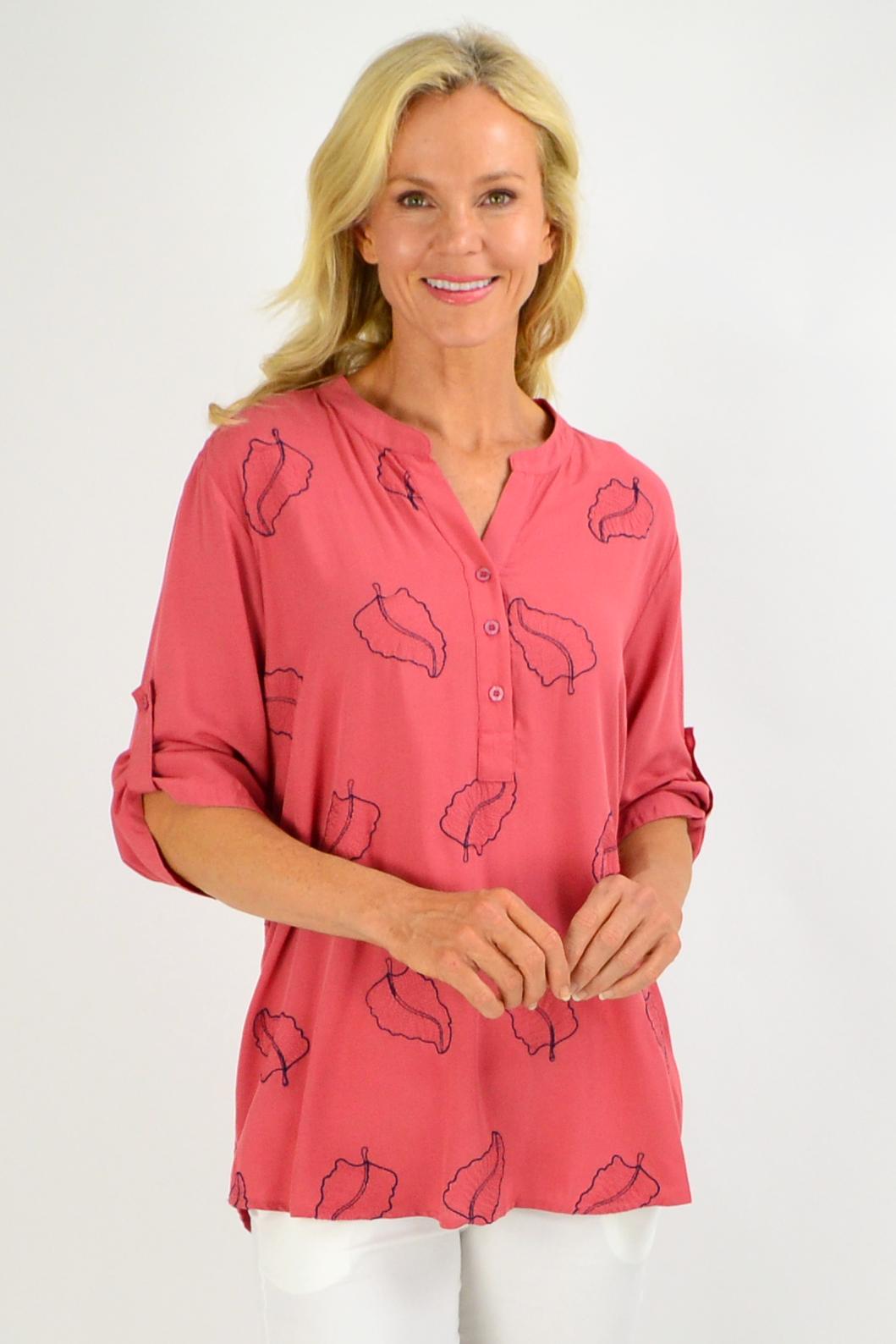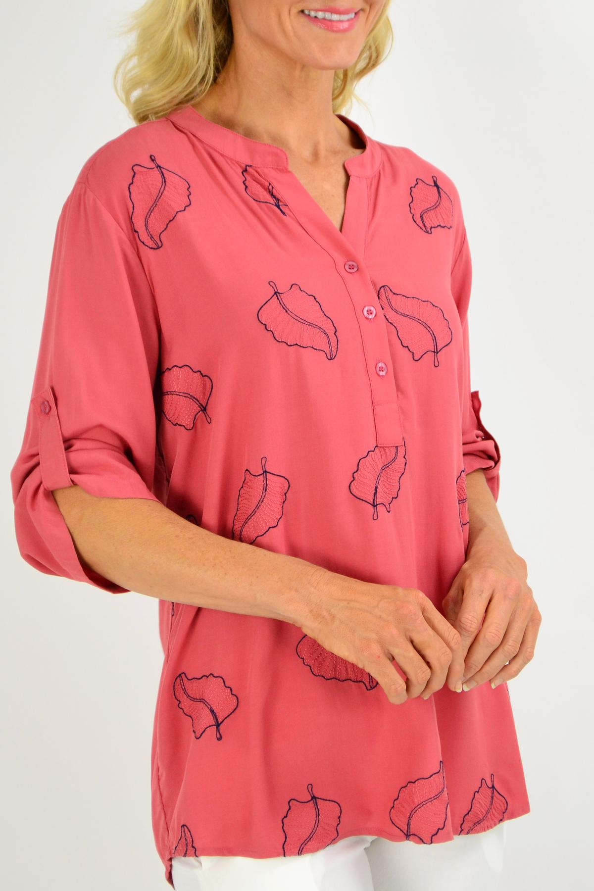 Regular price $69.99The Coral Leaf Print Nehru Collar Tunic Top by Threadz, is an eye-catching statement piece perfect for work or play. Featuring 3/4 sleeves with side button up tab detailing, nehru collar, black leaf print front highlighted with self coloured embroidery and a v-neckline this striking soft and flowy viscose top is easy-to-wear, simply pop-over any pant or capri for effortless style.