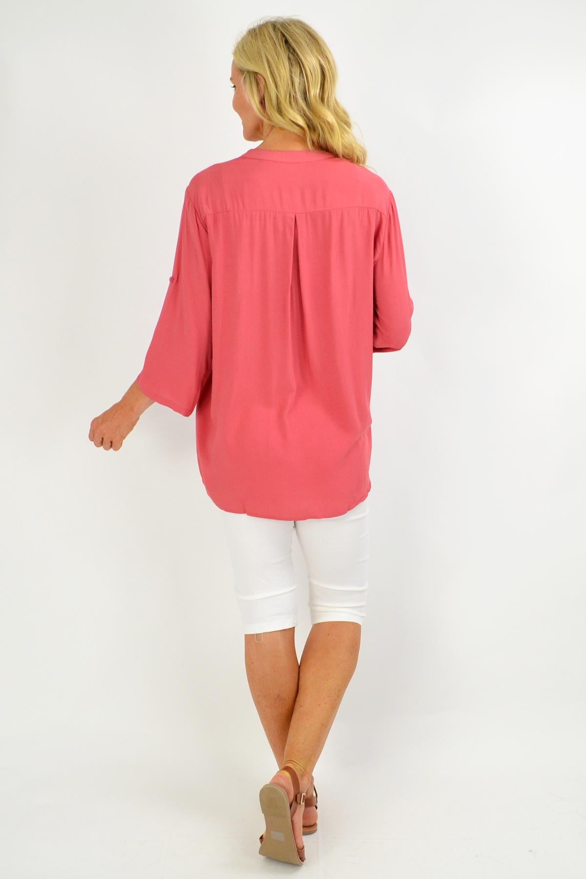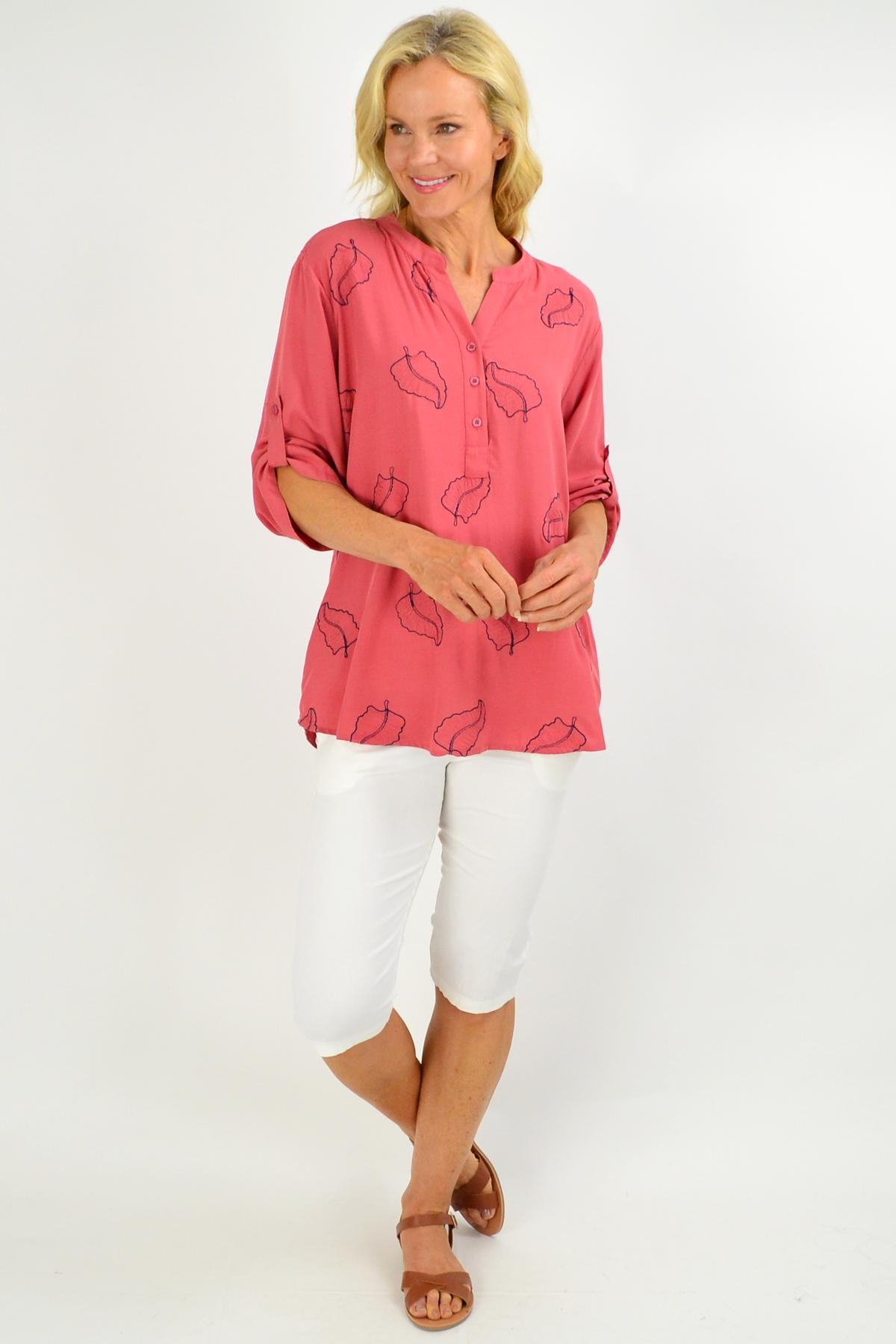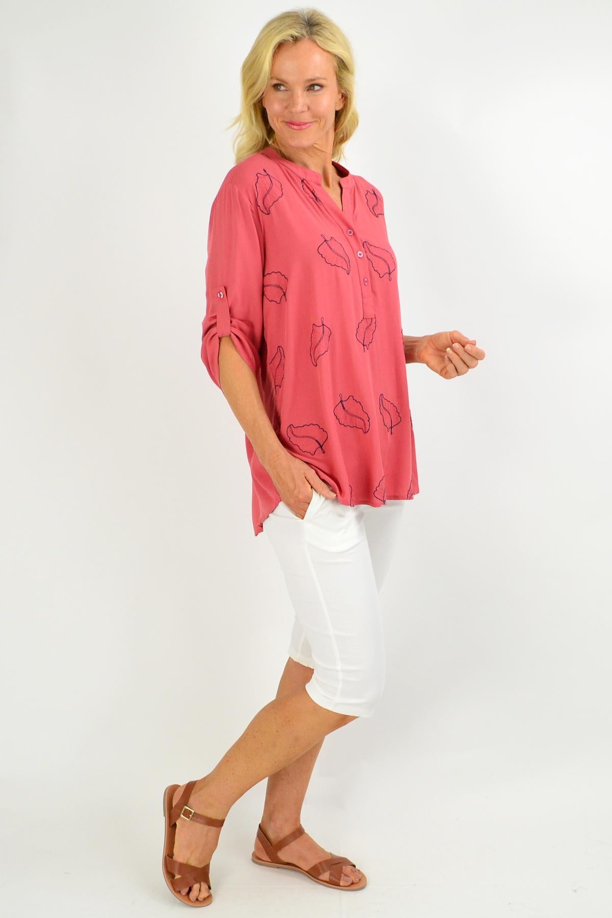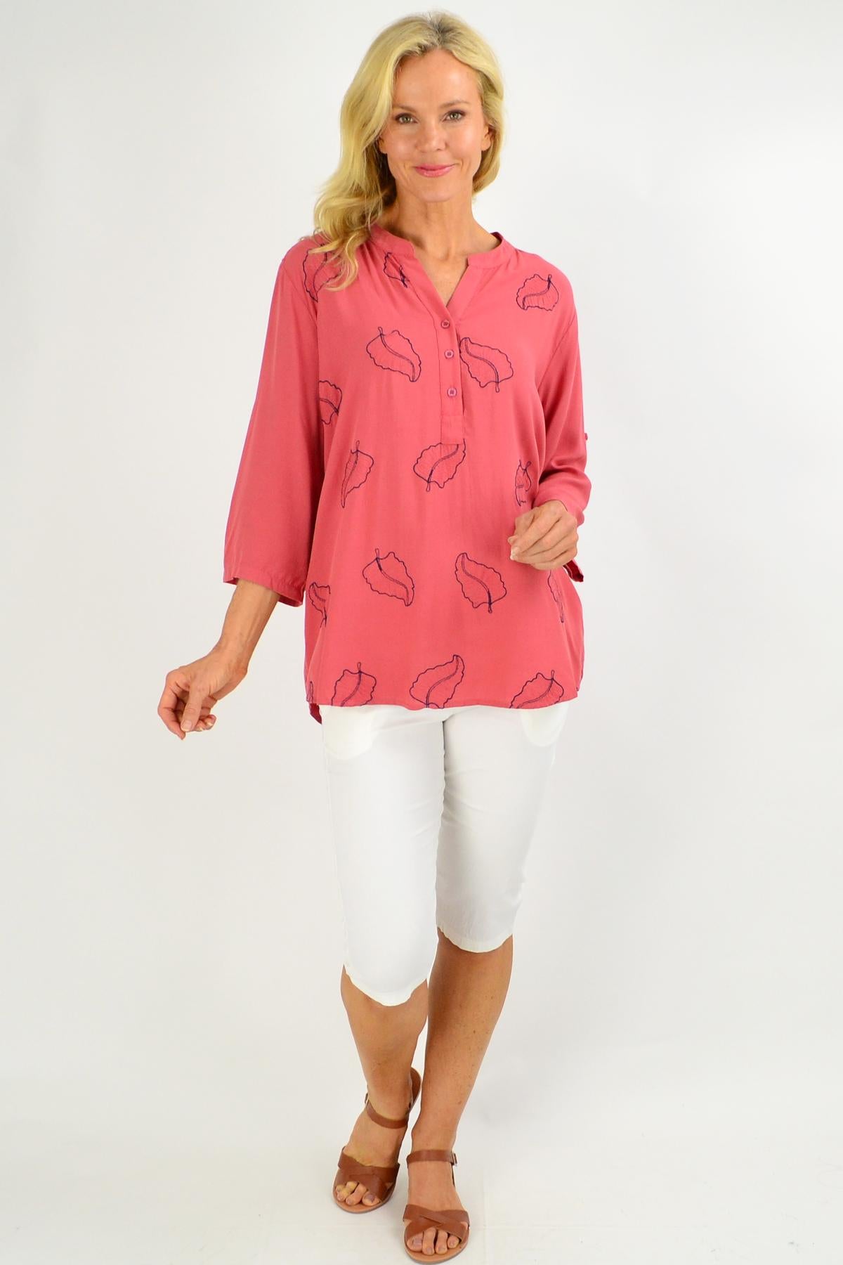 Regular price $69.99The Coral Leaf Print Nehru Collar Tunic Top by Threadz, is an eye-catching statement piece perfect for work or play. Featuring 3/4 sleeves with side button up tab detailing, nehru collar, black leaf print front highlighted with self coloured embroidery and a v-neckline this striking soft and flowy viscose top is easy-to-wear, simply pop-over any pant or capri for effortless style.