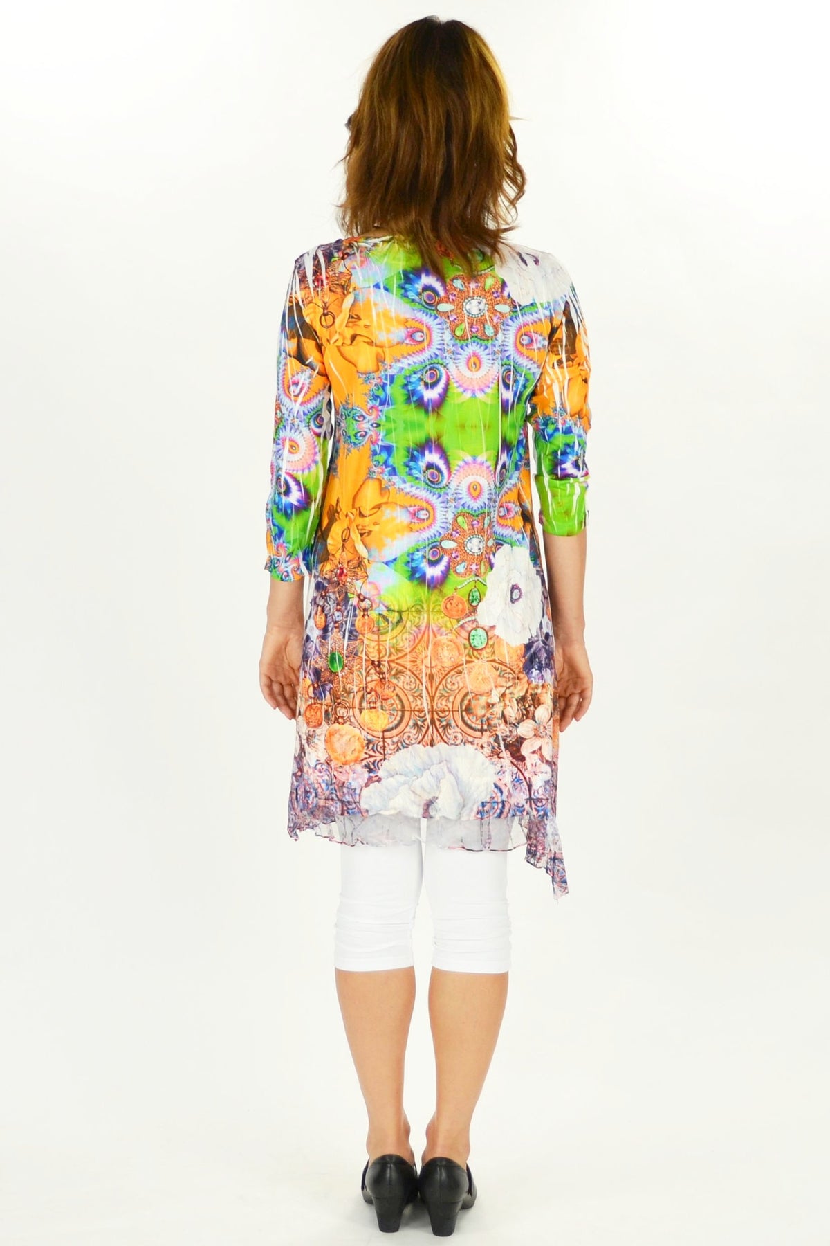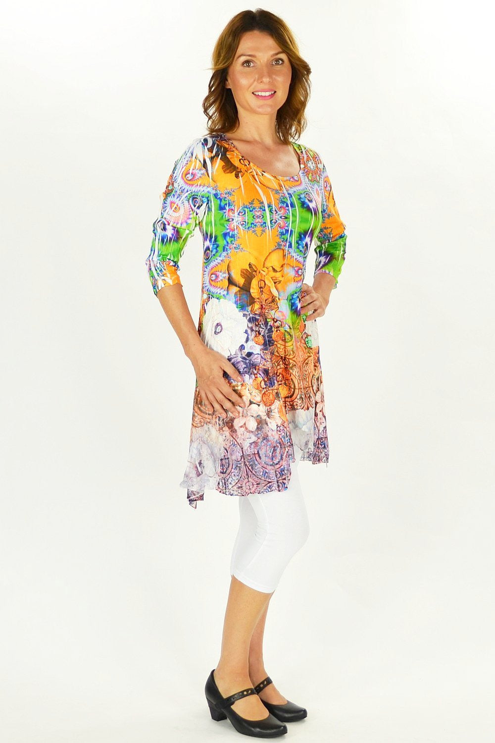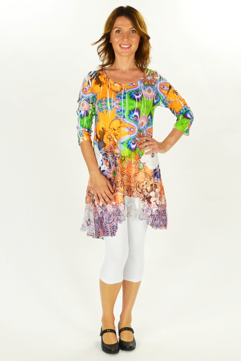 Fall in love with this colourful Gem tunic. It features a green and orange floral and gem pattern with a soft lace hem. Made from a stretch jersey fabric with 3/4 sleeves. Wear it with leggings or add a slip and transform it into a dress