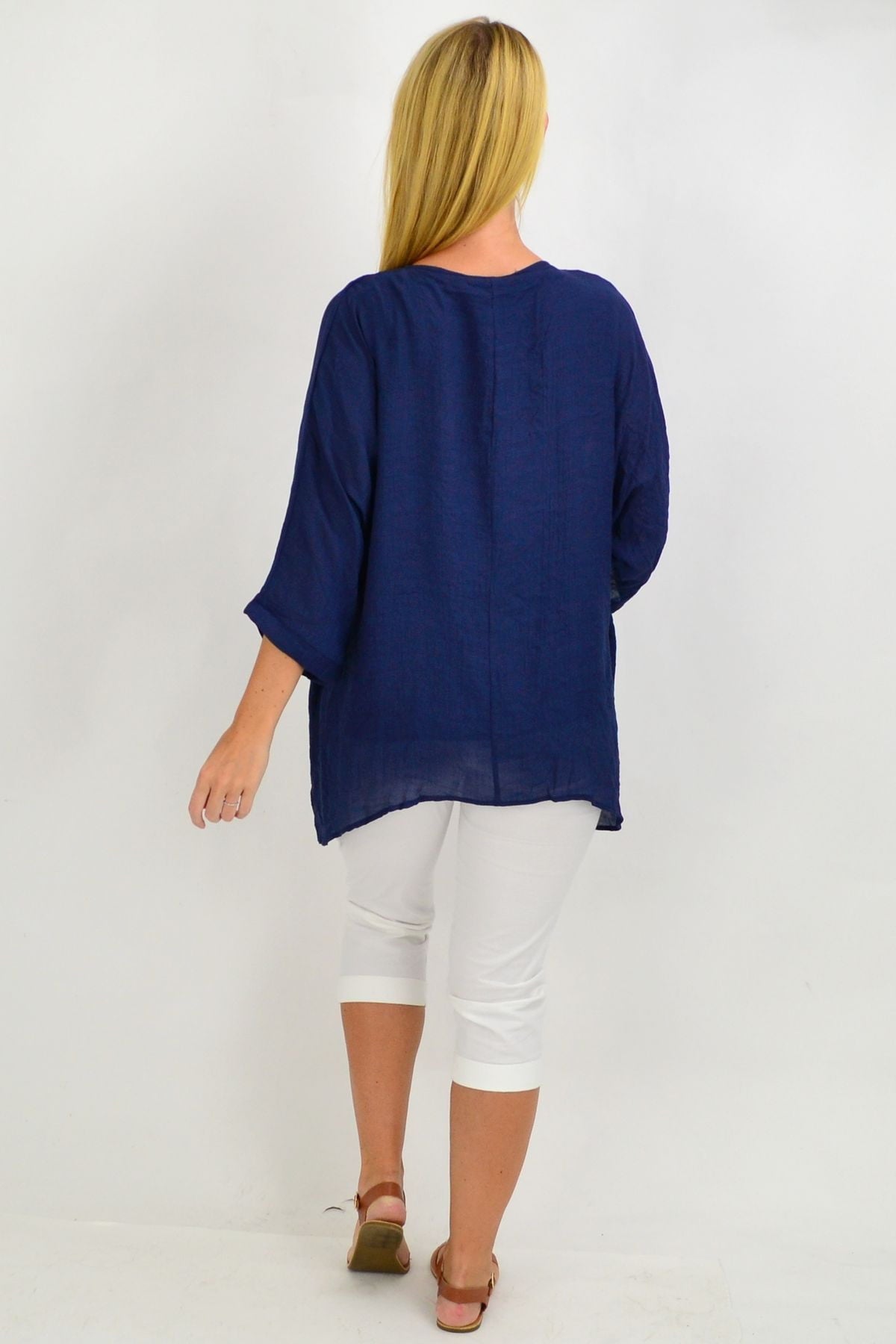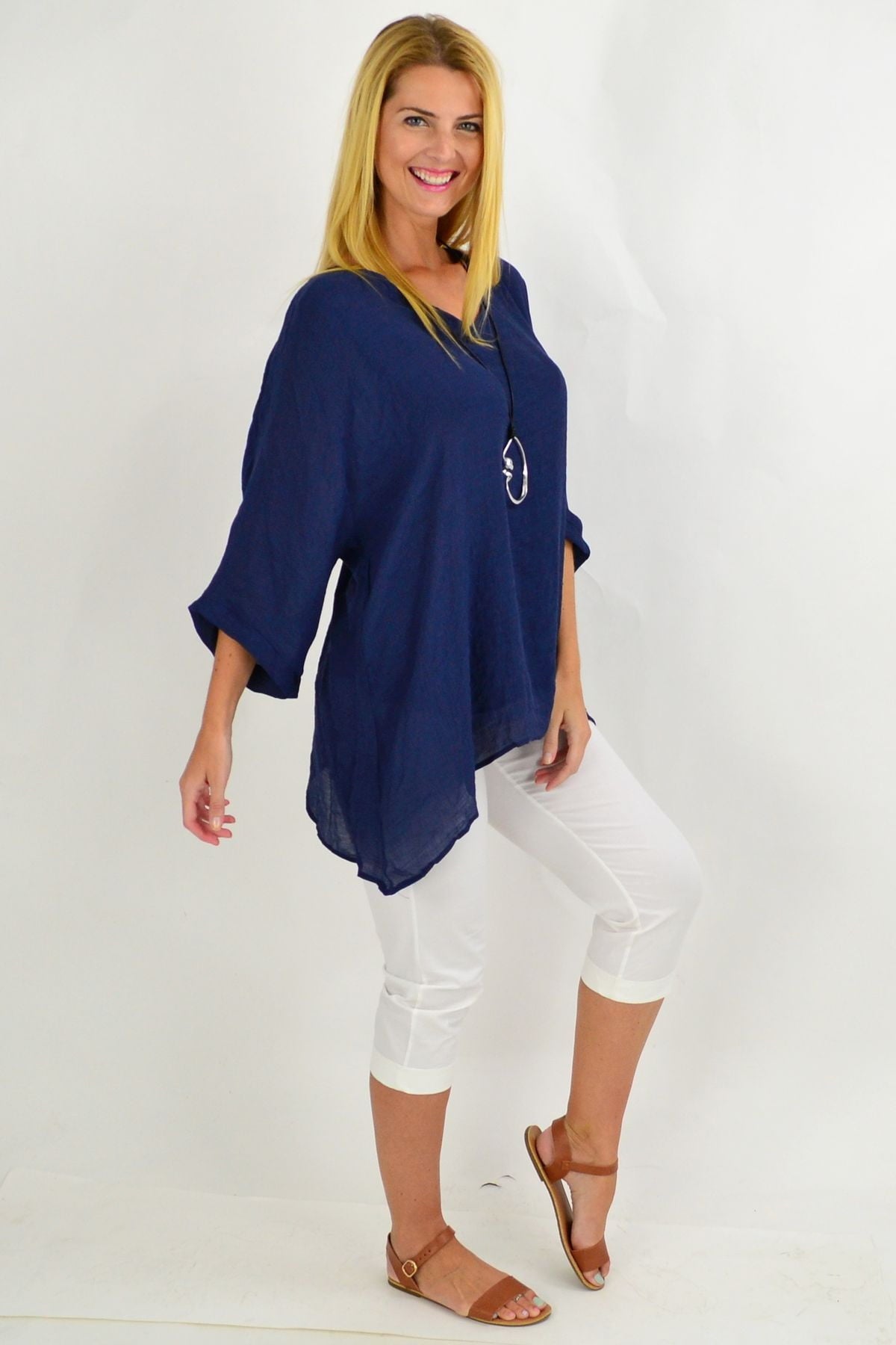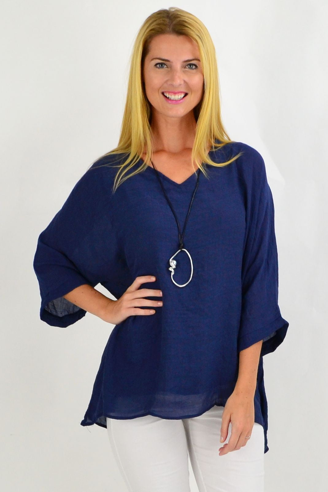Regular price $49.99The Navy Slop Sleeve Tunic Top is the perfect relaxed tunic for these hot summer days. It featured slopping sleeves with a scooped hem and is made in a relaxed cut that drapes over the body. Pop over a pair of 3/4 capris or slim pants, add some funky earrings and sandals, and your Christmas Day look is sorted.