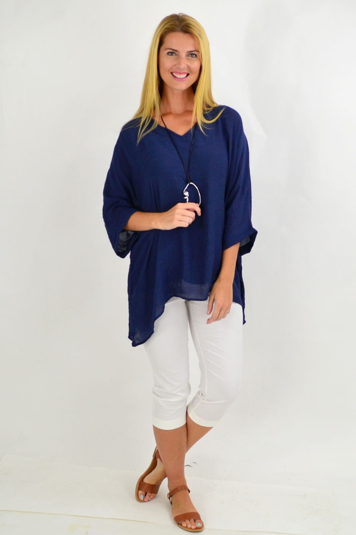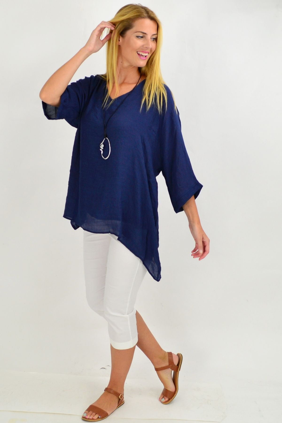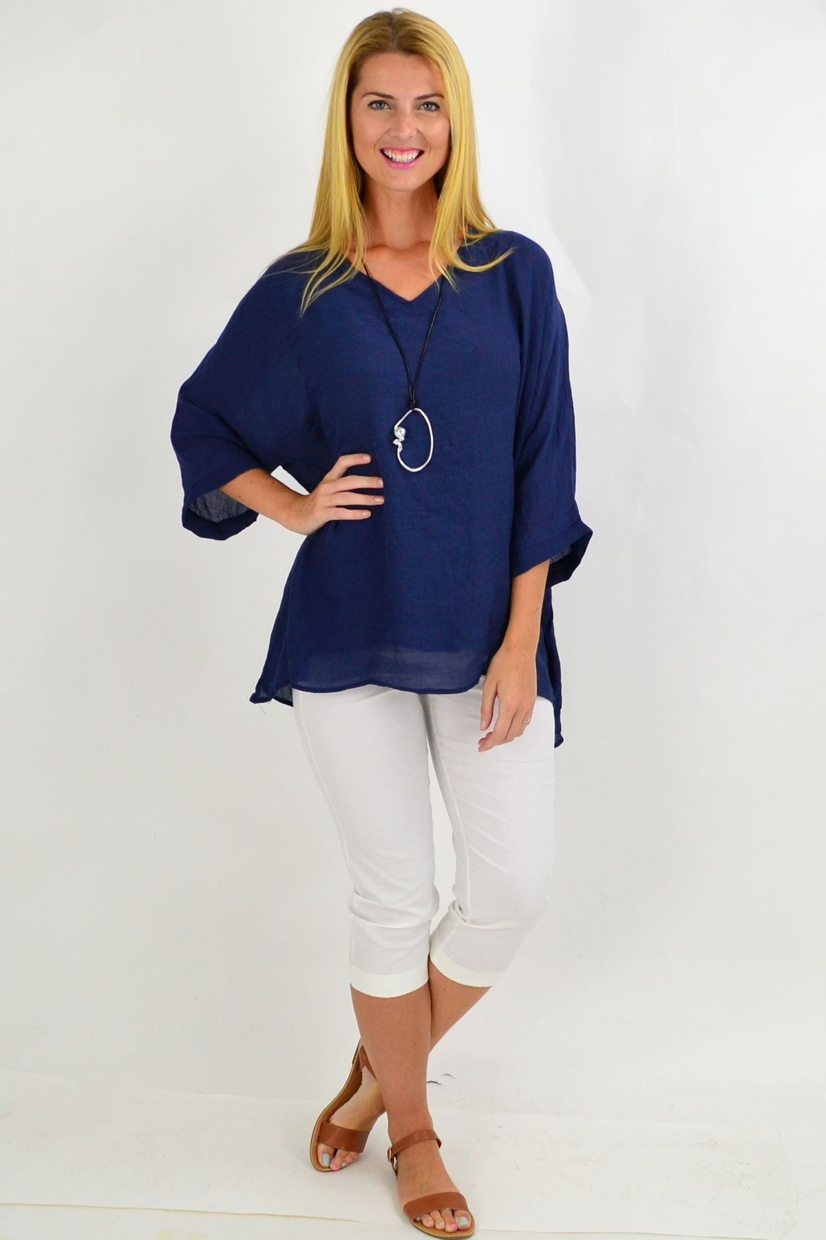 Regular price $49.99The Navy Slop Sleeve Tunic Top is the perfect relaxed tunic for these hot summer days. It featured slopping sleeves with a scooped hem and is made in a relaxed cut that drapes over the body. Pop over a pair of 3/4 capris or slim pants, add some funky earrings and sandals, and your Christmas Day look is sorted.