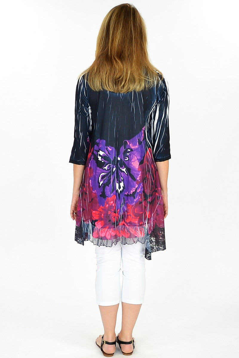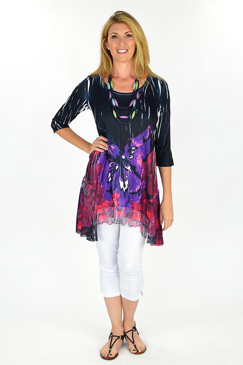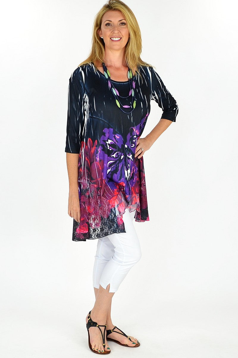 Regular price $69.99Fall in love with this beautiful Purple Pansy tunic. It features a red and purple pansy print on a contrasting black background with a soft lace hem. Made from a stretch jersey fabric with 3/4 sleeves. Wear it with leggings or add a slip and transform it into a dress