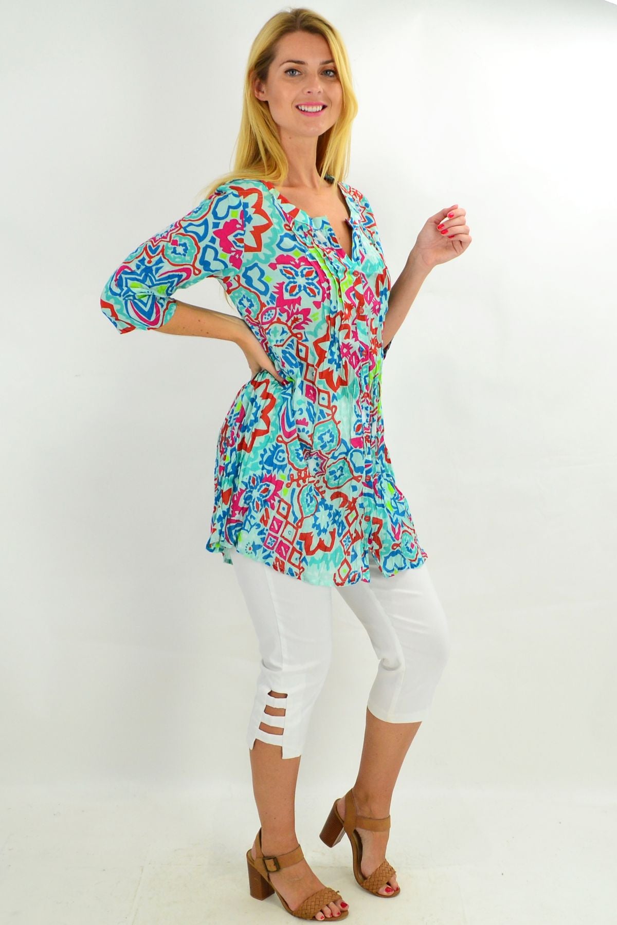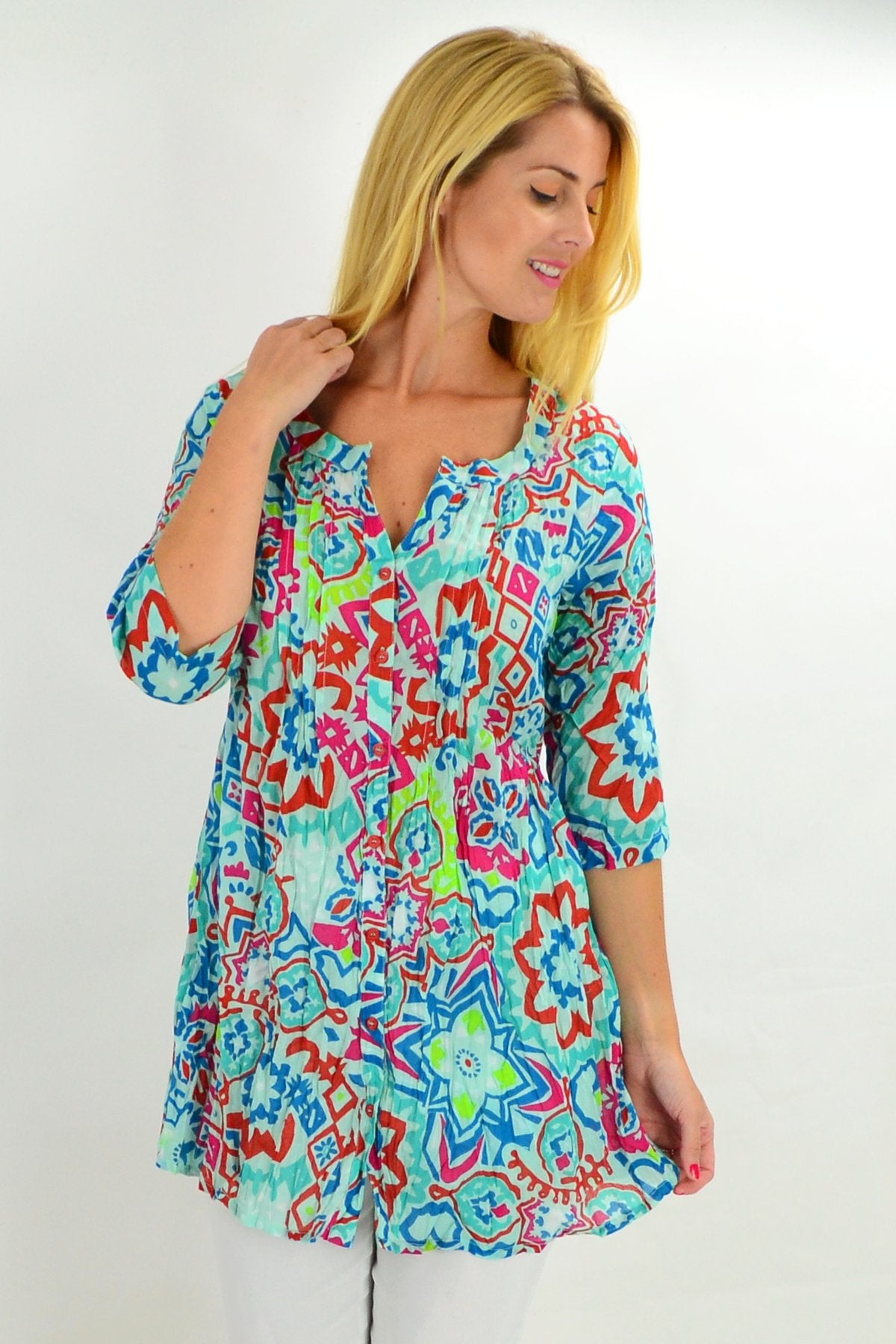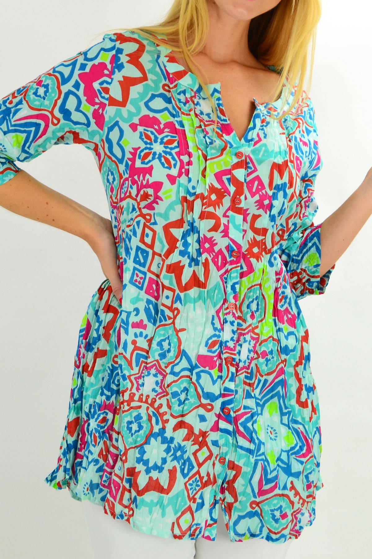 Regular price $59.00Looking on trend has ever been easier in this relaxed Turquoise Turkish Tile Button Up Tunic Blouse by One Summer. The soft crinkle cotton is comfortable and breathable, while the button up front allows you to wear it open or closed. It also features a grandad style collar, 3/4 sleeves and front pleats that make it the perfect A line tunic. Wear it with 3/4 white capris and a sun hat for the perfect cotton summer shirt