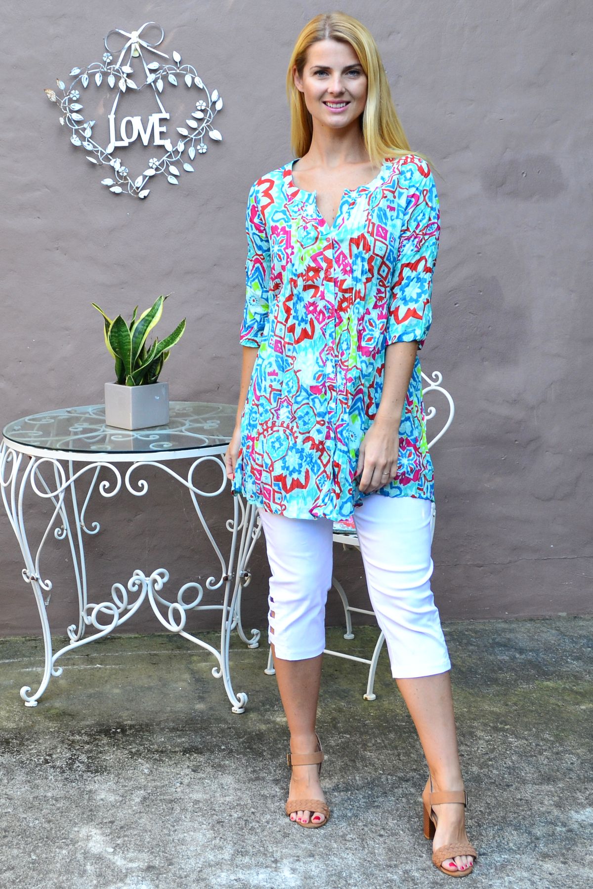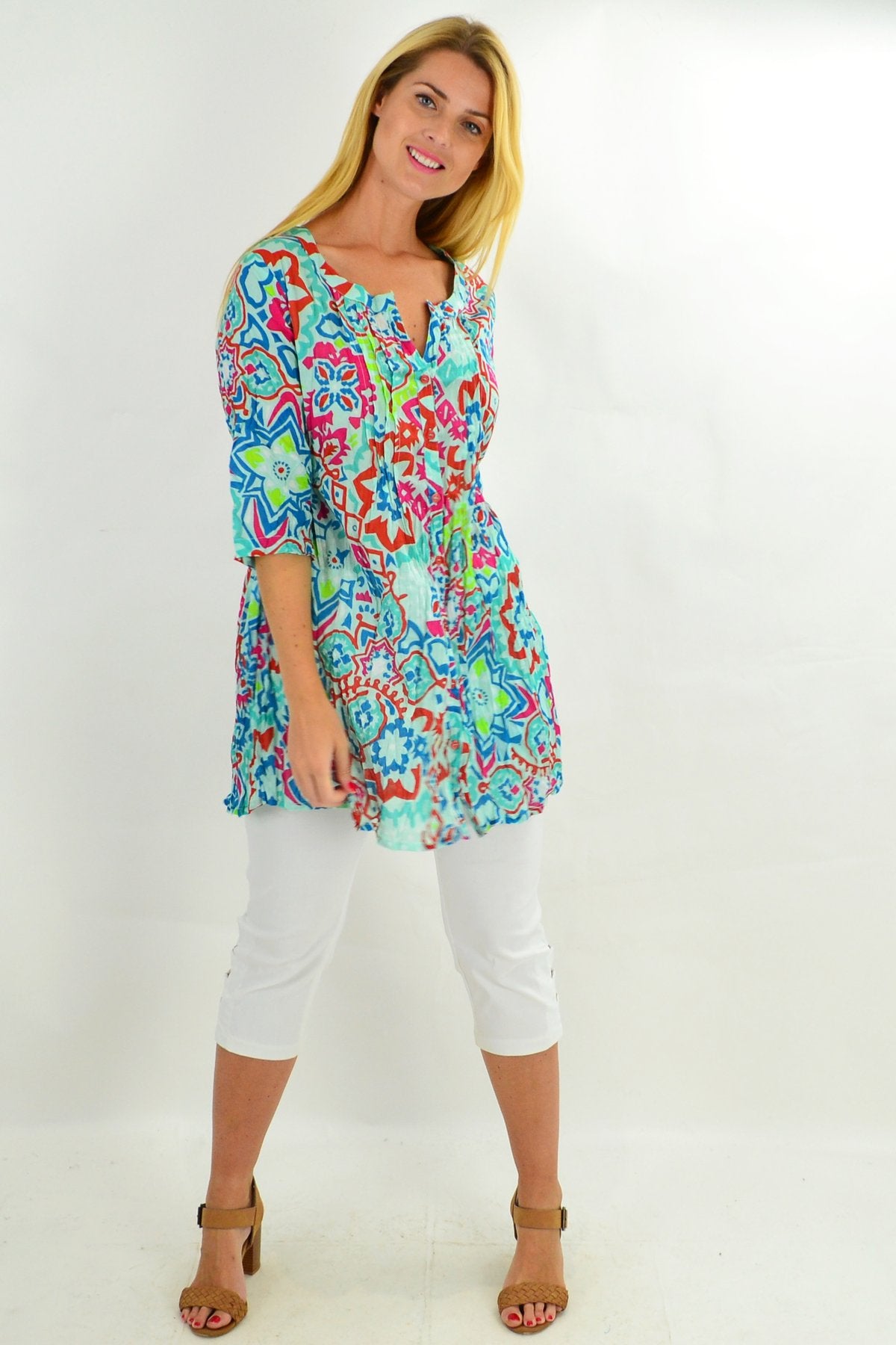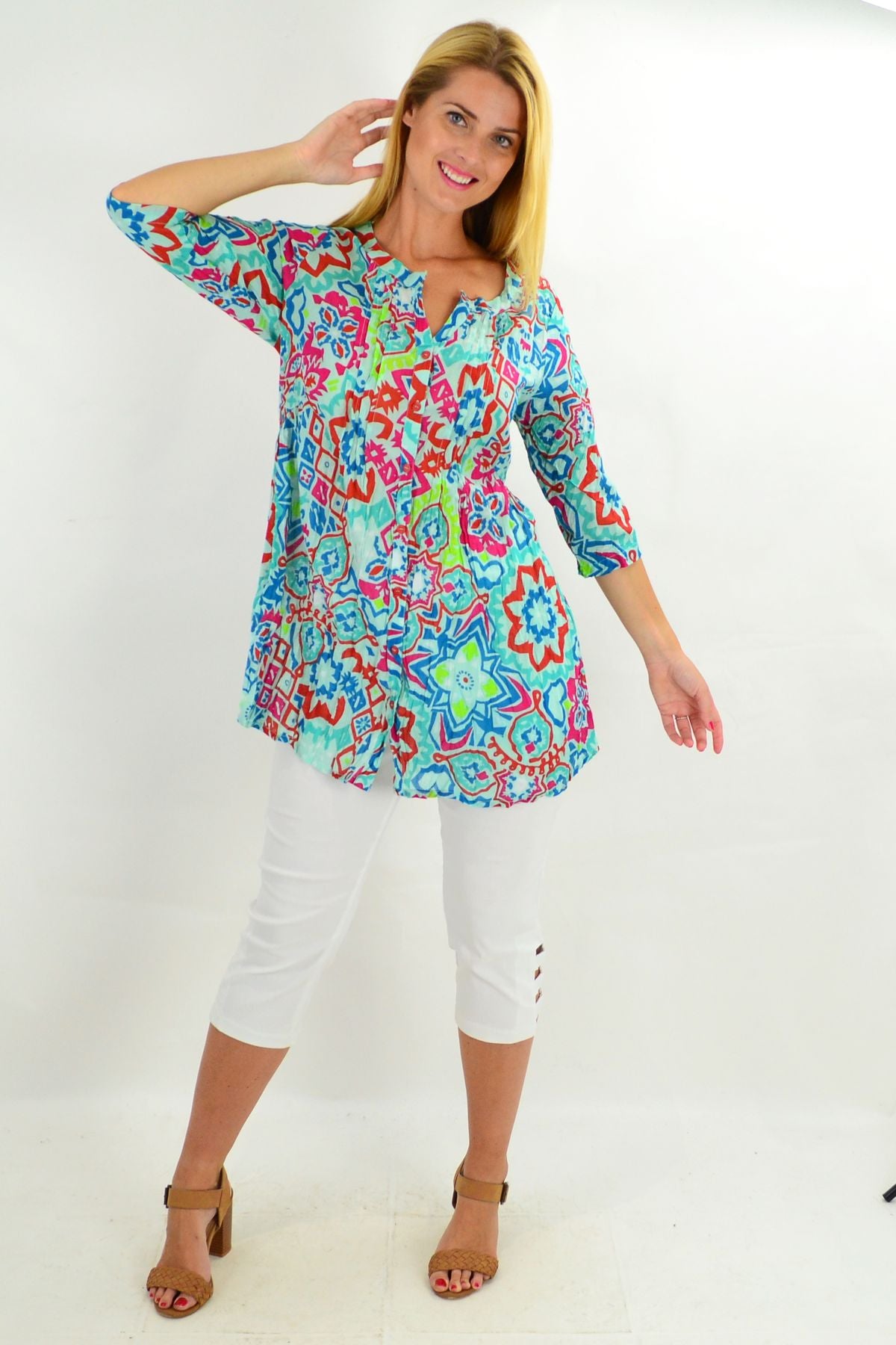 Regular price $59.00Looking on trend has ever been easier in this relaxed Turquoise Turkish Tile Button Up Tunic Blouse by One Summer. The soft crinkle cotton is comfortable and breathable, while the button up front allows you to wear it open or closed. It also features a grandad style collar, 3/4 sleeves and front pleats that make it the perfect A line tunic. Wear it with 3/4 white capris and a sun hat for the perfect cotton summer shirt