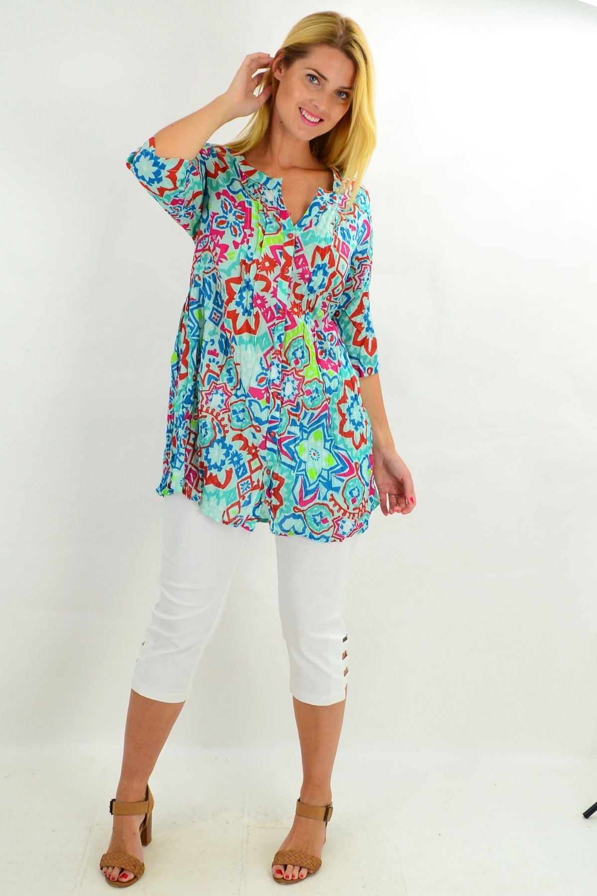 - Turquoise Turkish Tile Button Up Tunic Blouse