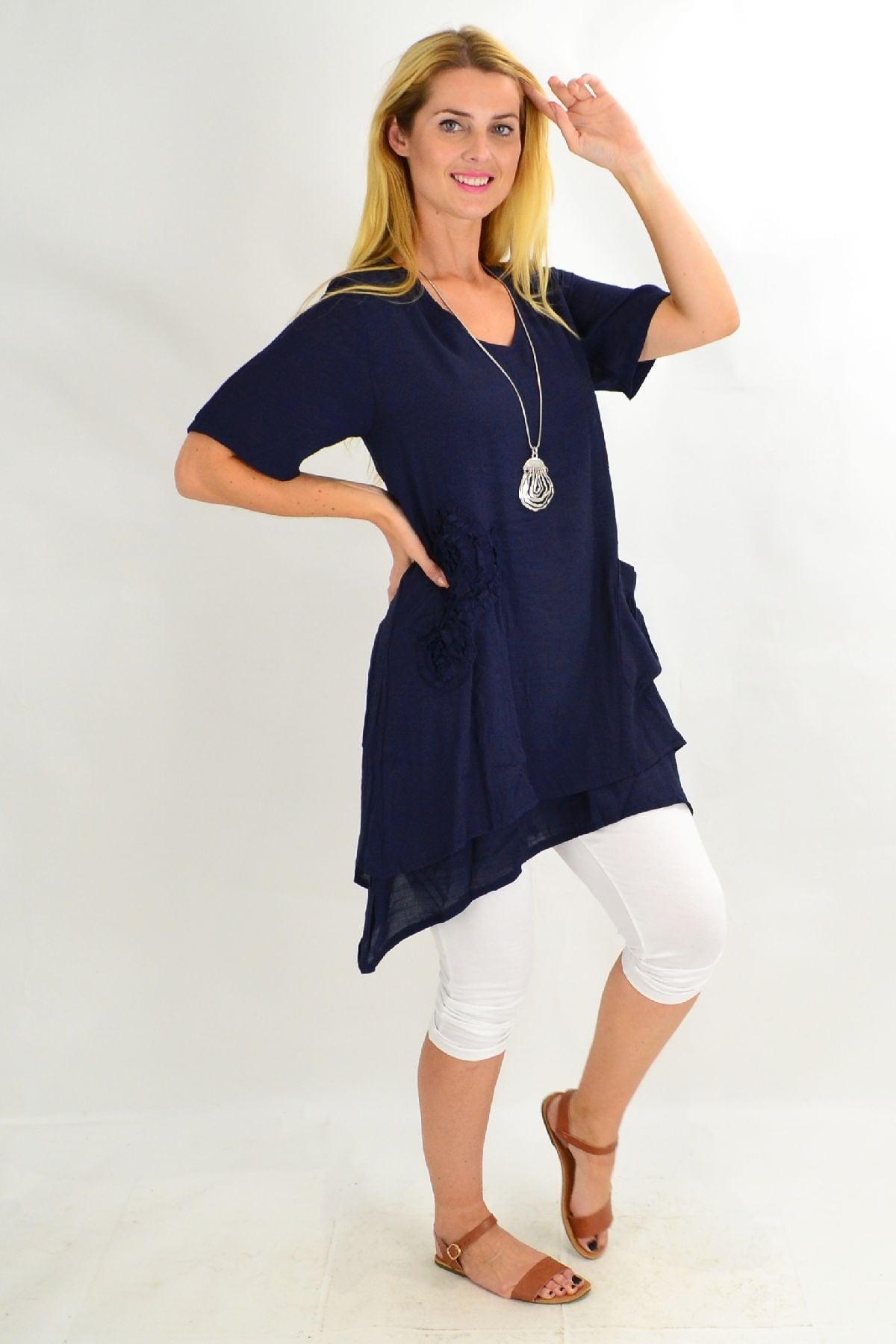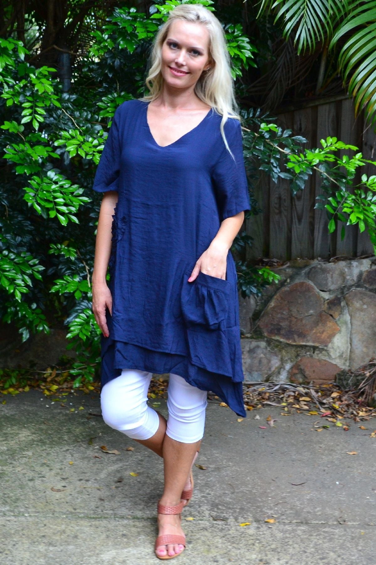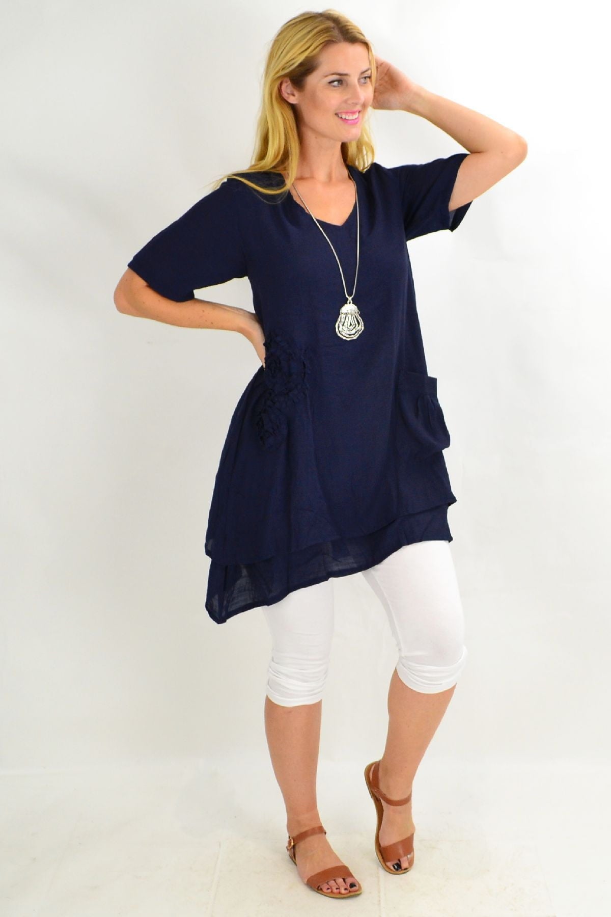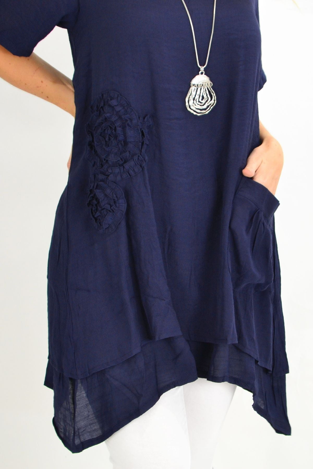 Regular price $54.99This Navy Applique Short Sleeve Tunic Top is the perfect start to summer. It is made in a woven cotton blend fabric that falls easily over the body, with elbow length sleeves, V neck with circle applique detail and has two layers that provide a flattering drape. Match with white crop pants, sandals and a hat for a stylish look this summer