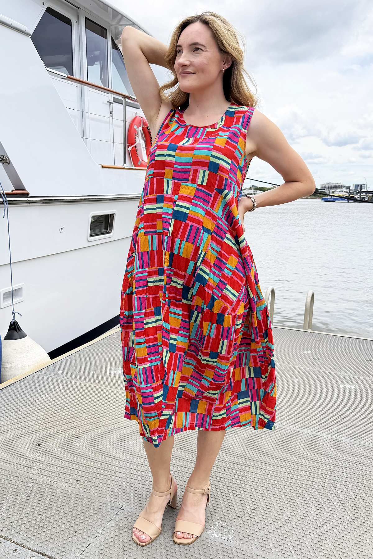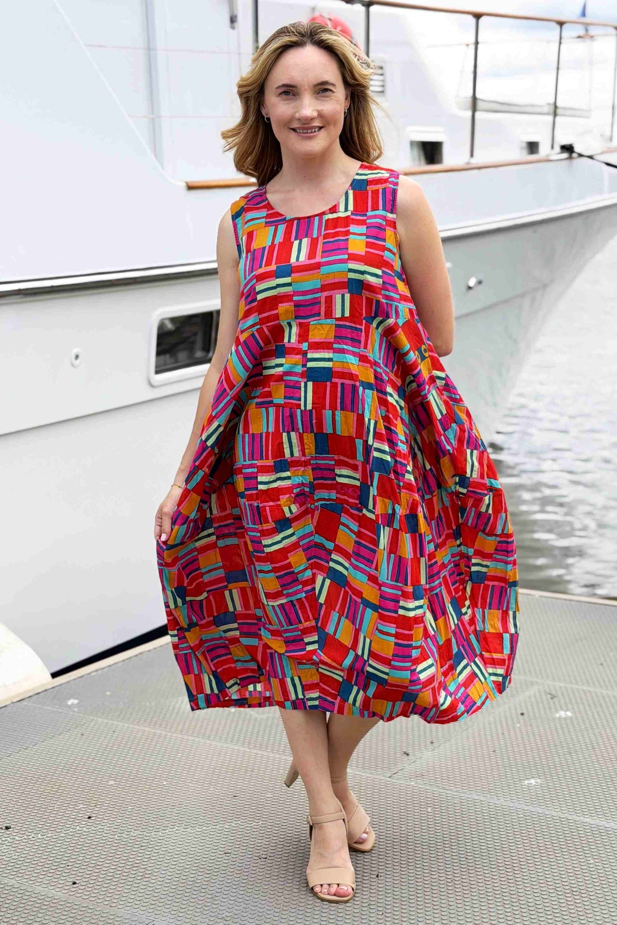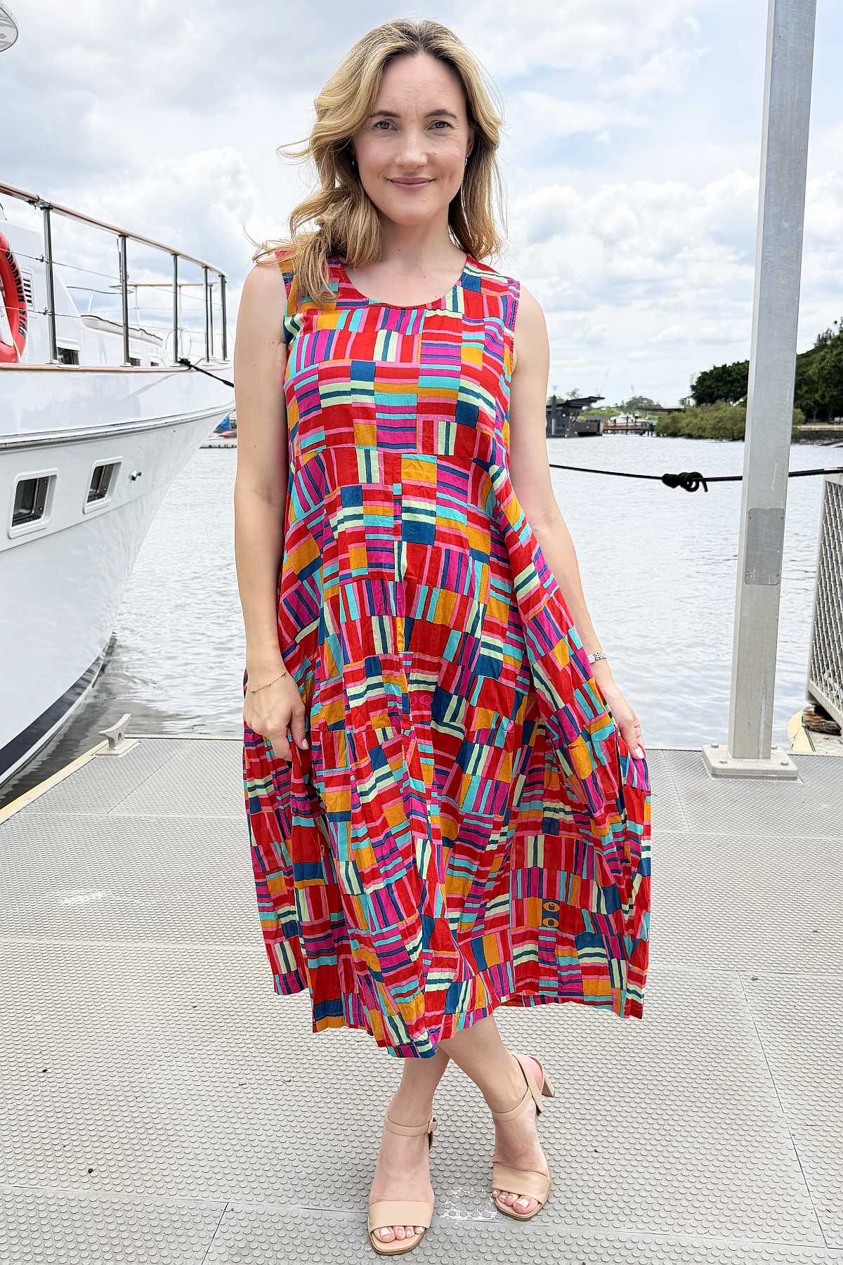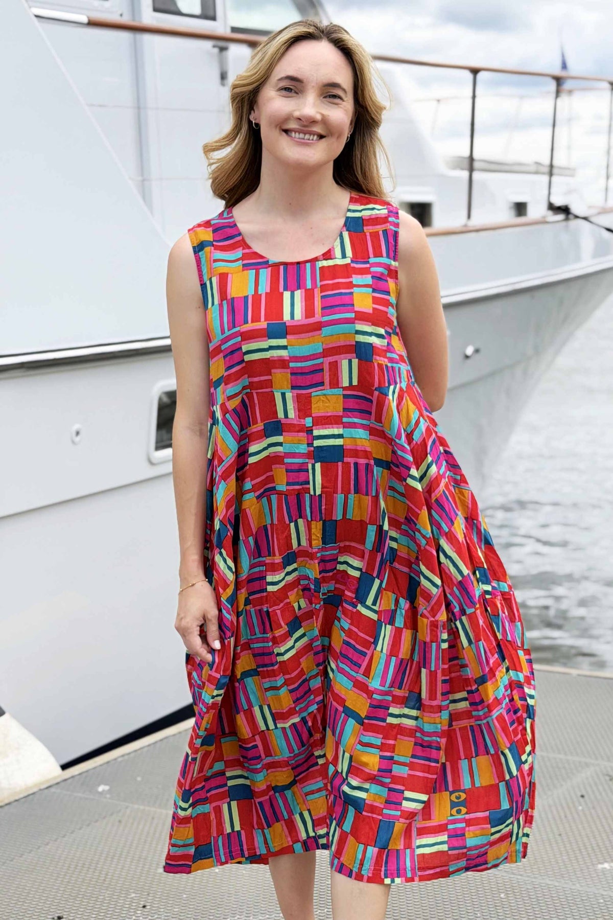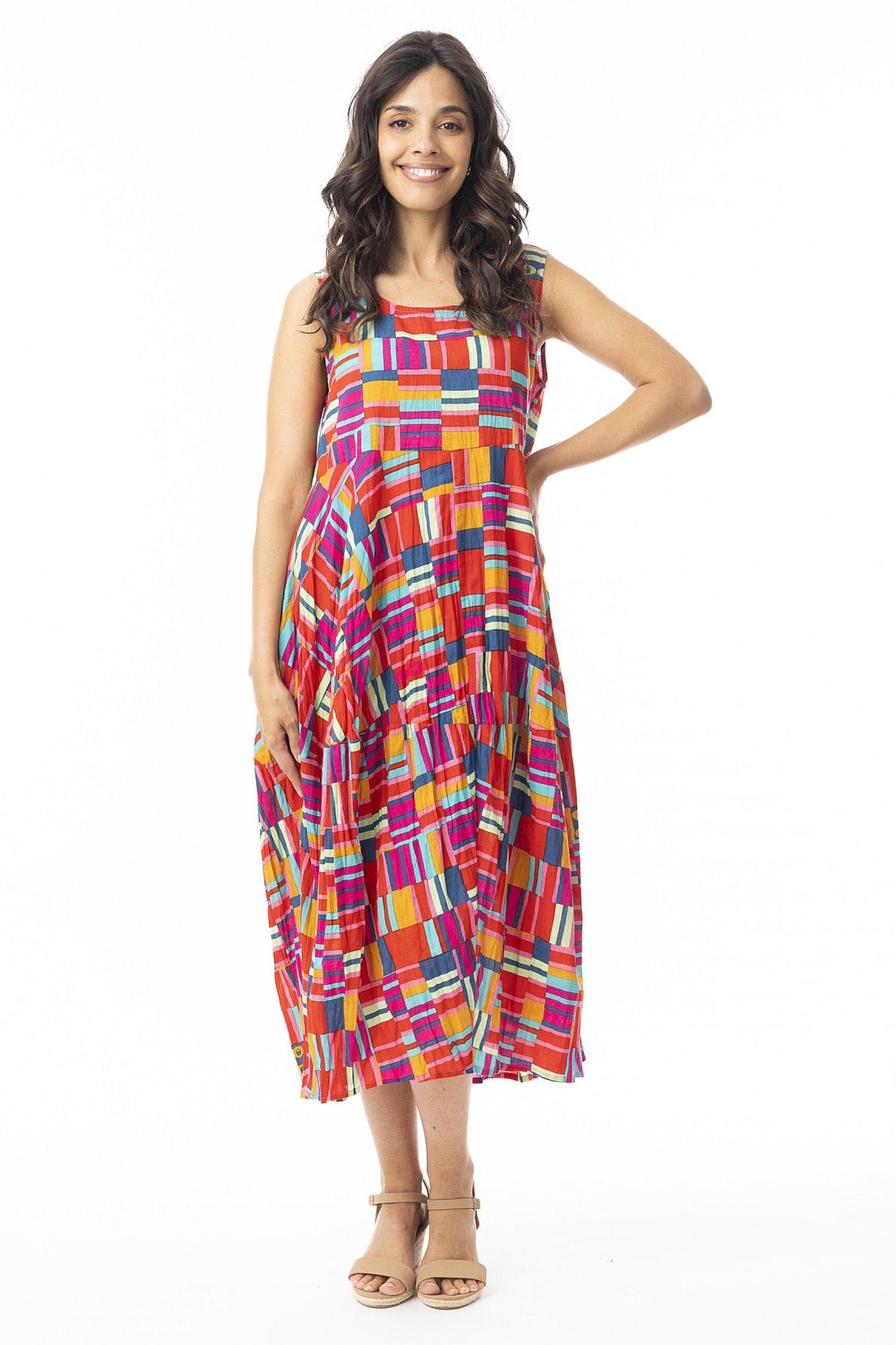 Regular price $129.00 Sale price $109.00The Peru Colourful Sleeveless Bubble Tunic Dress combines contemporary design with timeless comfort. Striking geometric lines burst with mustard yellow, coral, and blue hues, creating visual interest that complements any complexion. The relaxed bubble silhouette drapes gracefully to ankle length, offering a flattering fit for all body types without clinging to curves. A round neckline and functional pockets enhance its everyday versatility. Crafted from premium 100% organic cotton that's ethically sourced and made in India, this piece delivers both style and substance with a commitment to sustainable fashion.