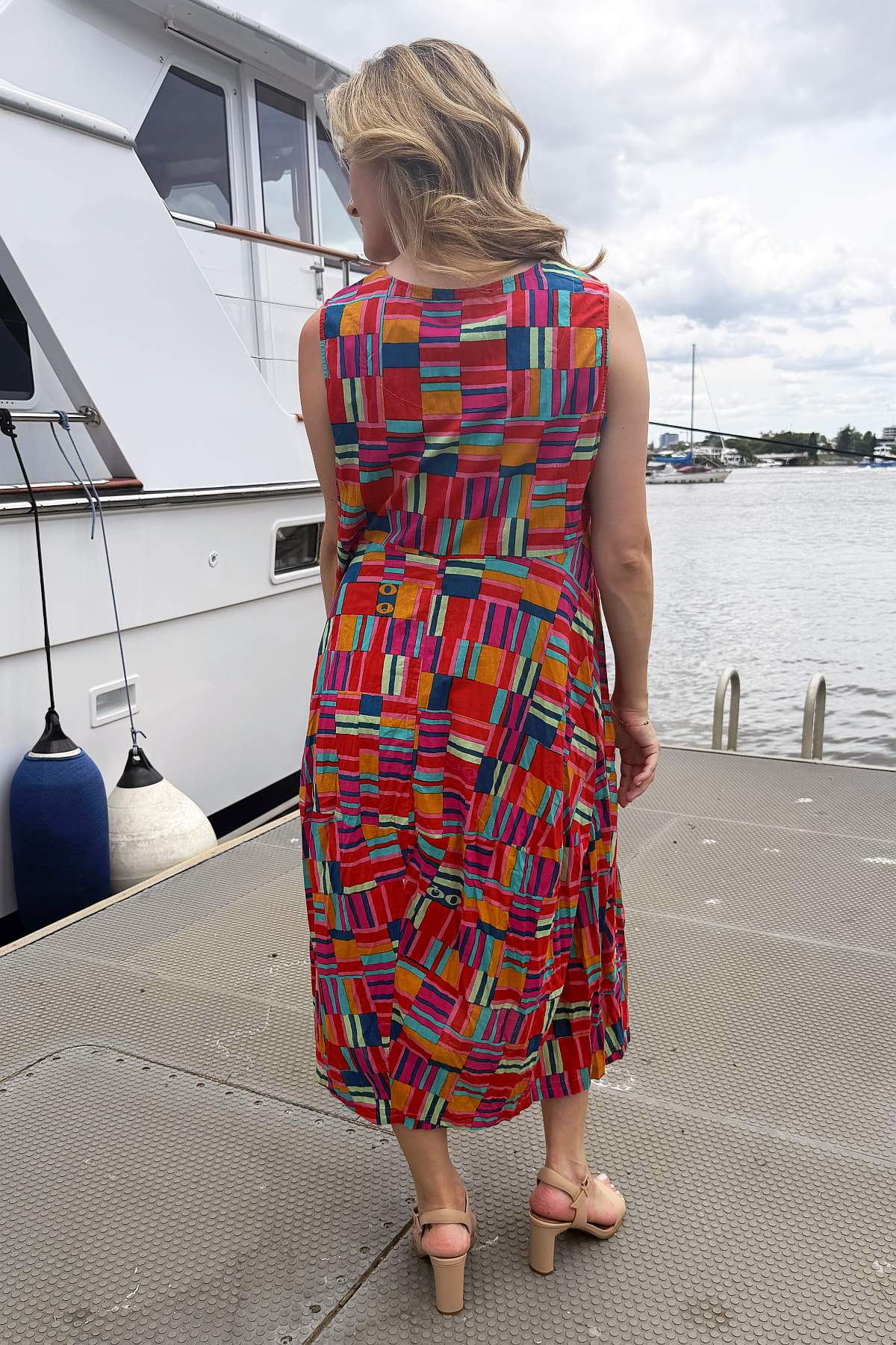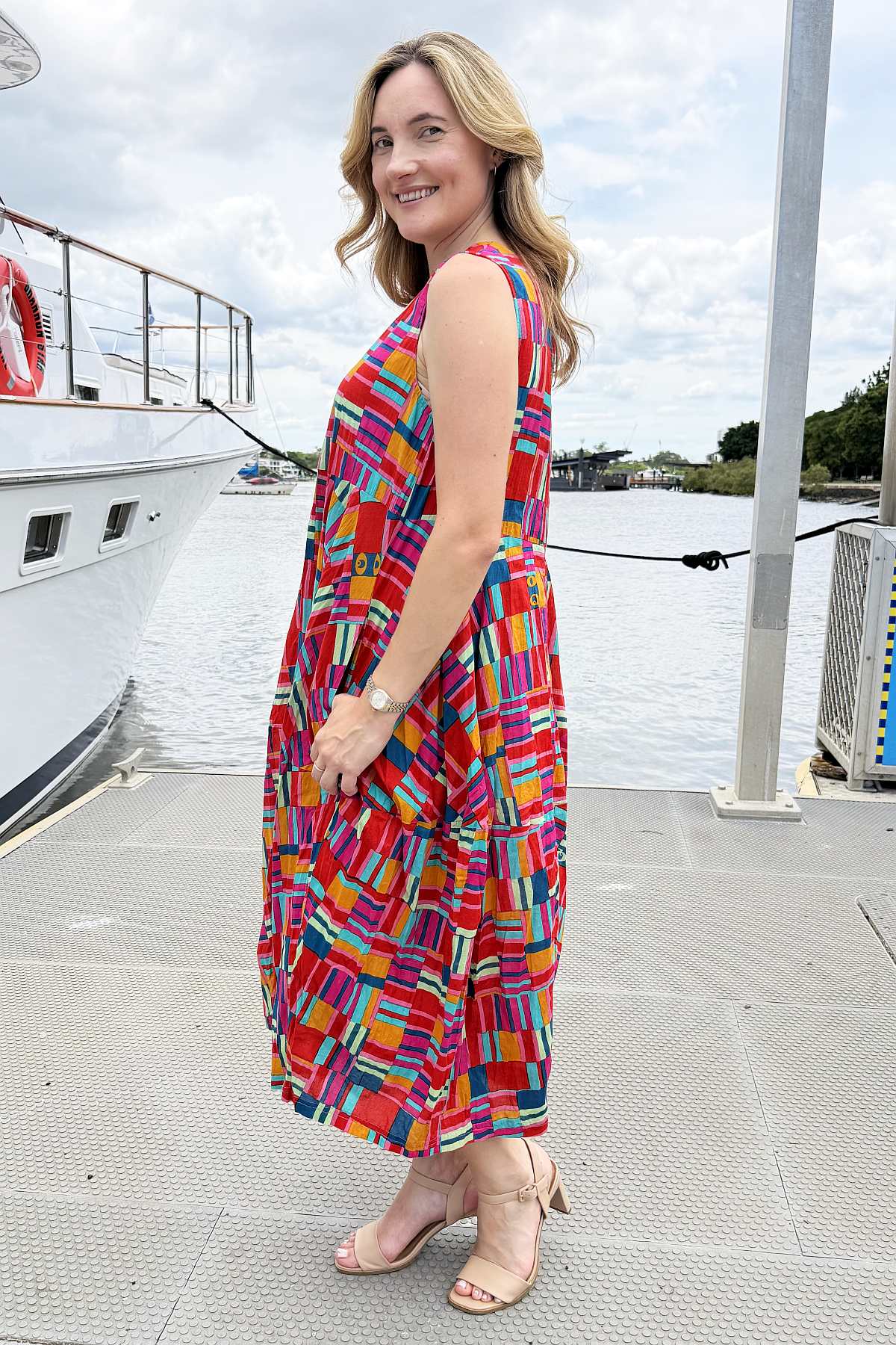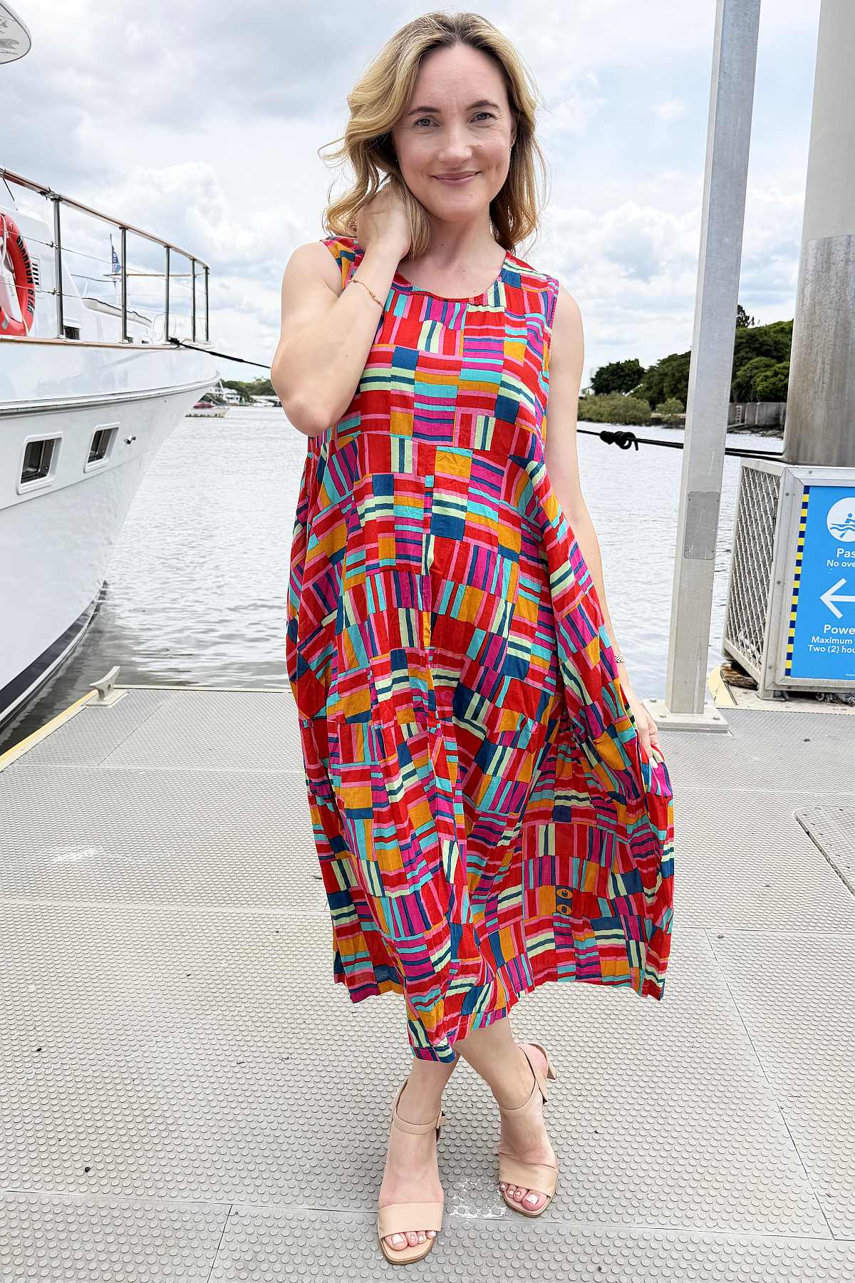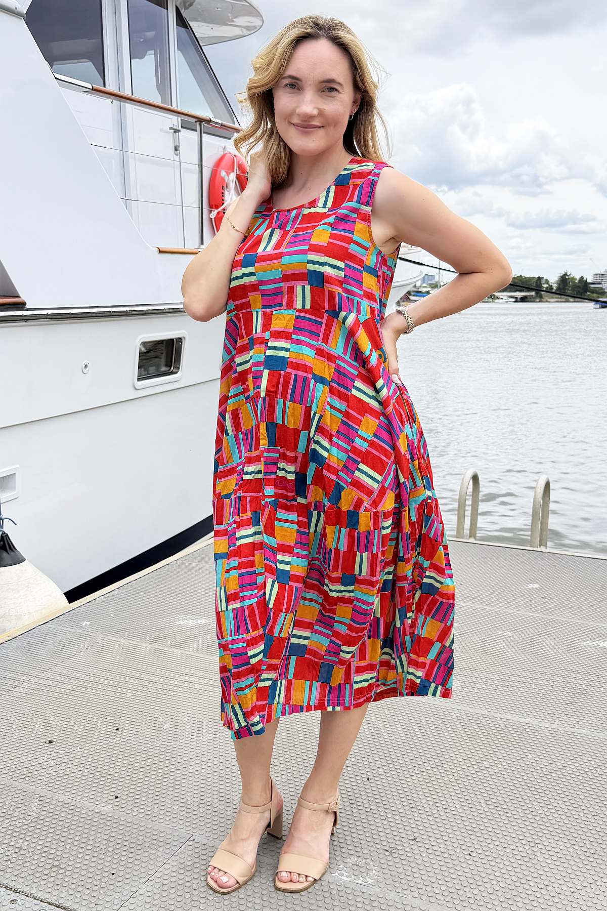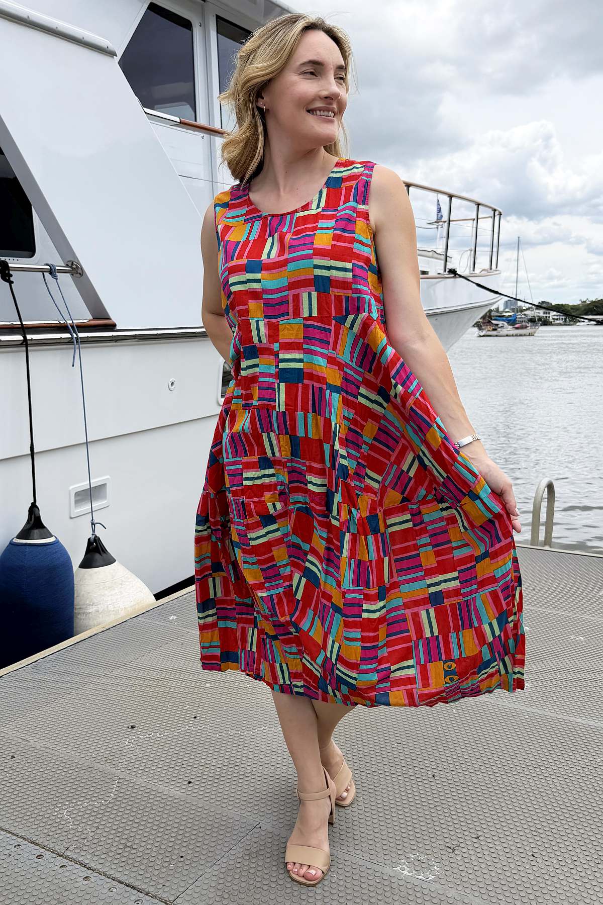 Regular price $129.00 Sale price $109.00The Peru Colourful Sleeveless Bubble Tunic Dress combines contemporary design with timeless comfort. Striking geometric lines burst with mustard yellow, coral, and blue hues, creating visual interest that complements any complexion. The relaxed bubble silhouette drapes gracefully to ankle length, offering a flattering fit for all body types without clinging to curves. A round neckline and functional pockets enhance its everyday versatility. Crafted from premium 100% organic cotton that's ethically sourced and made in India, this piece delivers both style and substance with a commitment to sustainable fashion.