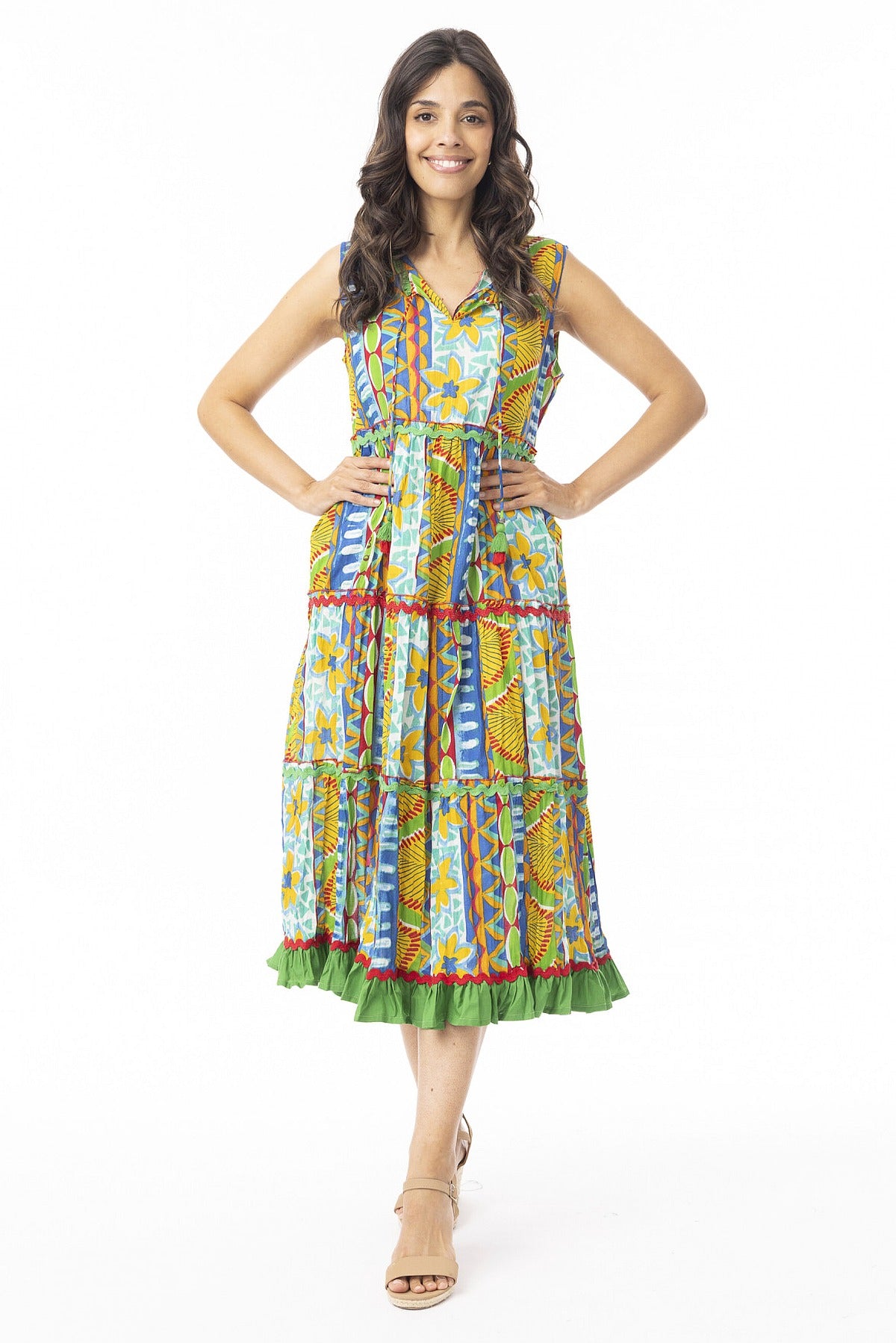 Regular price $129.00 Sale price $109.00The Ipanema Layers Sleeveless Tunic Dress combines effortless elegance with practical design. Crafted from 100% organic cotton ethically sourced and made in India, this piece features a captivating floral print in vibrant blues and greens. The versatile tie-neck design transitions from a refined boat neckline to a flattering V-neck, while the relaxed, flowing silhouette skims the body beautifully. Sleeveless and ankle-length, it's finished with functional pockets and a naturally crinkled fabric that resists wrinkles—ideal for travel and everyday wear. A sophisticated staple that moves seamlessly from season to season.