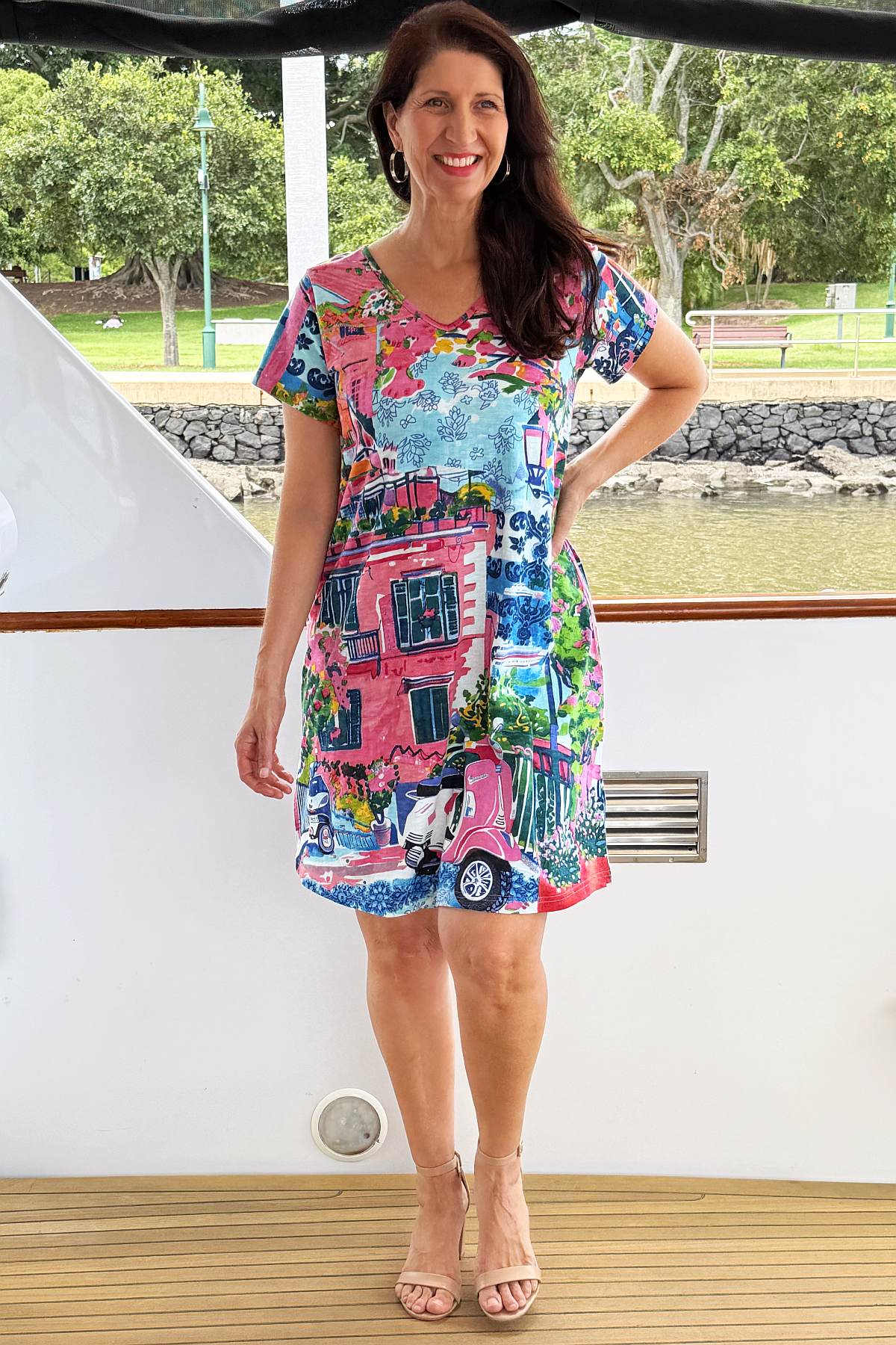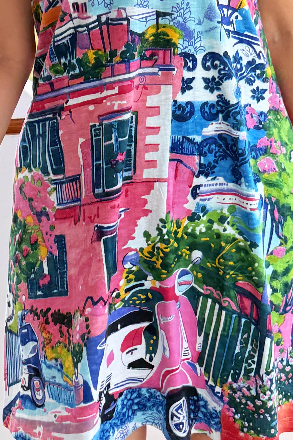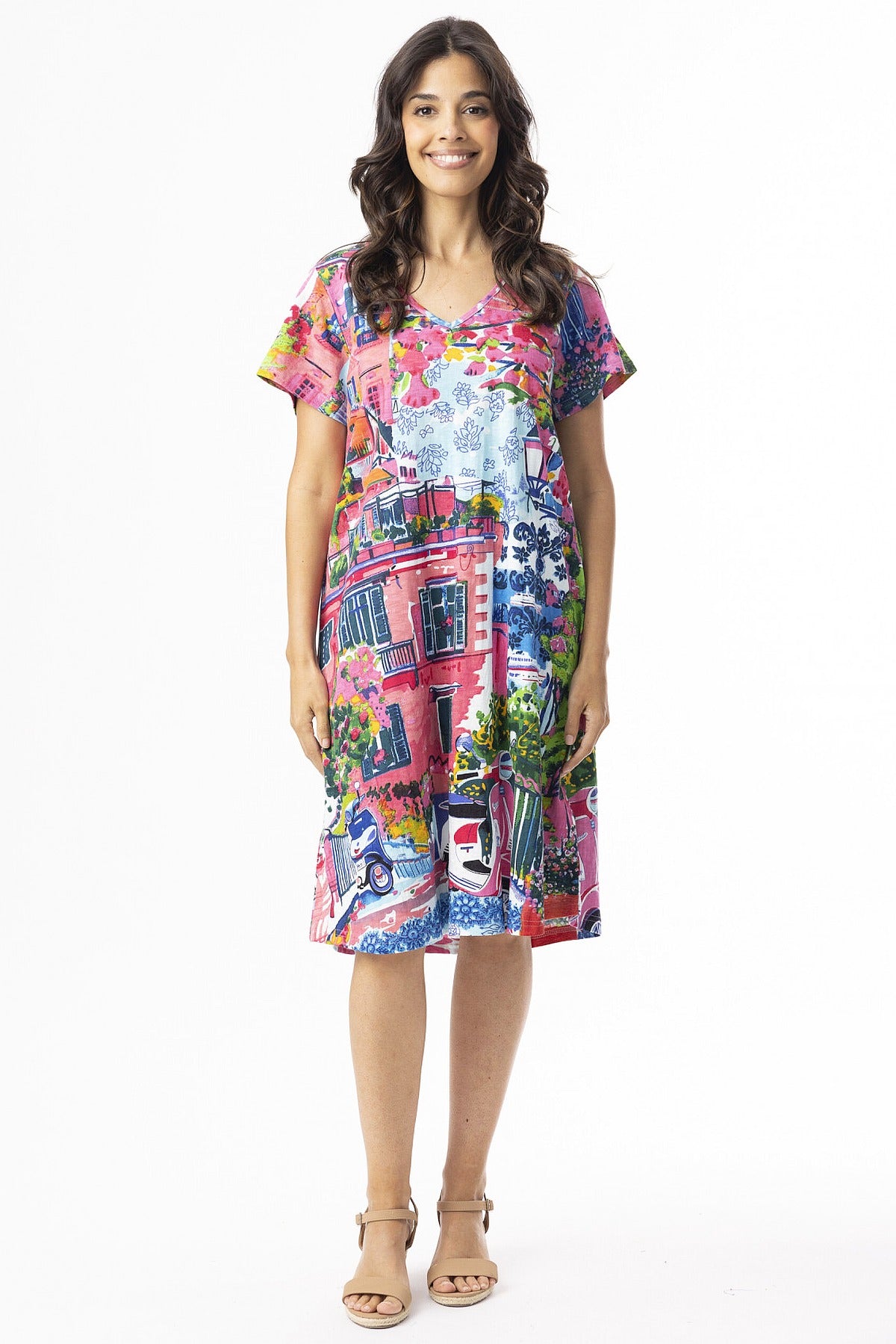 Elevate your everyday wardrobe with this contemporary tunic dress, featuring a vibrant print that captures attention with striking blue and pink hues. The flattering V neckline and relaxed, flowing silhouette create an effortlessly elegant look, while the knee-length cut offers versatile styling options. Crafted from 100% ethically sourced organic cotton with wrinkle-resistant properties, this piece maintains its polished appearance with minimal effort—ideal for travel or busy lifestyles. Short sleeves provide comfortable, season-appropriate wear for any occasion.