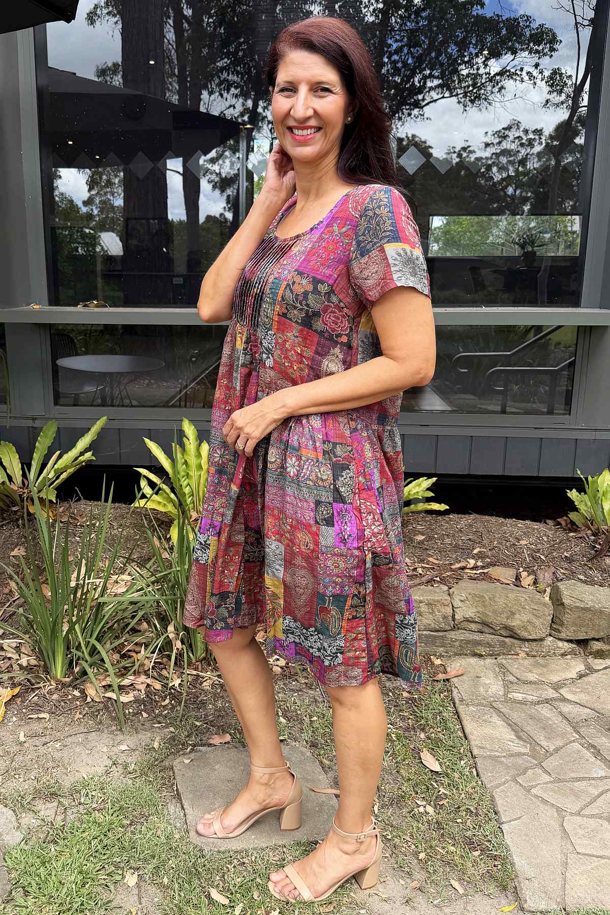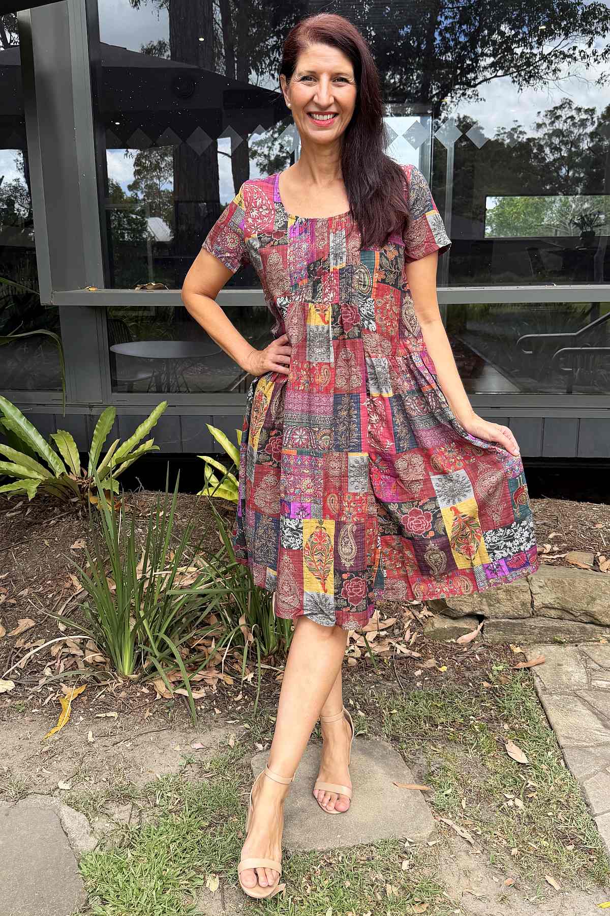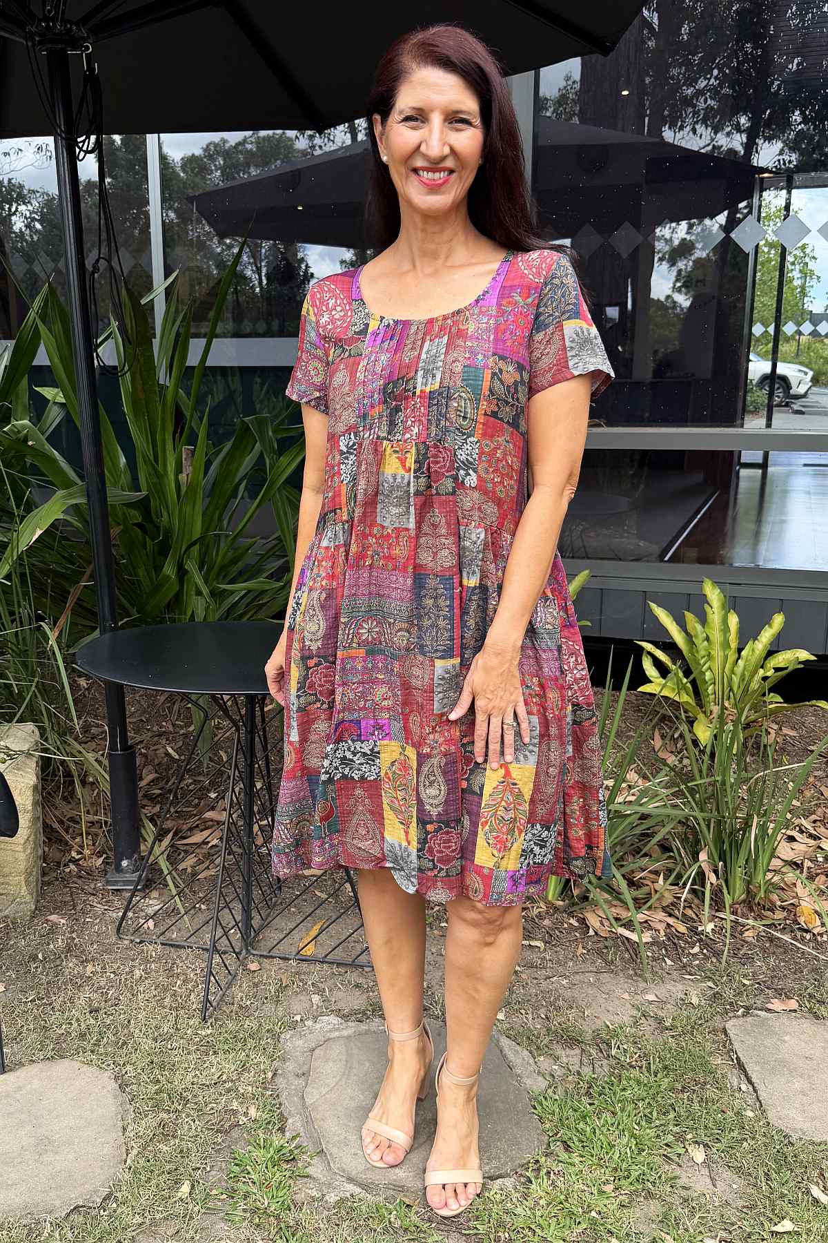 Embrace effortless elegance with this multicolour paisley tunic dress, where vibrant reds and golds dance across a patchwork canvas. Crafted from a breathable cotton-rayon blend, this summer essential features a flattering A-line silhouette enhanced by pintuck pleats at the bust—offering both graceful movement and refined visual appeal. The scoop neckline and short sleeves provide understated sophistication, while the knee-length hem strikes the perfect balance between casual and polished. Each piece showcases a unique print variation, making it distinctly yours.