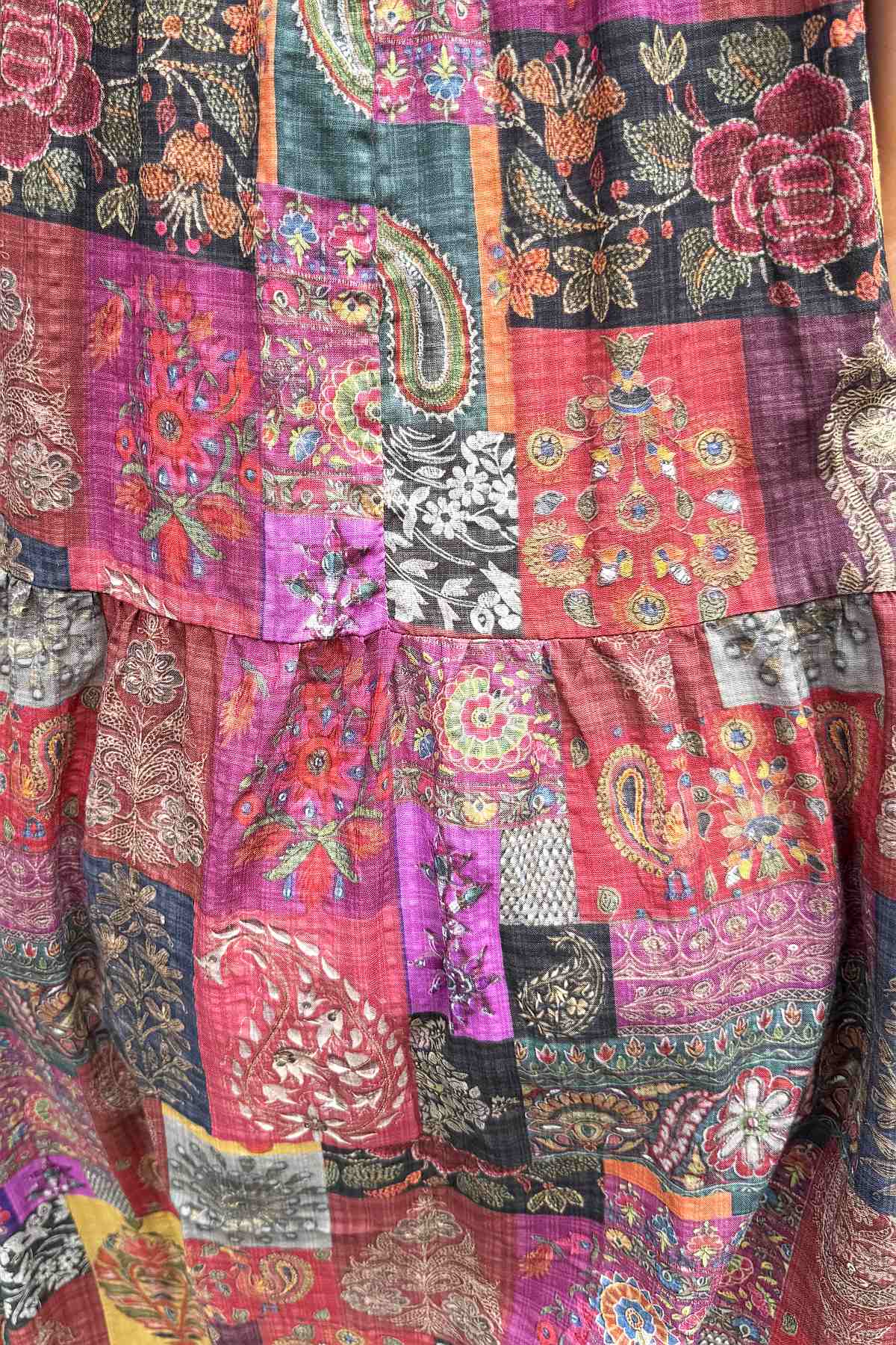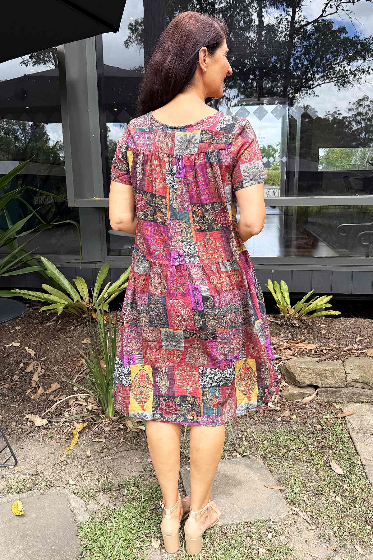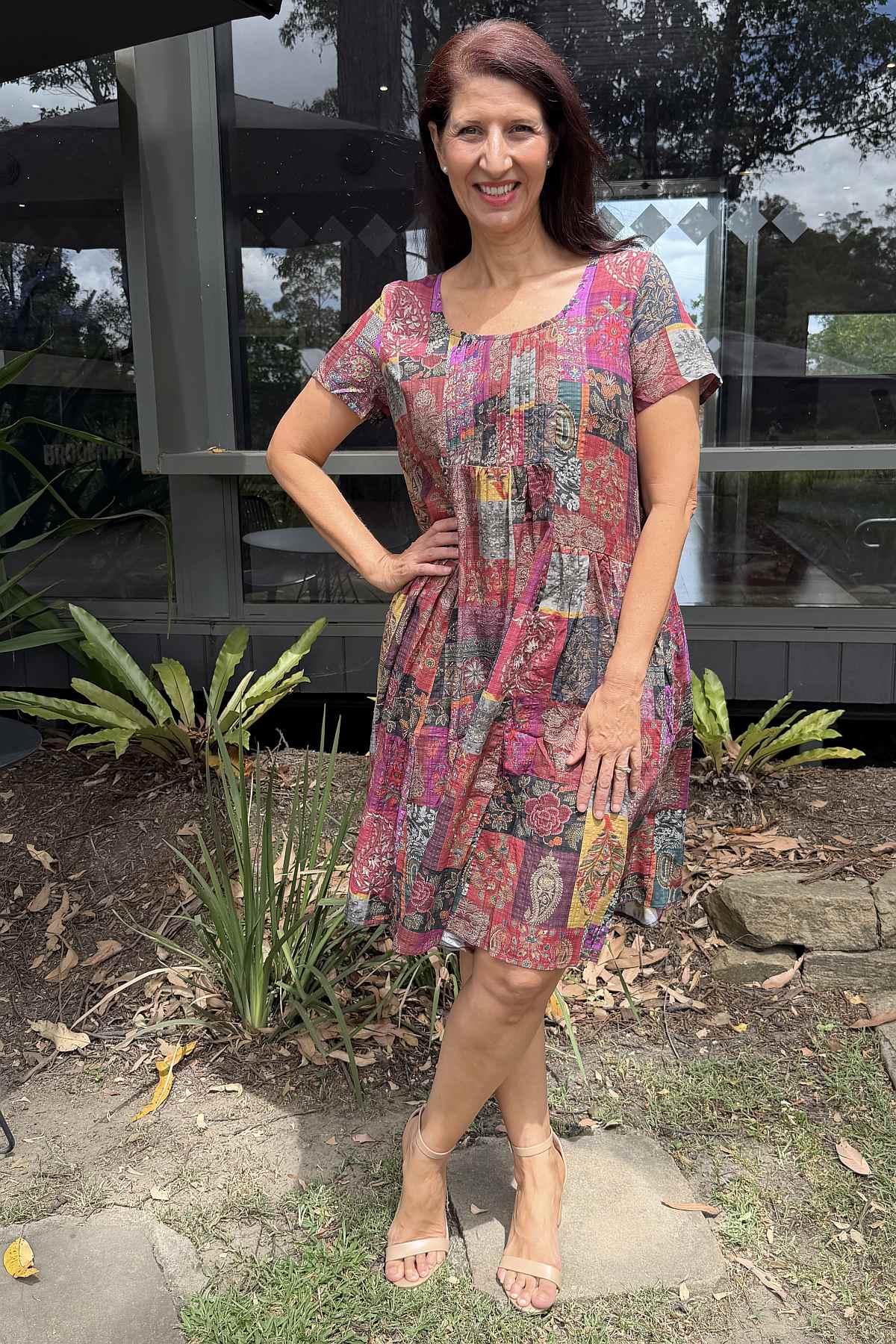 Embrace effortless elegance with this multicolour paisley tunic dress, where vibrant reds and golds dance across a patchwork canvas. Crafted from a breathable cotton-rayon blend, this summer essential features a flattering A-line silhouette enhanced by pintuck pleats at the bust—offering both graceful movement and refined visual appeal. The scoop neckline and short sleeves provide understated sophistication, while the knee-length hem strikes the perfect balance between casual and polished. Each piece showcases a unique print variation, making it distinctly yours.