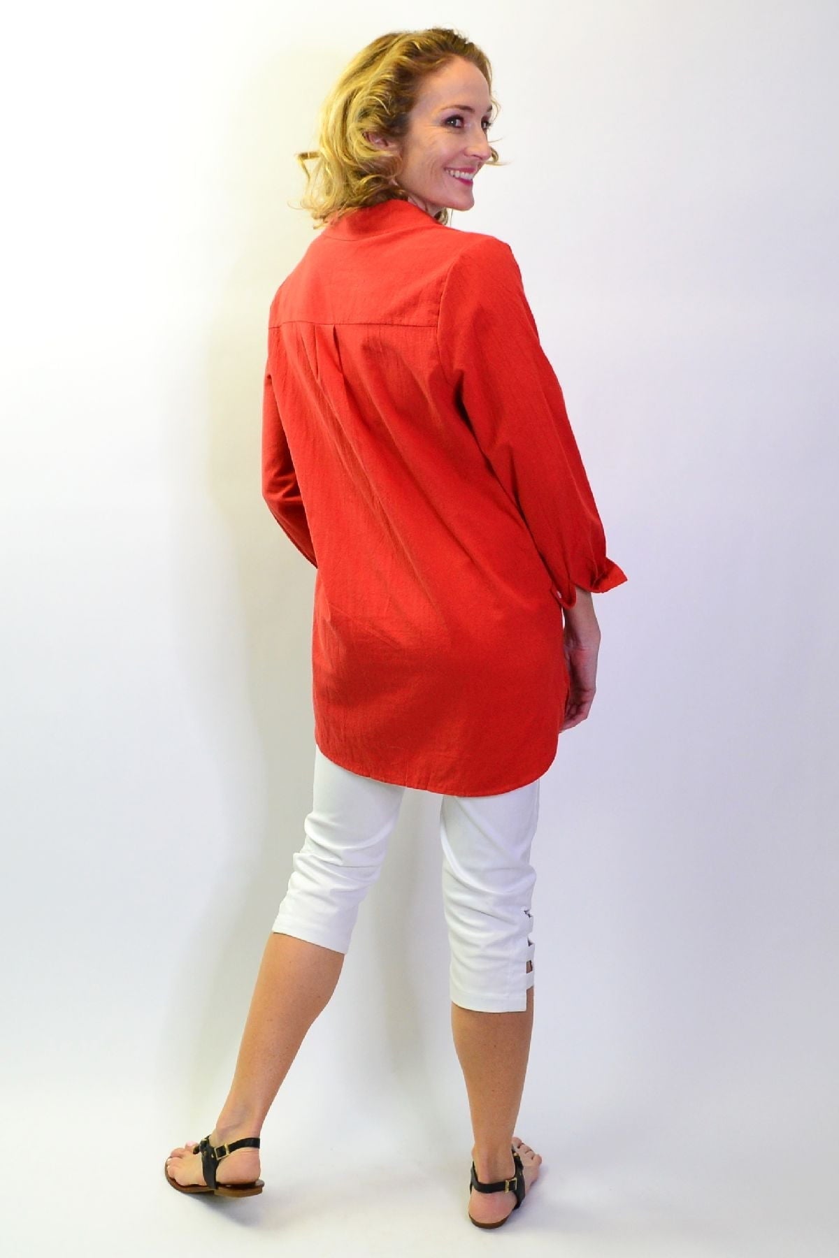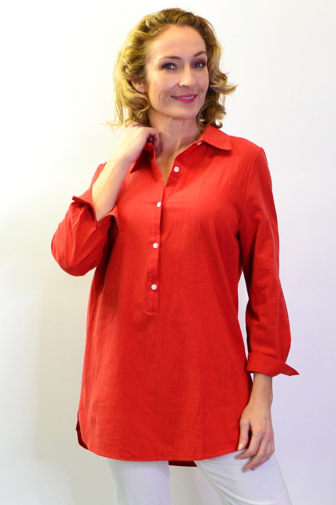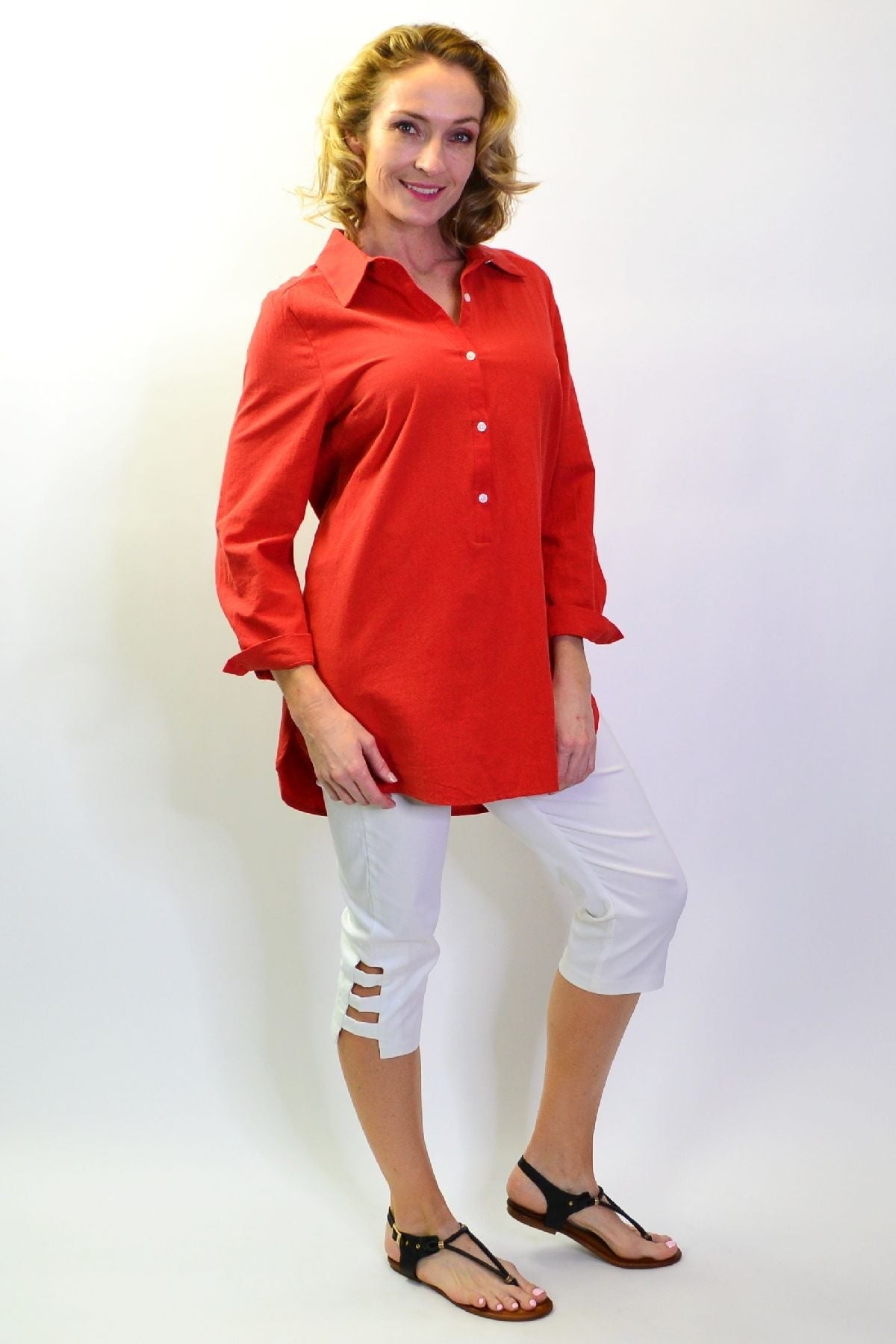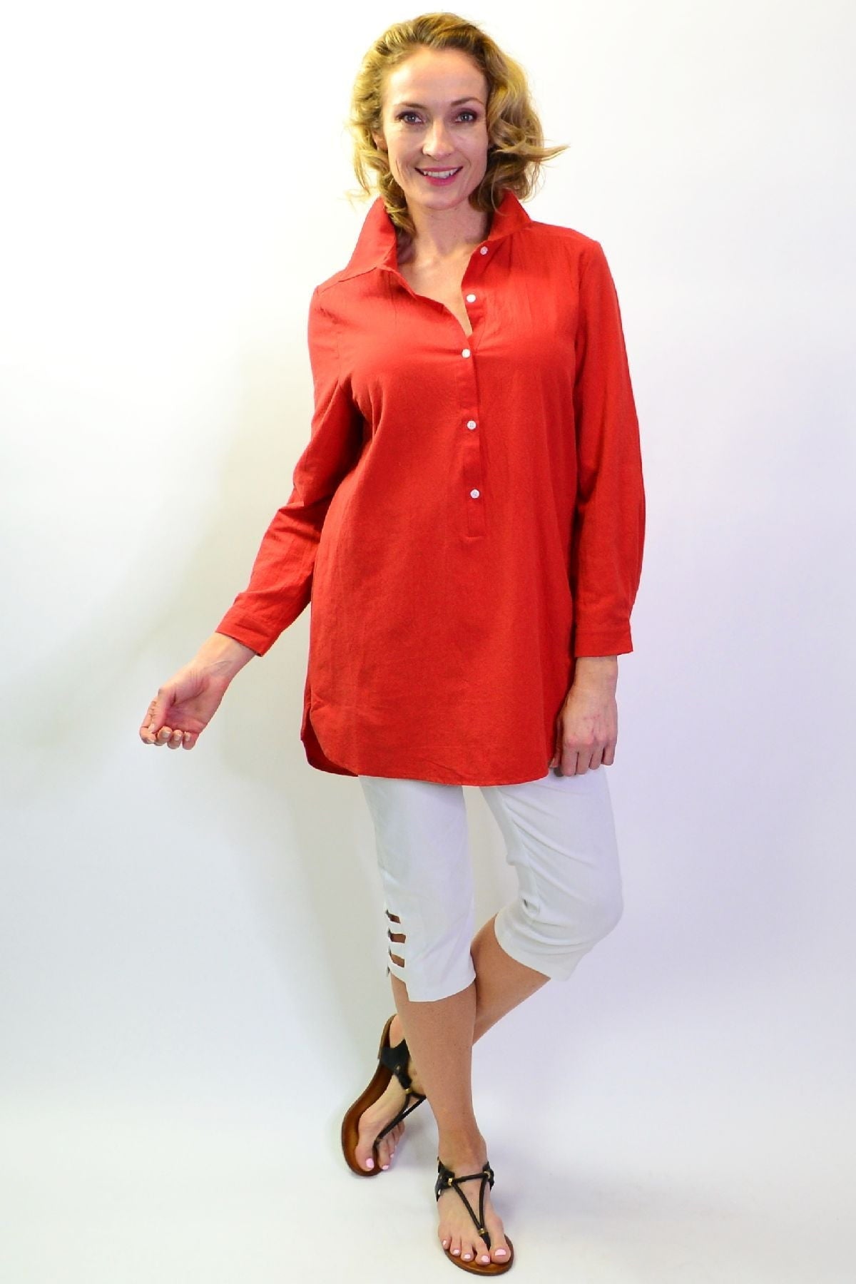 Regular price $59.99 Sale price $49.99This cool and casual Burnt Orange Elegant Button up Shirt is made in a cotton fabric that is easy to wear. It features 3/4 sleeves with a button up cuffs, rounded hem, buttons though to waist with a back tuck and a classic shirt collar. Wear it with leggings or with a sun hat as a beach cover up