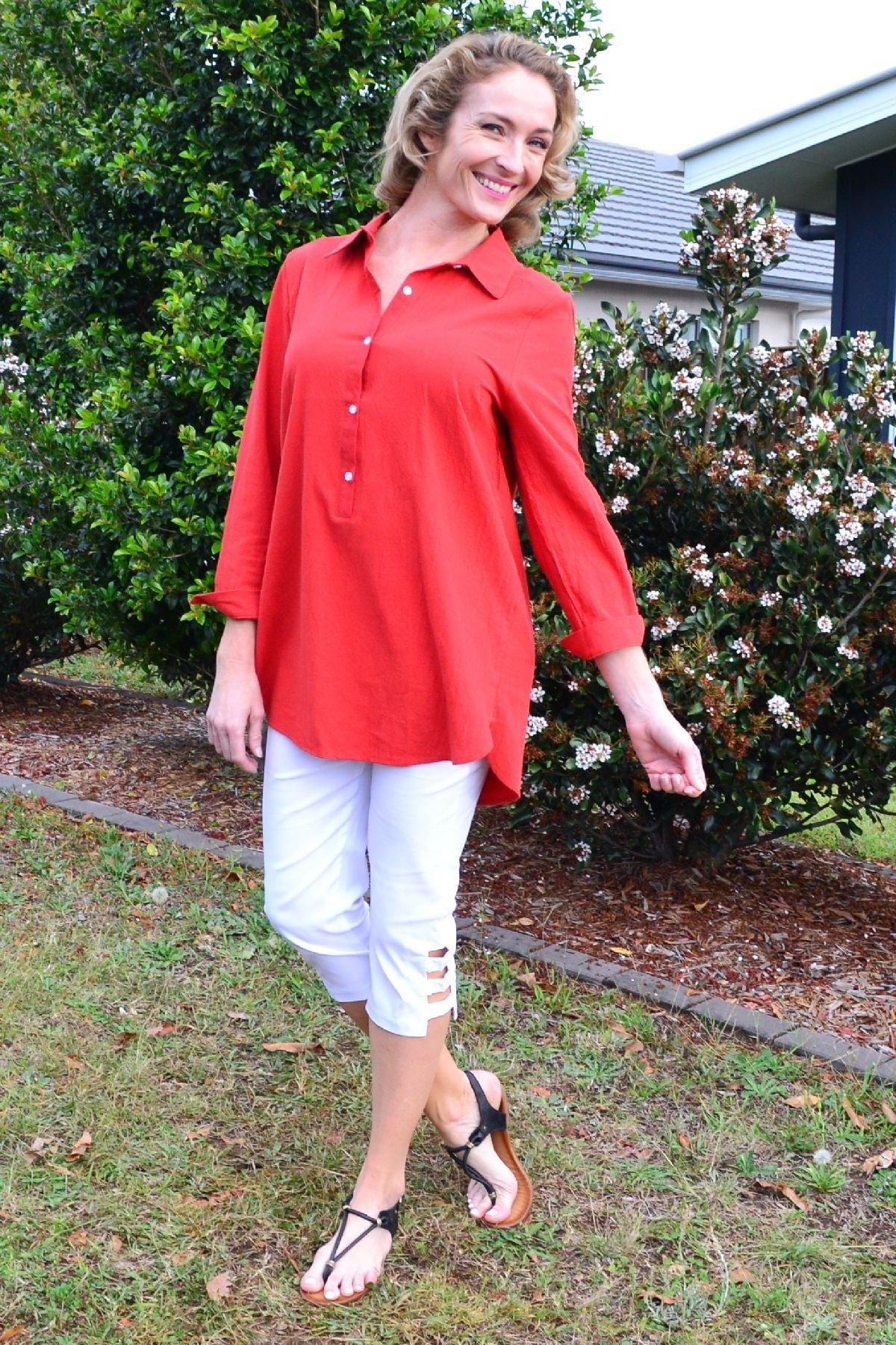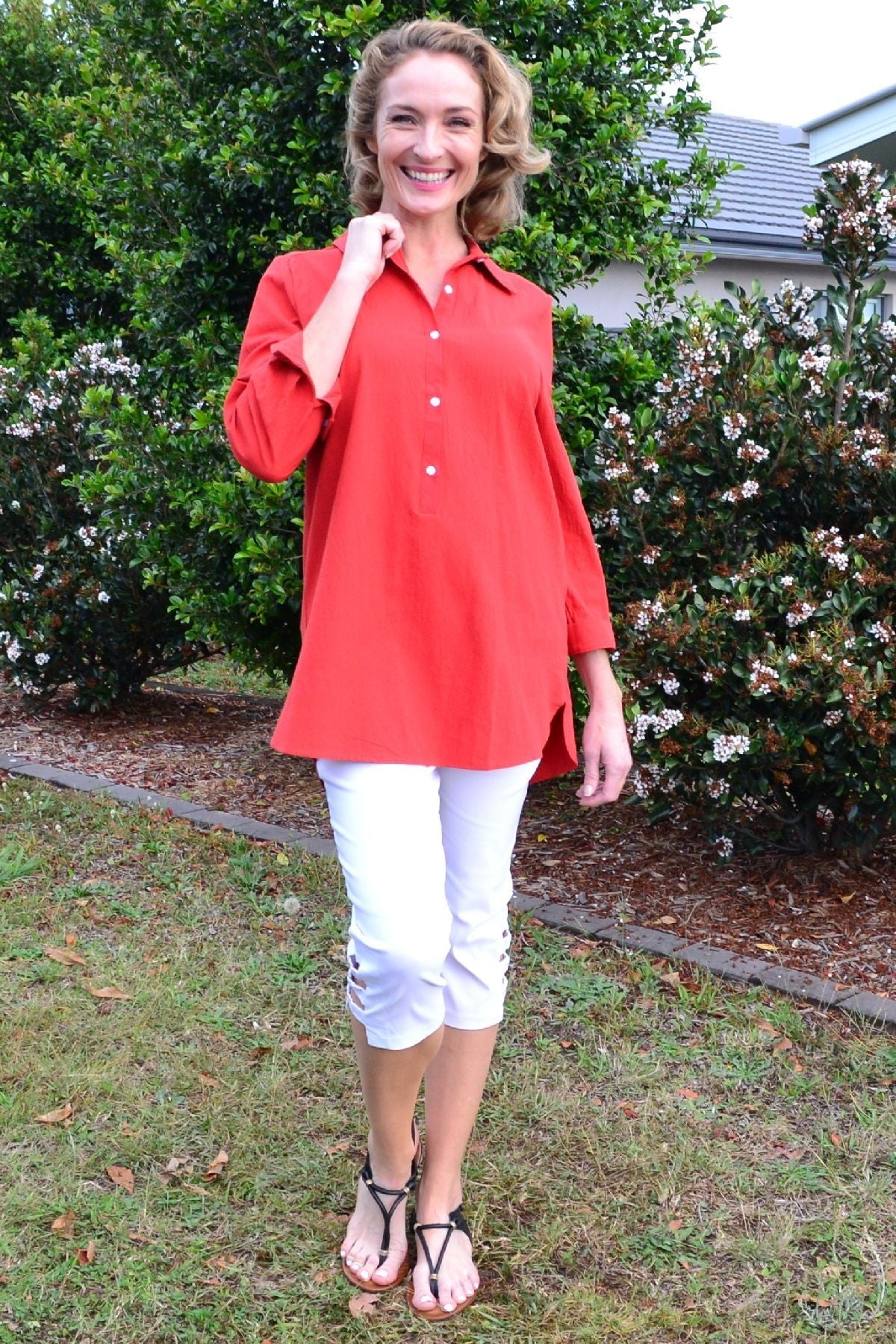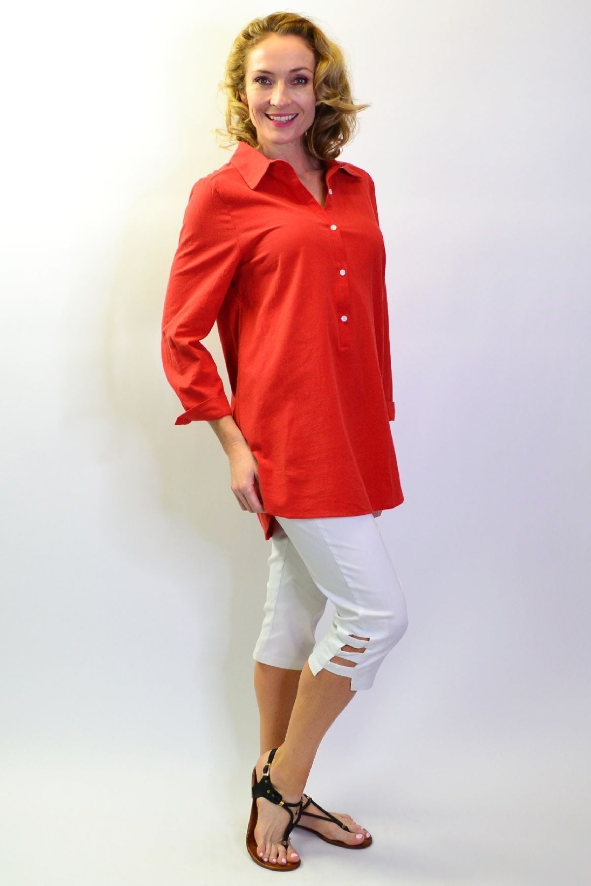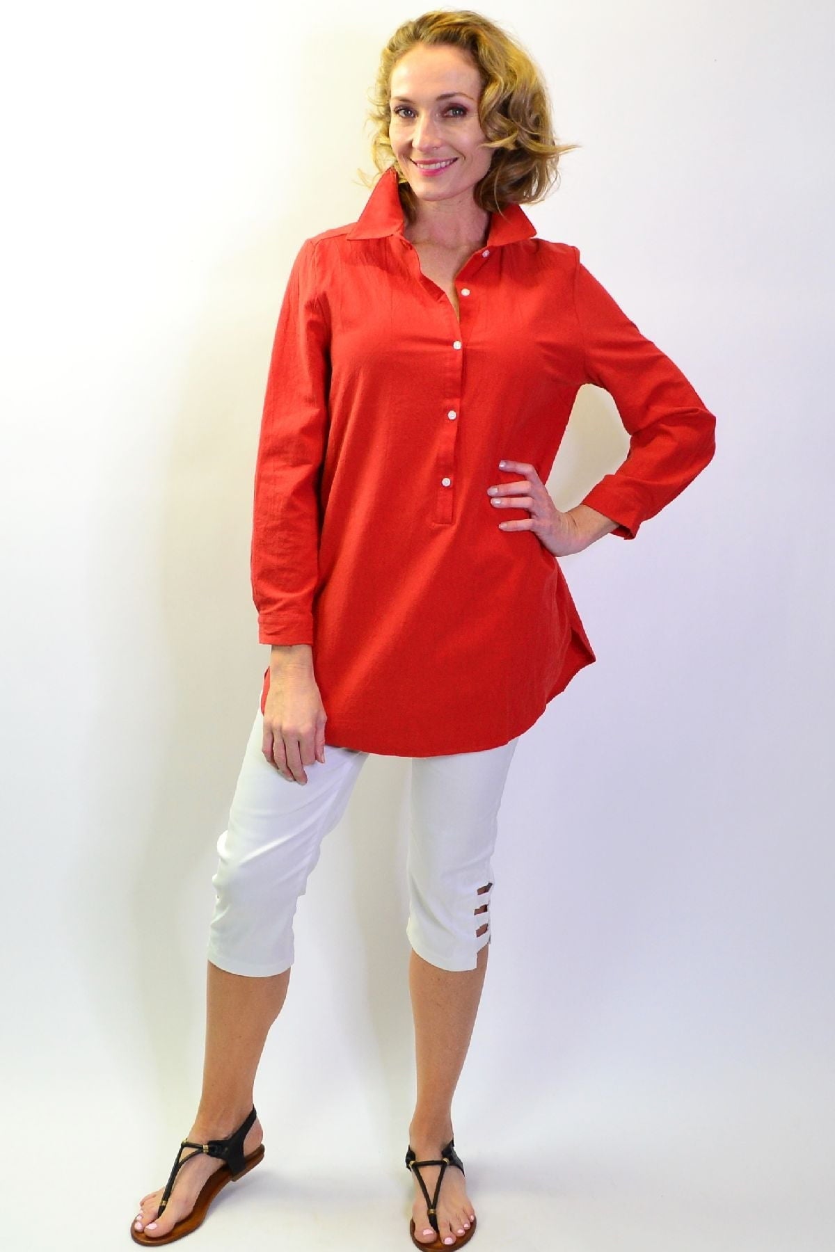Regular price $59.99 Sale price $49.99This cool and casual Burnt Orange Elegant Button up Shirt is made in a cotton fabric that is easy to wear. It features 3/4 sleeves with a button up cuffs, rounded hem, buttons though to waist with a back tuck and a classic shirt collar. Wear it with leggings or with a sun hat as a beach cover up