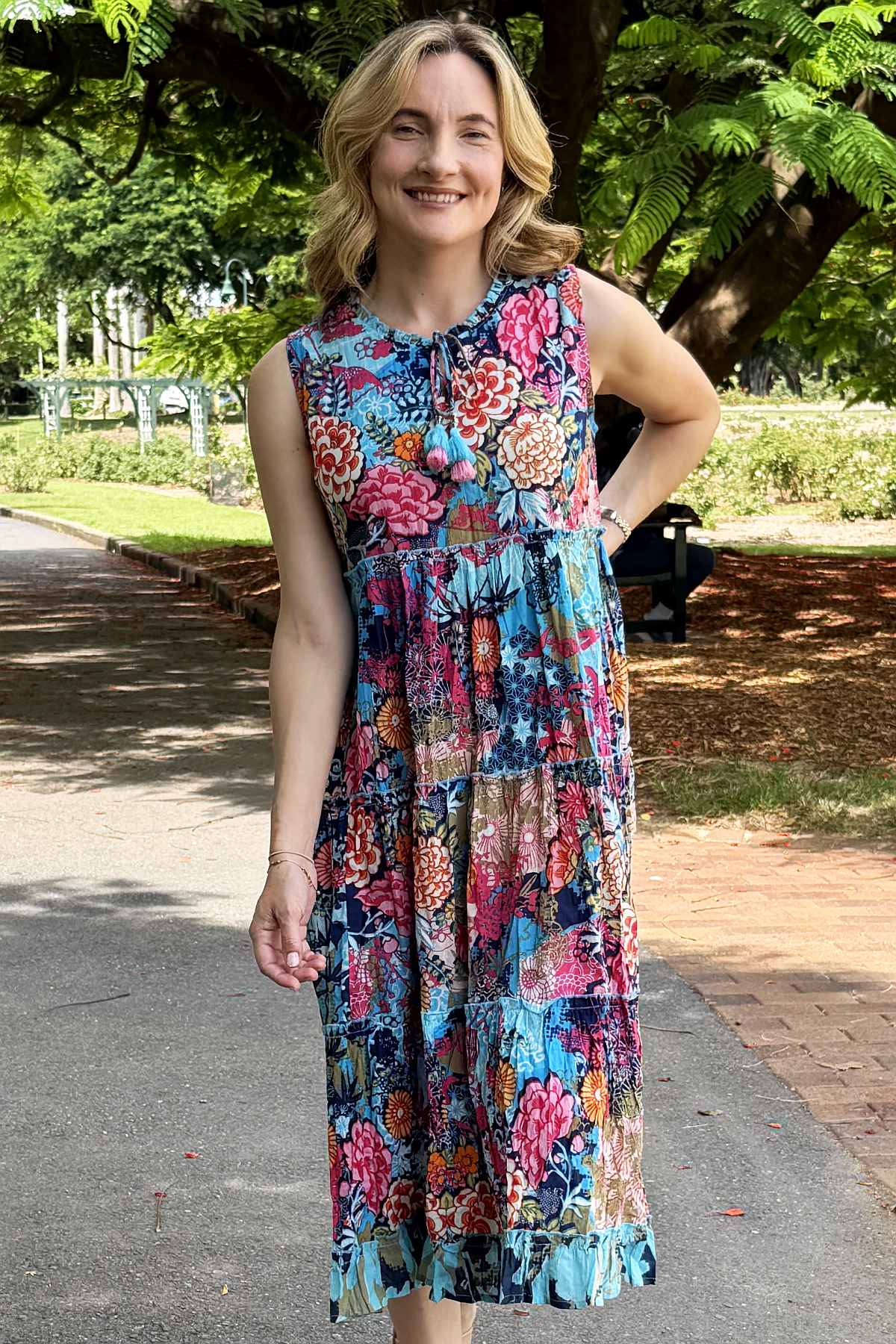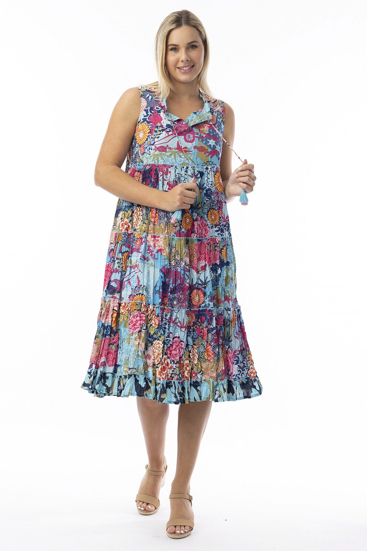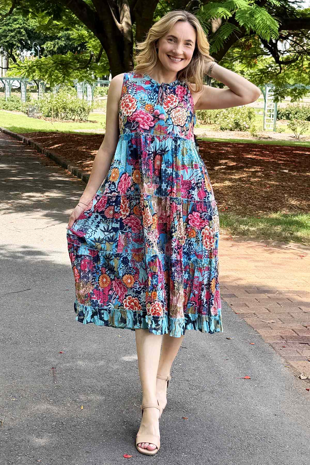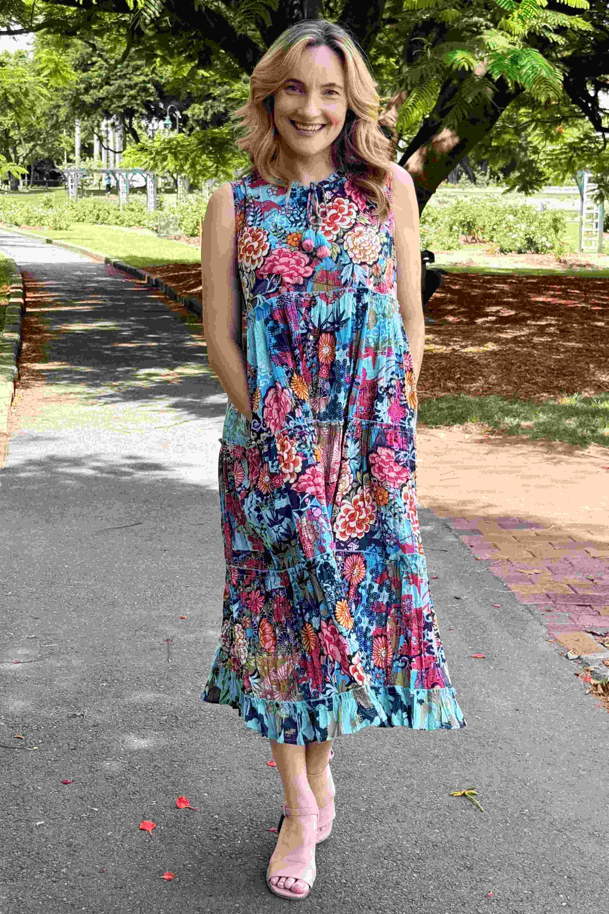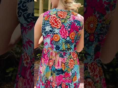 Regular price $129.00 Sale price $109.00The Ikebana Layered Sleeveless Tunic Dress combines effortless elegance with vibrant style. Featuring a striking floral print in rich blues and pinks, this piece showcases a versatile tie neckline that transitions from a refined boat neck to a flattering V-neck. Crafted from 100% organic cotton ethically sourced and made in India, the naturally crinkled fabric requires minimal care while remaining travel-friendly. The relaxed, flowing silhouette skims the body beautifully, landing at the ankle, while practical pockets add everyday functionality. Perfect for layering or wearing solo, this sophisticated tunic effortlessly elevates any wardrobe.