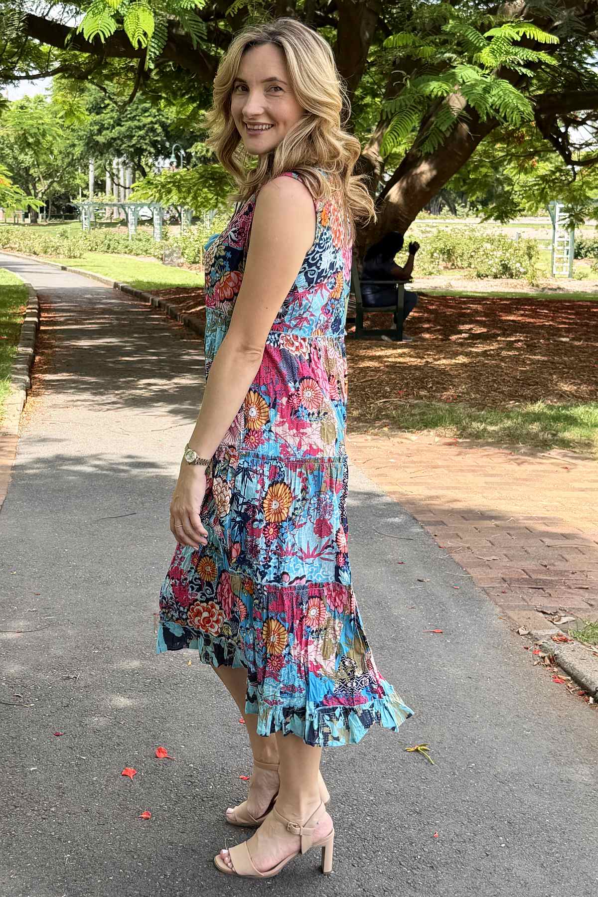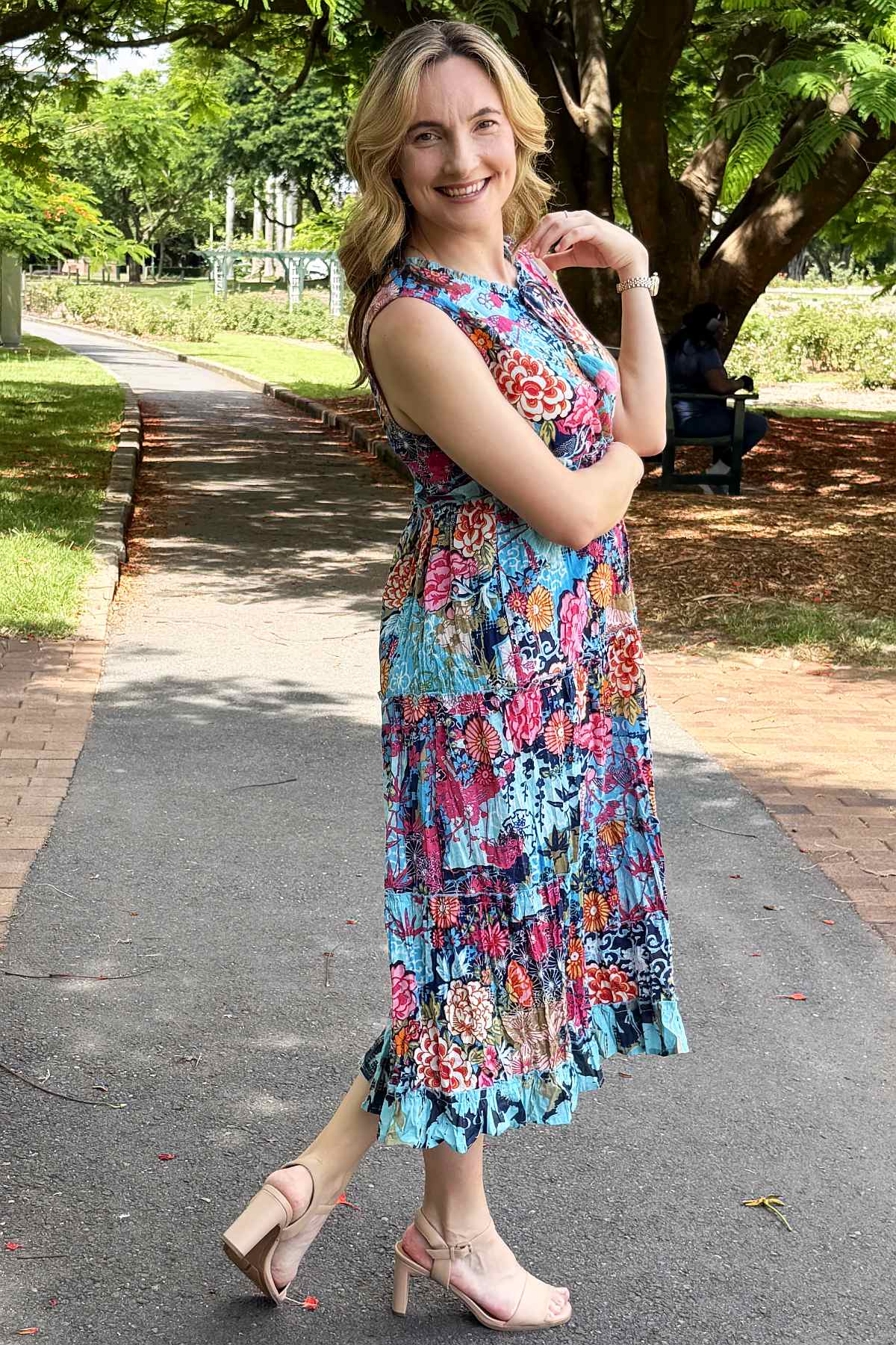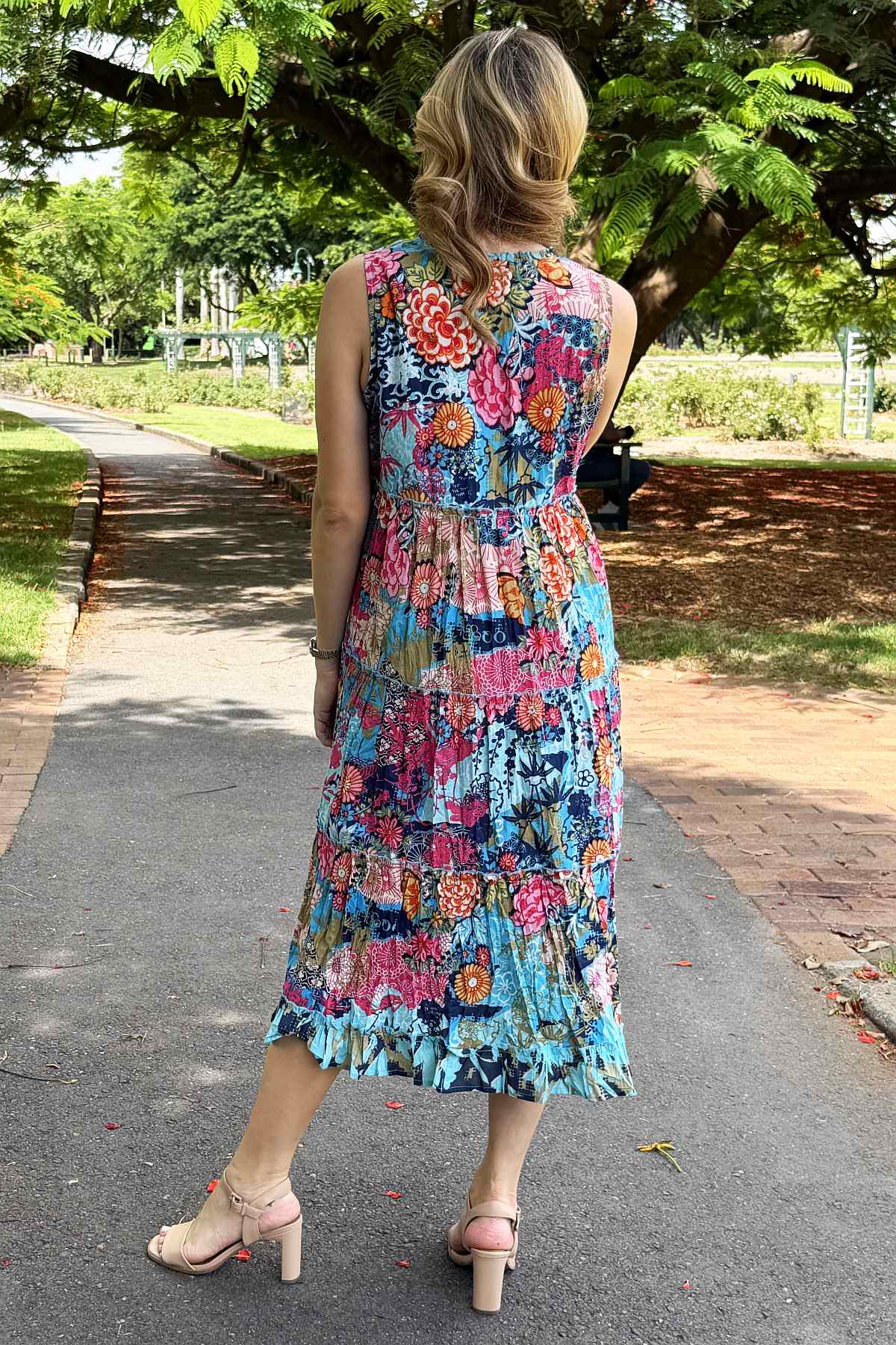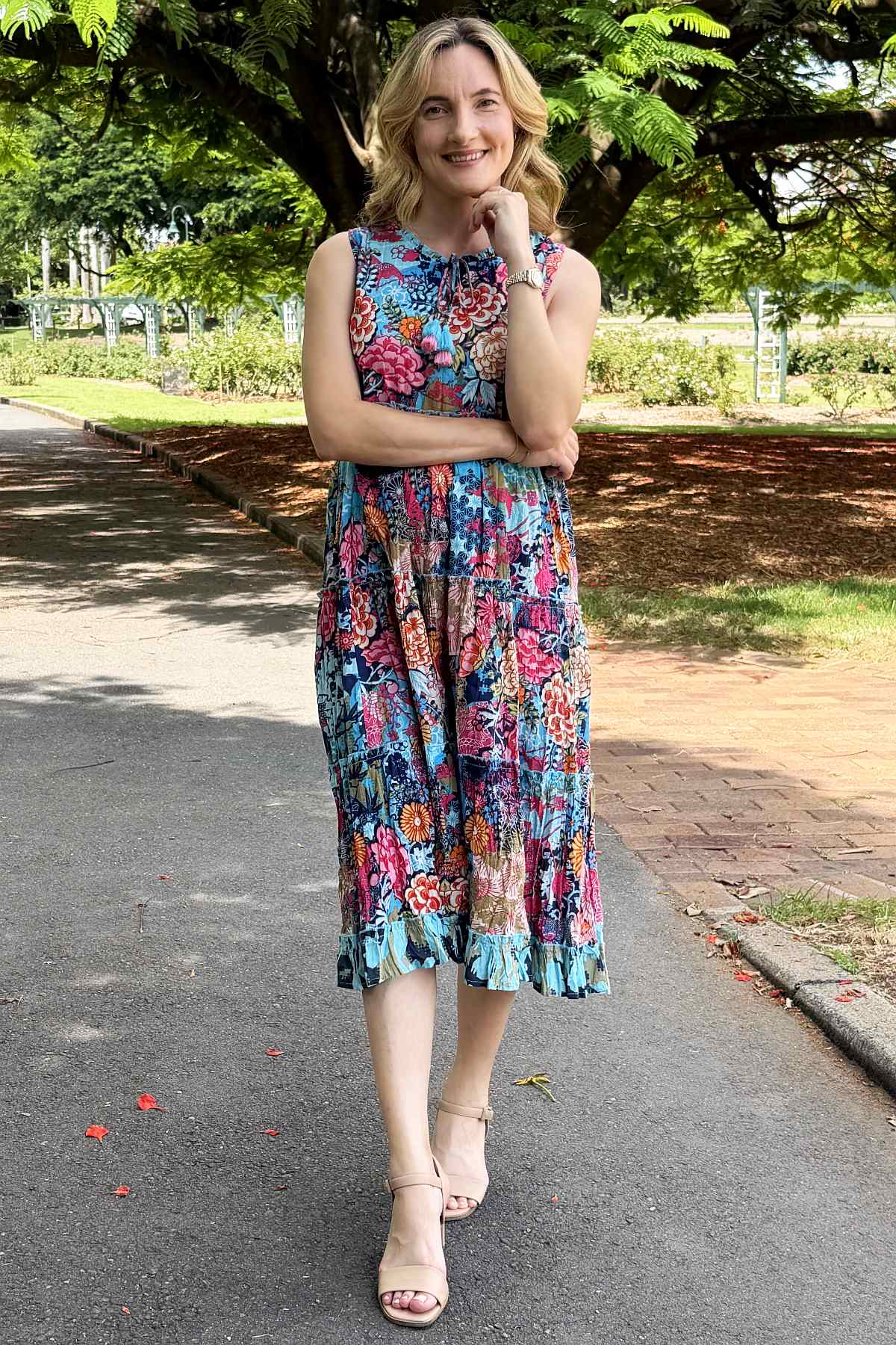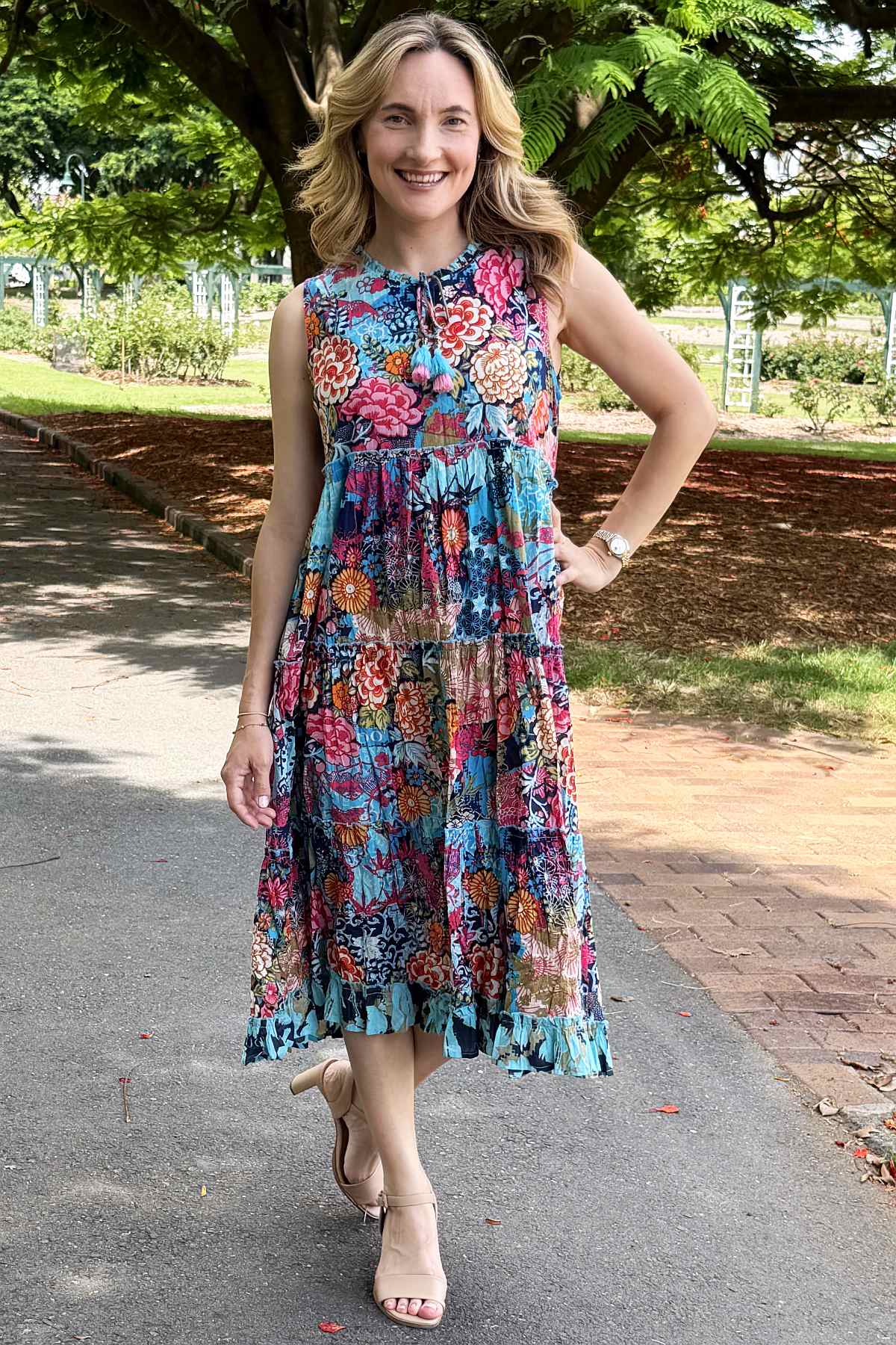 Regular price $129.00 Sale price $109.00The Ikebana Layered Sleeveless Tunic Dress combines effortless elegance with vibrant style. Featuring a striking floral print in rich blues and pinks, this piece showcases a versatile tie neckline that transitions from a refined boat neck to a flattering V-neck. Crafted from 100% organic cotton ethically sourced and made in India, the naturally crinkled fabric requires minimal care while remaining travel-friendly. The relaxed, flowing silhouette skims the body beautifully, landing at the ankle, while practical pockets add everyday functionality. Perfect for layering or wearing solo, this sophisticated tunic effortlessly elevates any wardrobe.