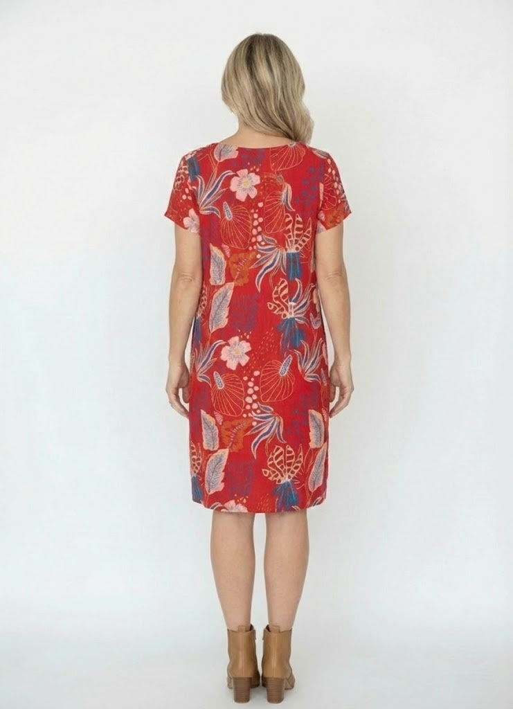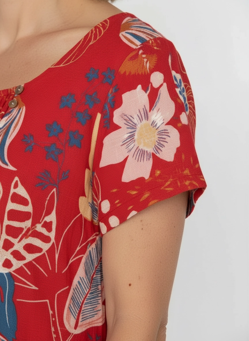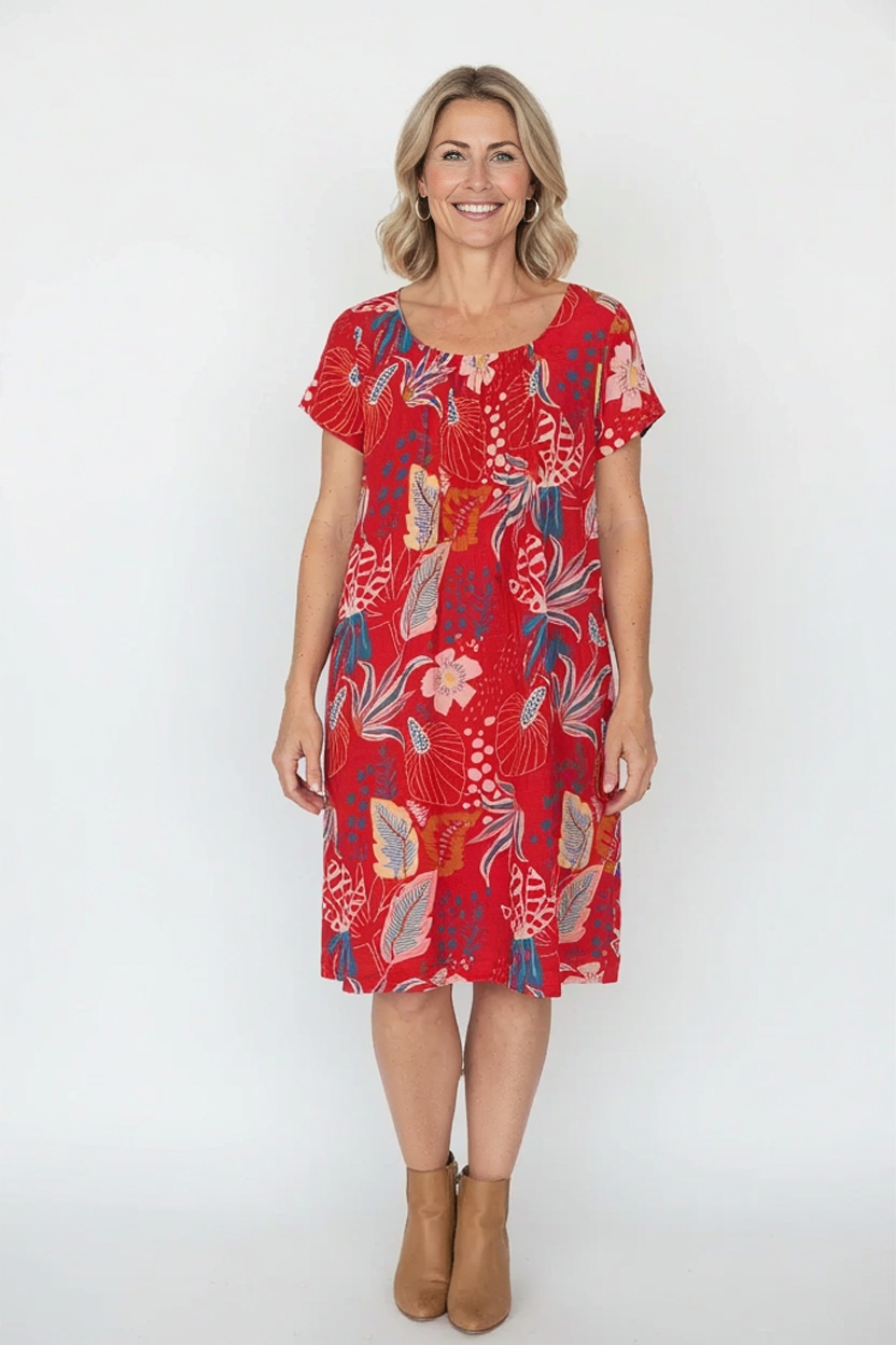 Regular price $59.99This beautiful dress is all about easy summer charm. Set against a vibrant red background, the colourful floral petal print really comes to life, with blue and pink tones standing out in the most eye-catching way. It’s bright, cheerful and perfect for days when you want to feel fresh and confident.