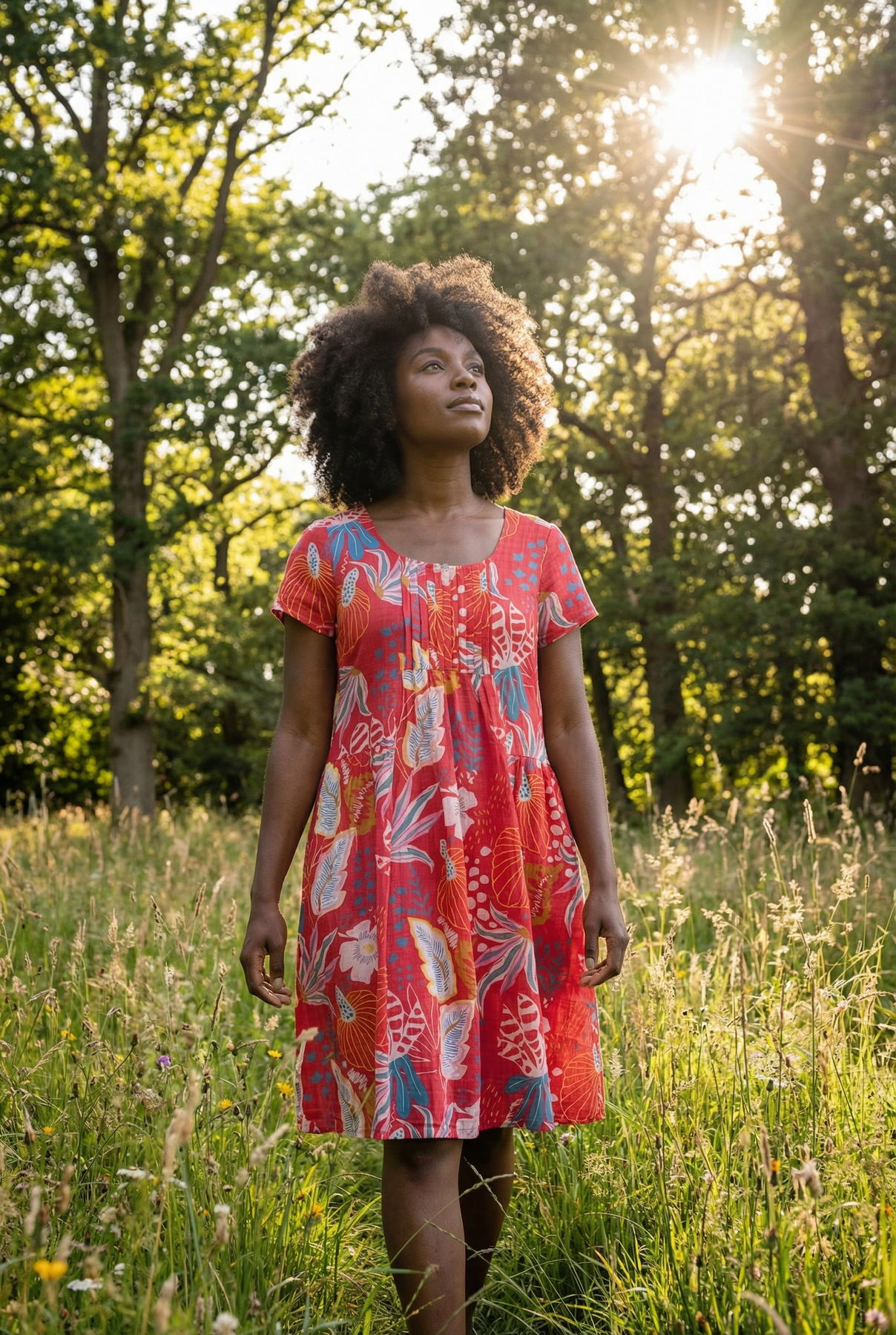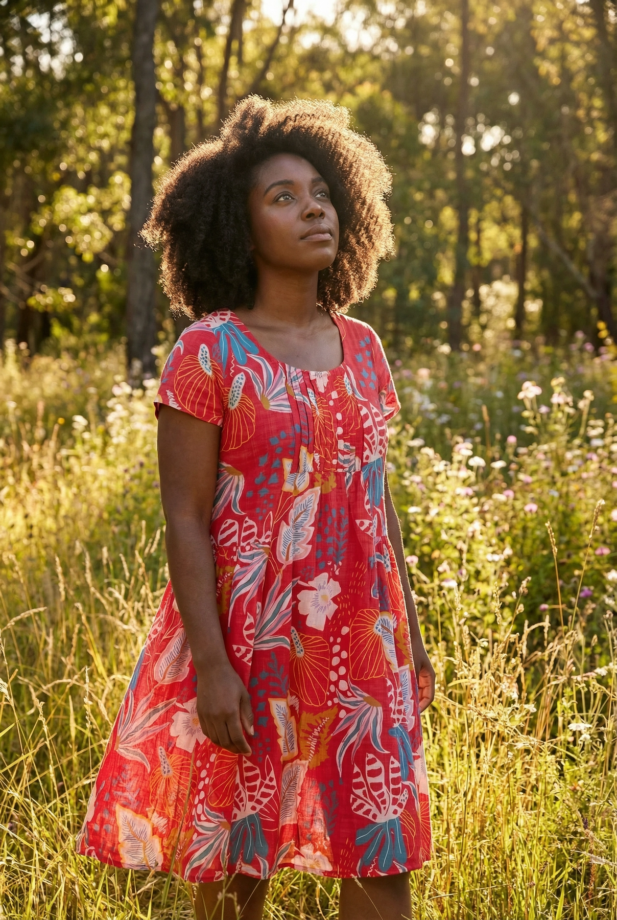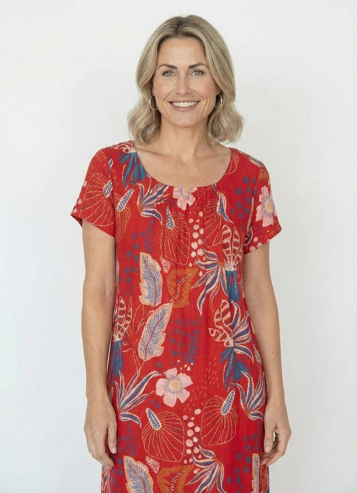 Regular price $59.99This beautiful dress is all about easy summer charm. Set against a vibrant red background, the colourful floral petal print really comes to life, with blue and pink tones standing out in the most eye-catching way. It’s bright, cheerful and perfect for days when you want to feel fresh and confident.