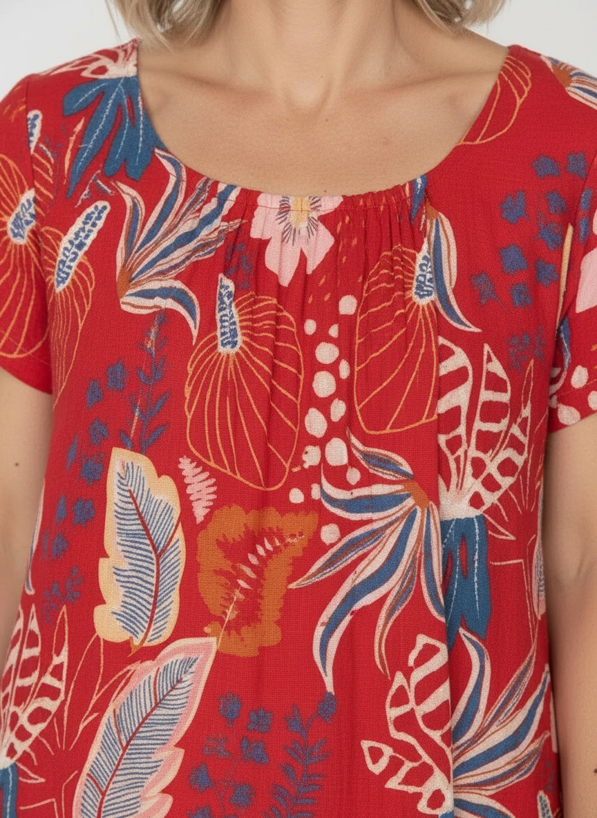Made from a lightweight blend of 65% cotton and 35% rayon, the woven fabric feels soft and breathable on the skin. It’s non-stretch, giving it a lovely shape while still feeling comfortable and easy to wear in warm weather. The short sleeves and scoop neckline keep the look relaxed and flattering. Gentle pintuck pleats at the bust add a pretty detail, allowing for easier movement while creating a softly shaped silhouette. The A-line cut drapes beautifully and falls to knee length for comfortable coverage. Each dress has its own unique print placement, making every piece just a little bit special.