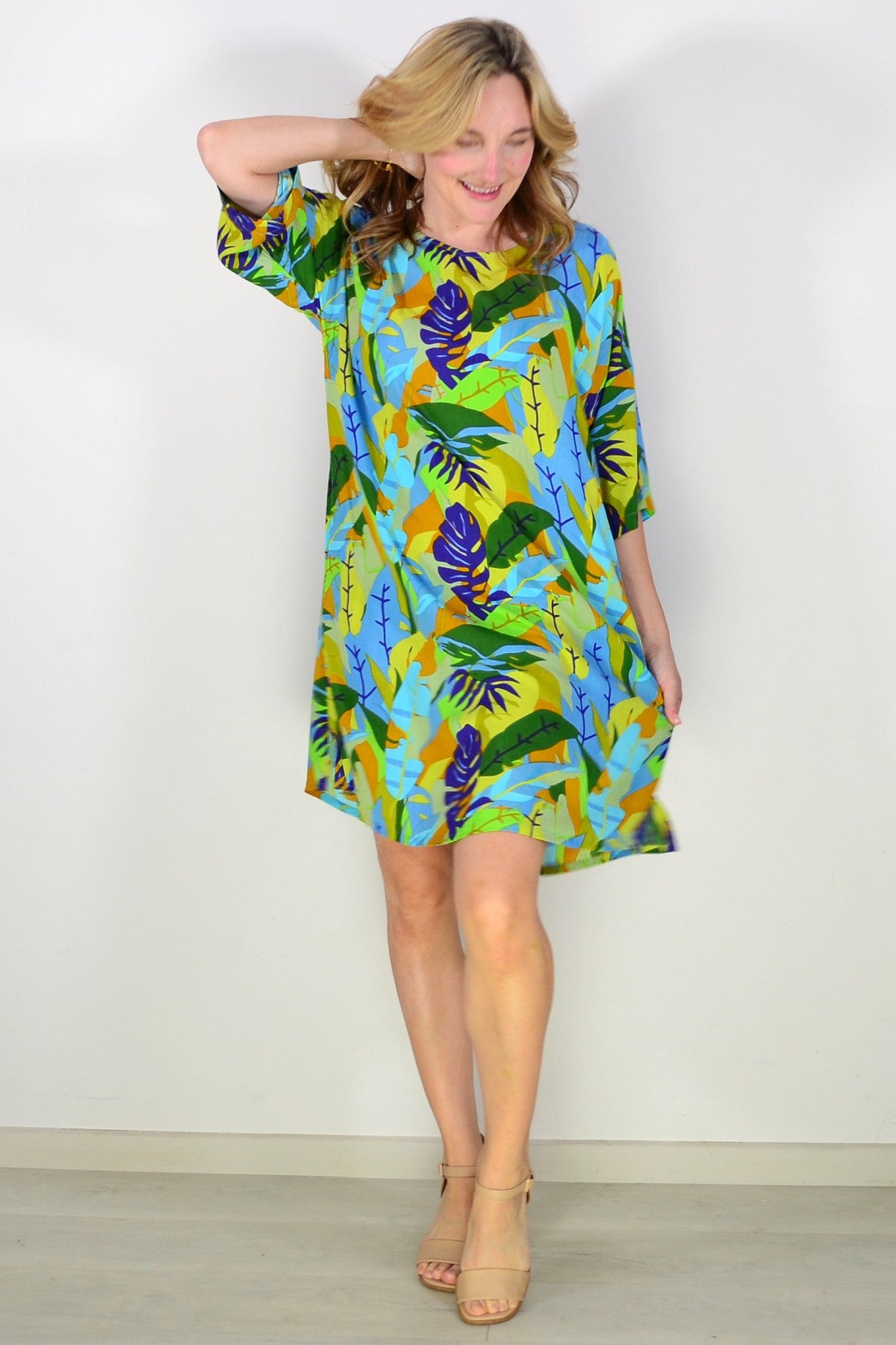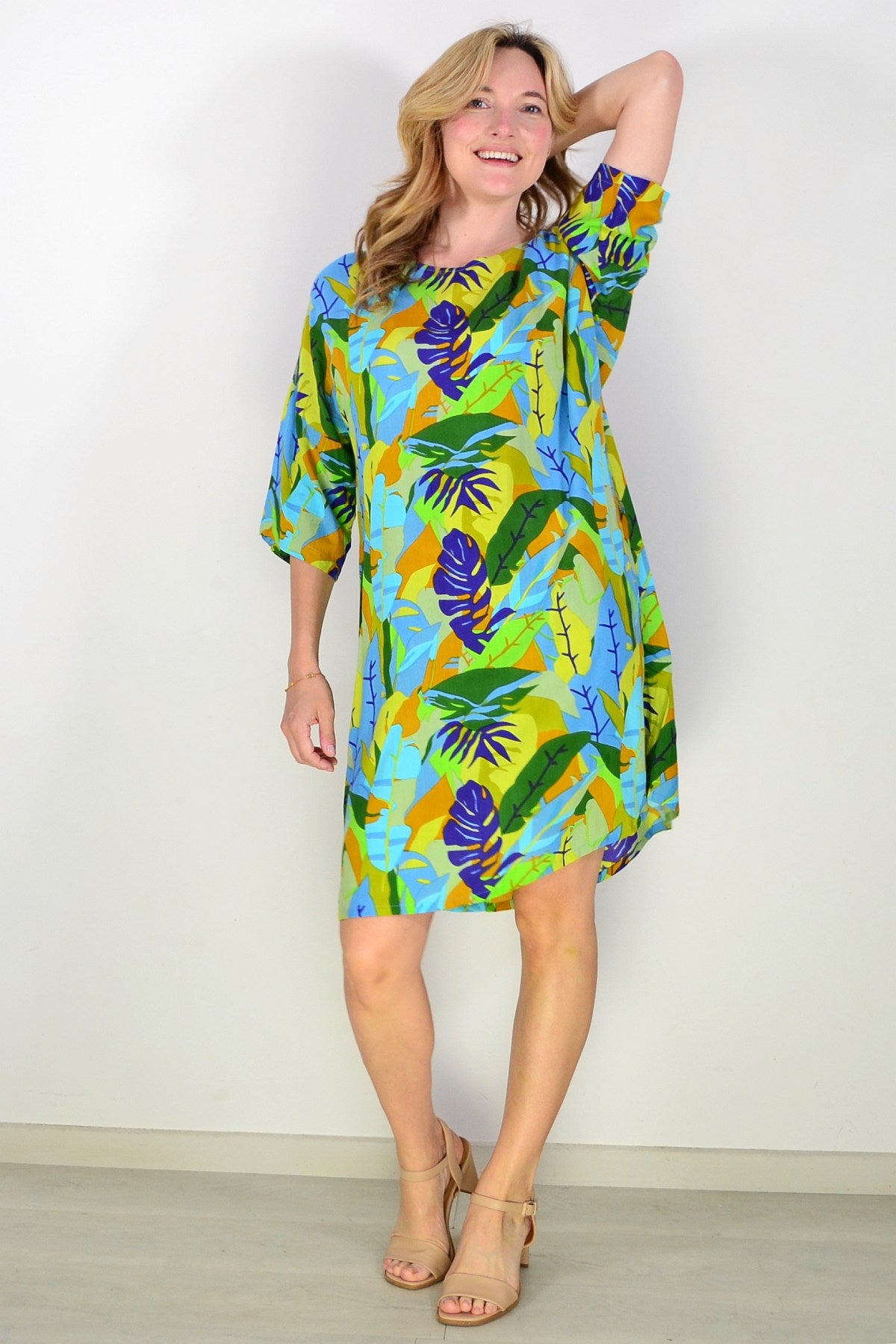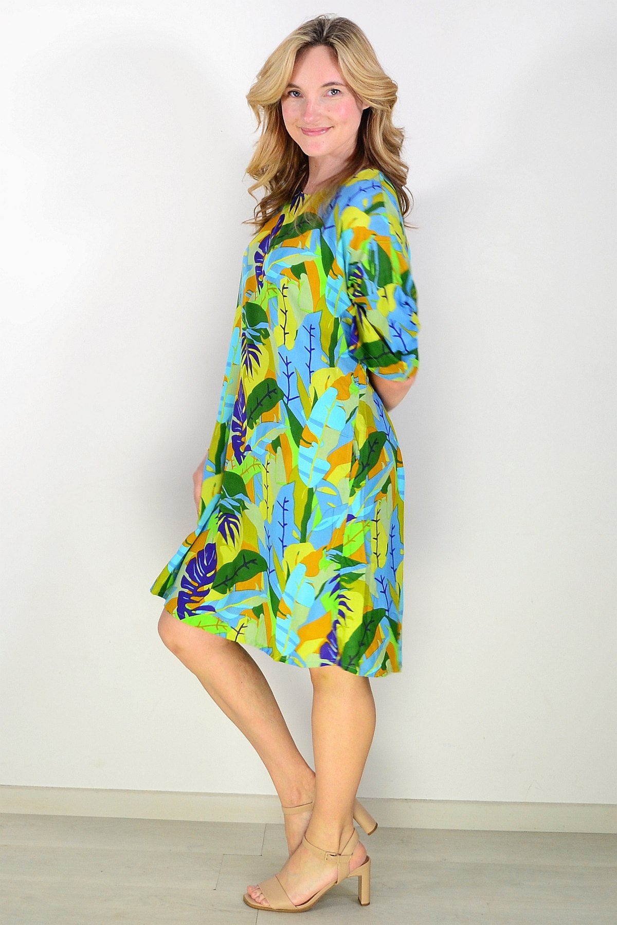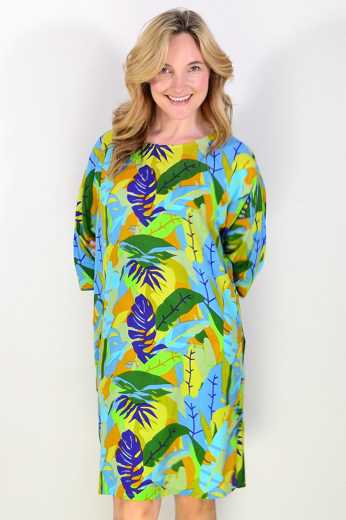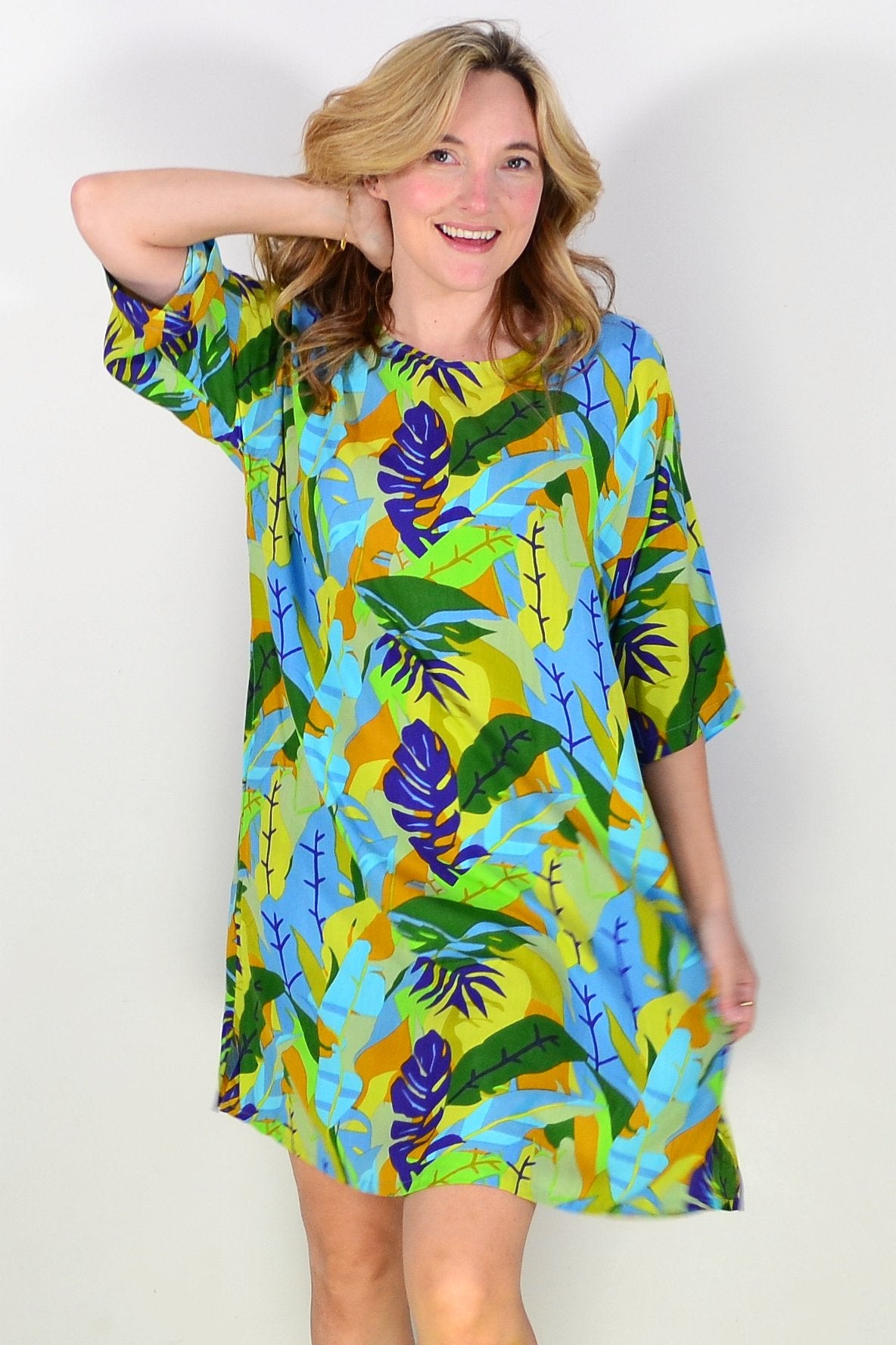 Beautiful summer shift dress with a colourful botanical themed print with colourful fern & leaves print. Main standout colours are green, blue