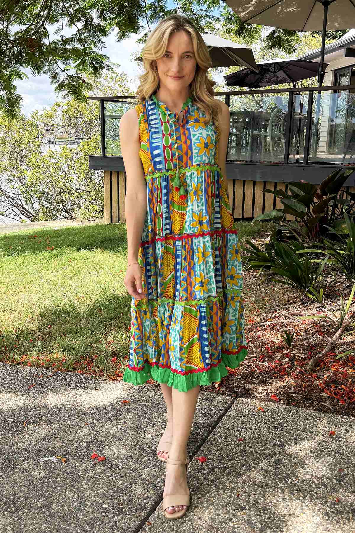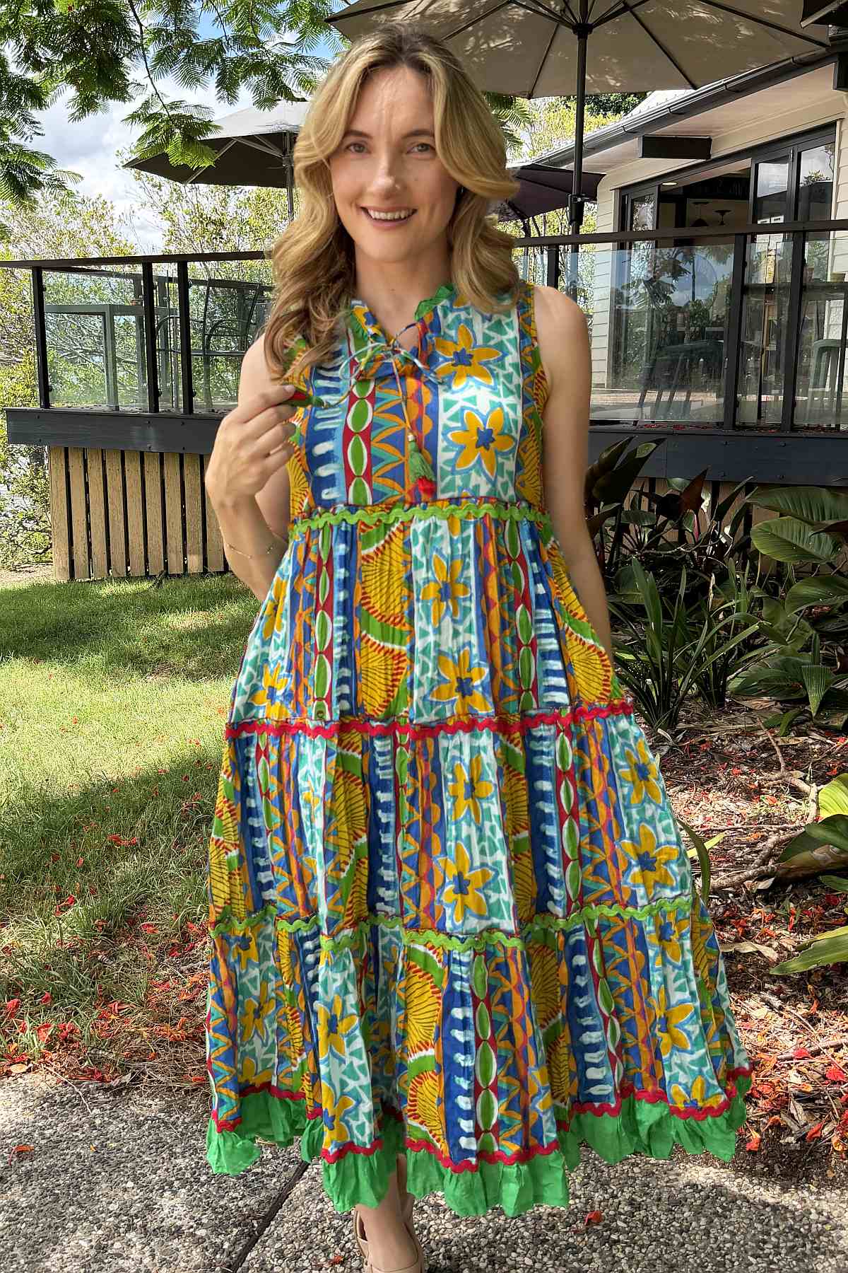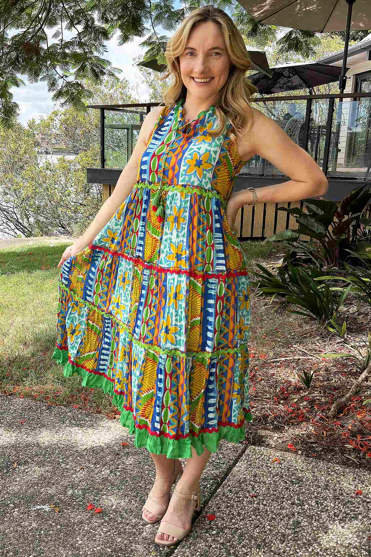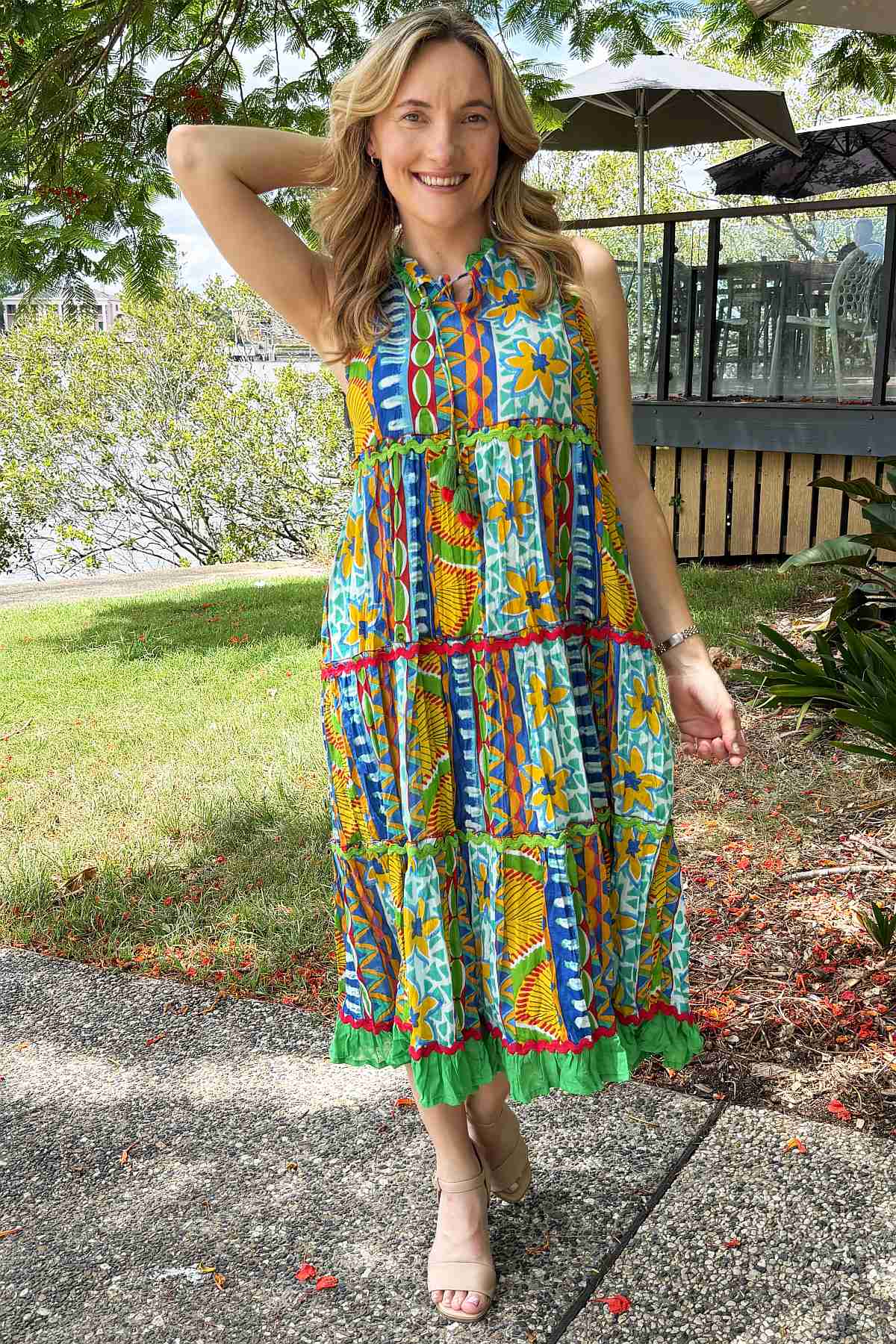 The Ipanema Layers Sleeveless Tunic Dress combines effortless elegance with practical design. Crafted from 100% organic cotton ethically sourced and made in India, this piece features a captivating floral print in vibrant blues and greens. The versatile tie-neck design transitions from a refined boat neckline to a flattering V-neck, while the relaxed, flowing silhouette skims the body beautifully. Sleeveless and ankle-length, it's finished with functional pockets and a naturally crinkled fabric that resists wrinkles—ideal for travel and everyday wear. A sophisticated staple that moves seamlessly from season to season.