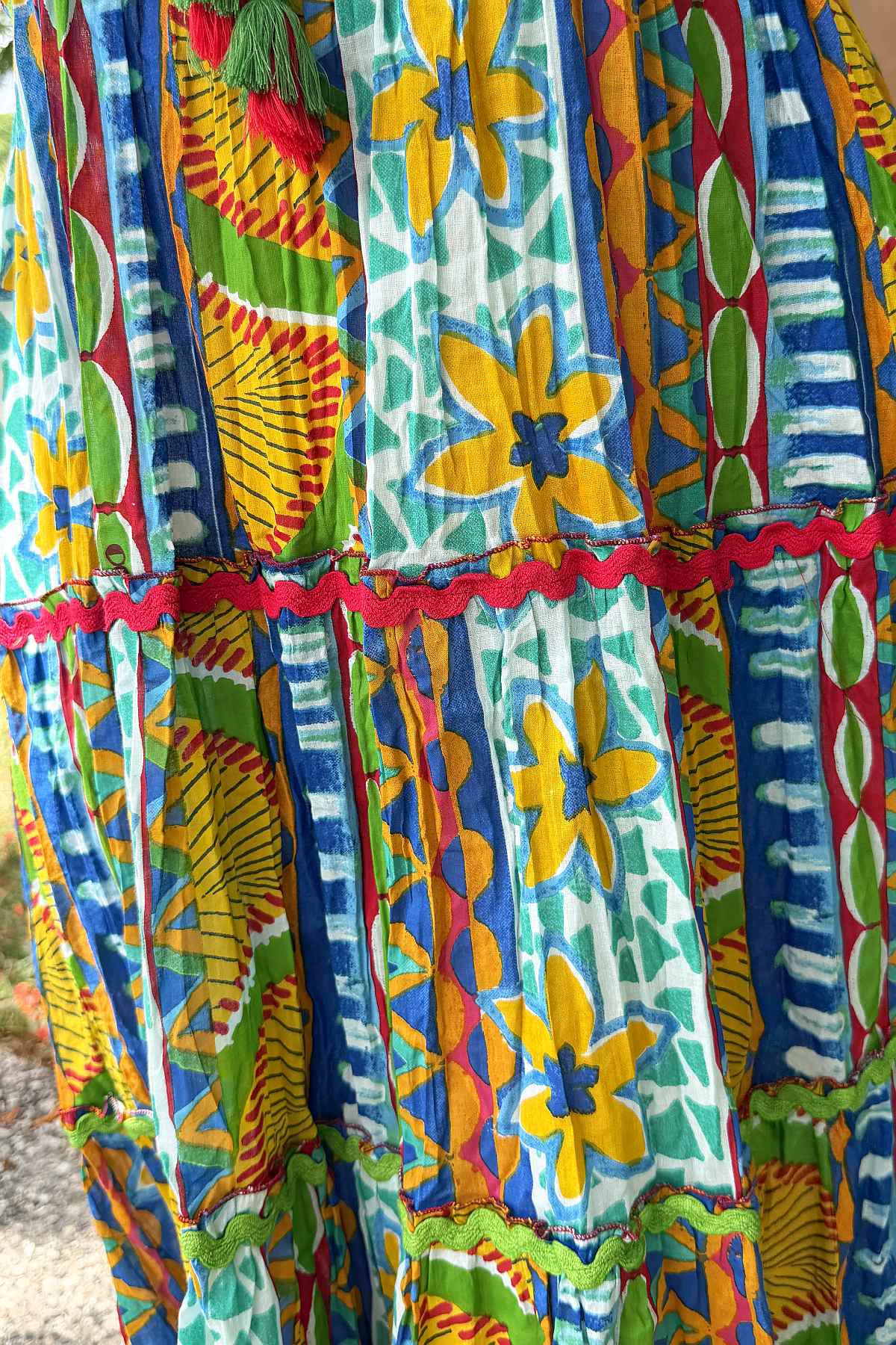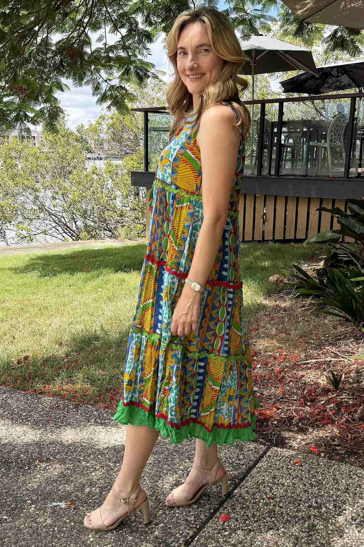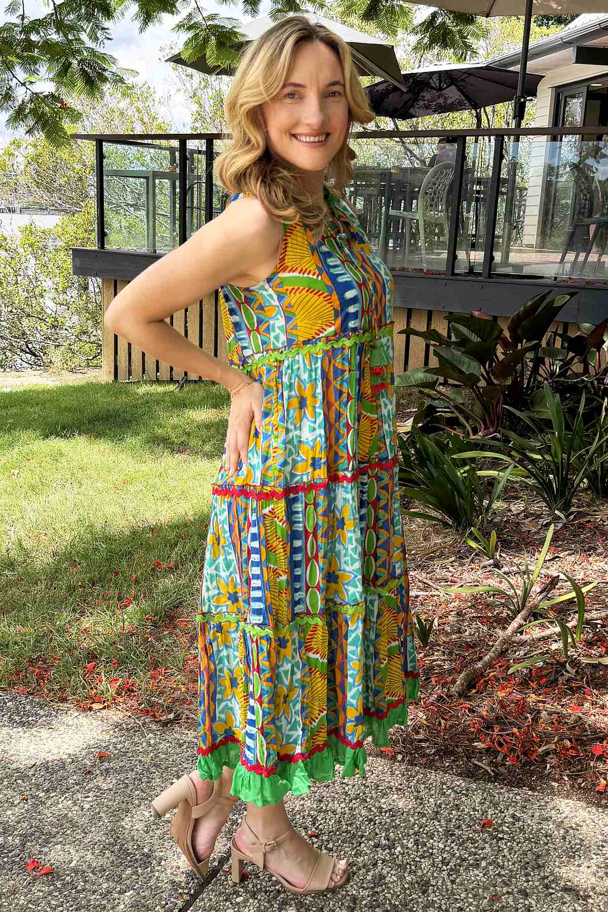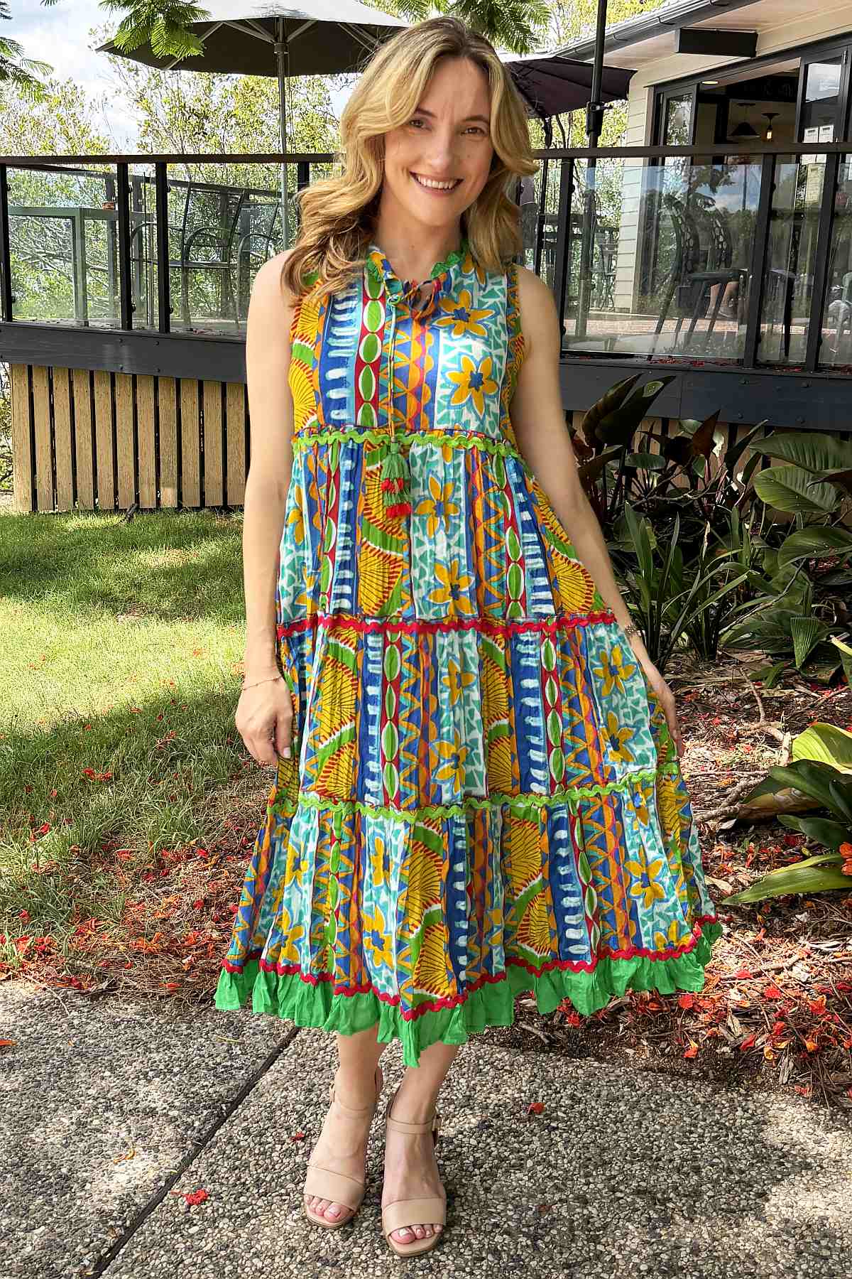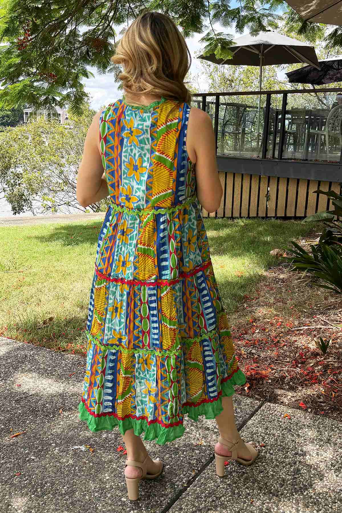 The Ipanema Layers Sleeveless Tunic Dress combines effortless elegance with practical design. Crafted from 100% organic cotton ethically sourced and made in India, this piece features a captivating floral print in vibrant blues and greens. The versatile tie-neck design transitions from a refined boat neckline to a flattering V-neck, while the relaxed, flowing silhouette skims the body beautifully. Sleeveless and ankle-length, it's finished with functional pockets and a naturally crinkled fabric that resists wrinkles—ideal for travel and everyday wear. A sophisticated staple that moves seamlessly from season to season.
