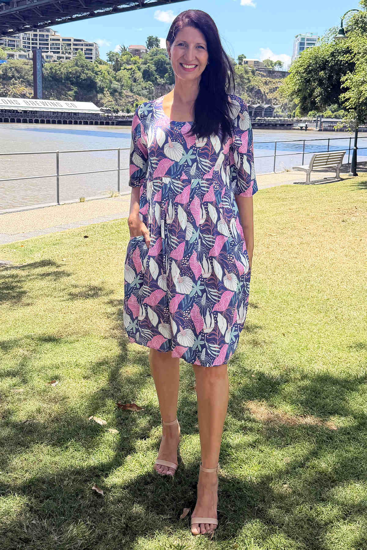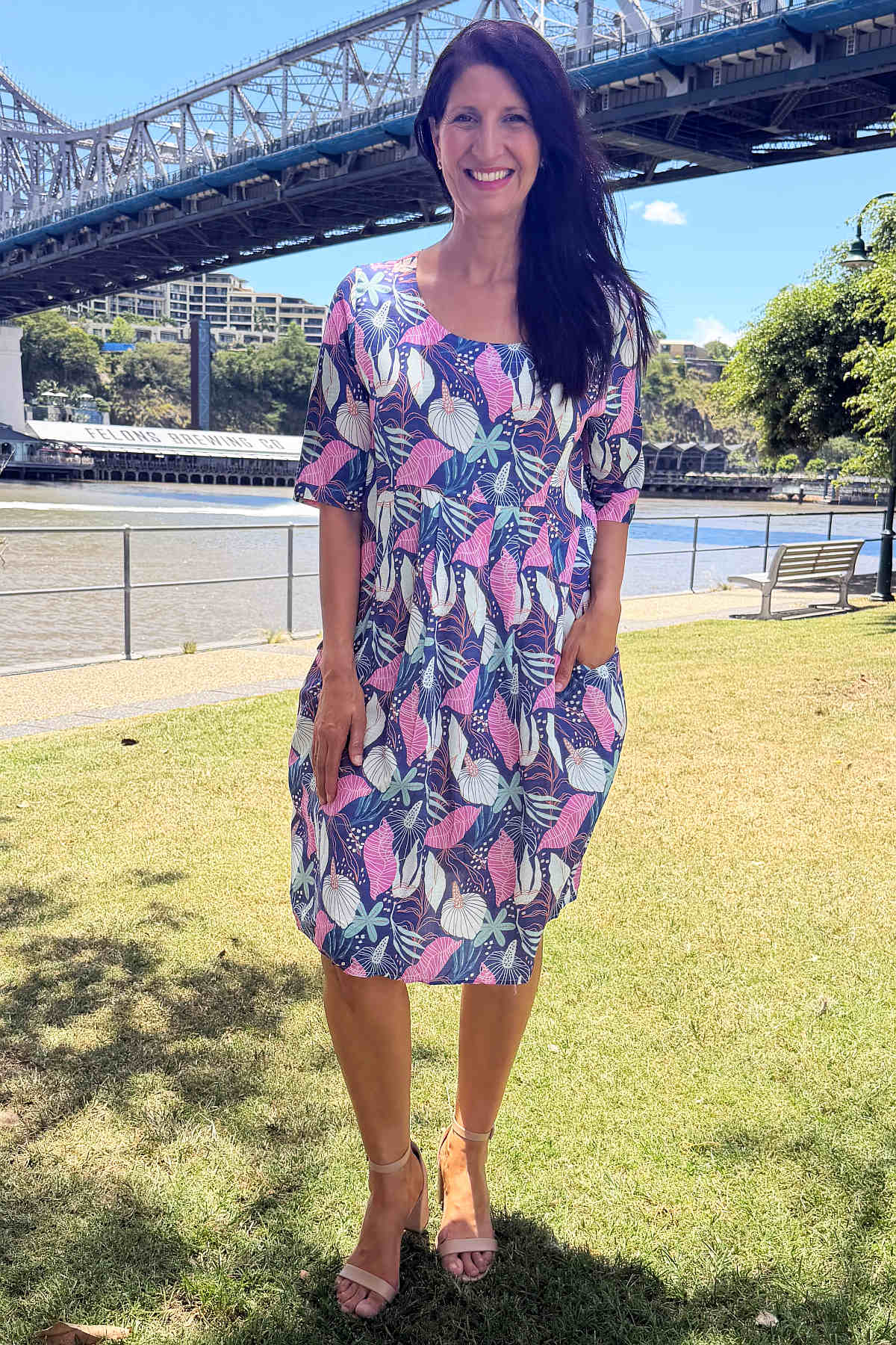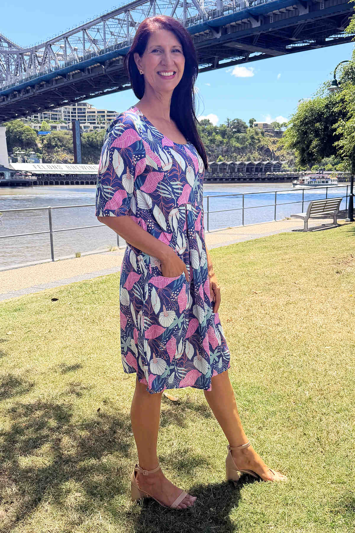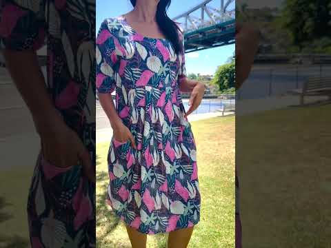 Regular price $59.99This sophisticated summer tunic combines timeless style with practical comfort. The denim blue base features an elegant pink and white floral print that adds visual interest without overwhelming the design. Constructed from 100% cool rayon, the non-stretch fabric is lightweight and breathable, perfect for warm weather while maintaining its shape and opacity. Refined box pleats across the front provide a graceful, flattering silhouette, complemented by functional front pockets. A rounded neckline and short sleeves complete the understated elegance, with the knee-length cut offering versatile styling options for both casual and semi-formal occasions.