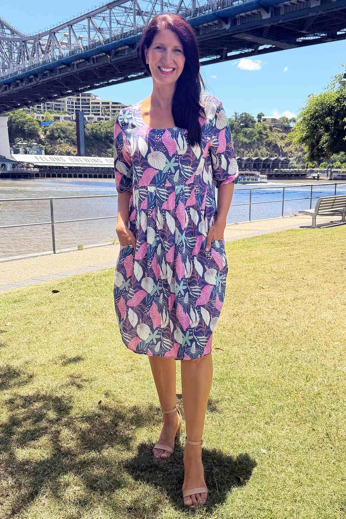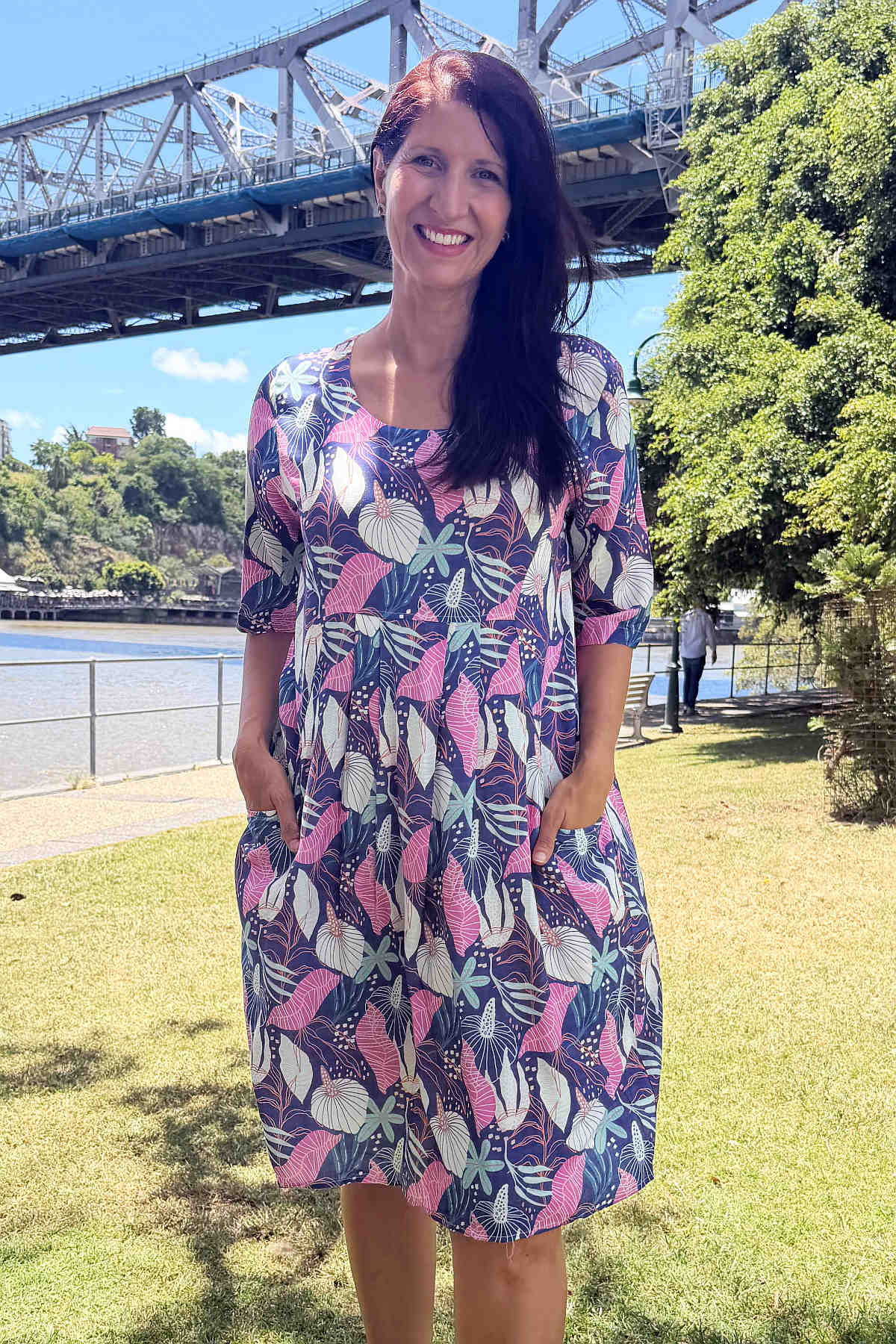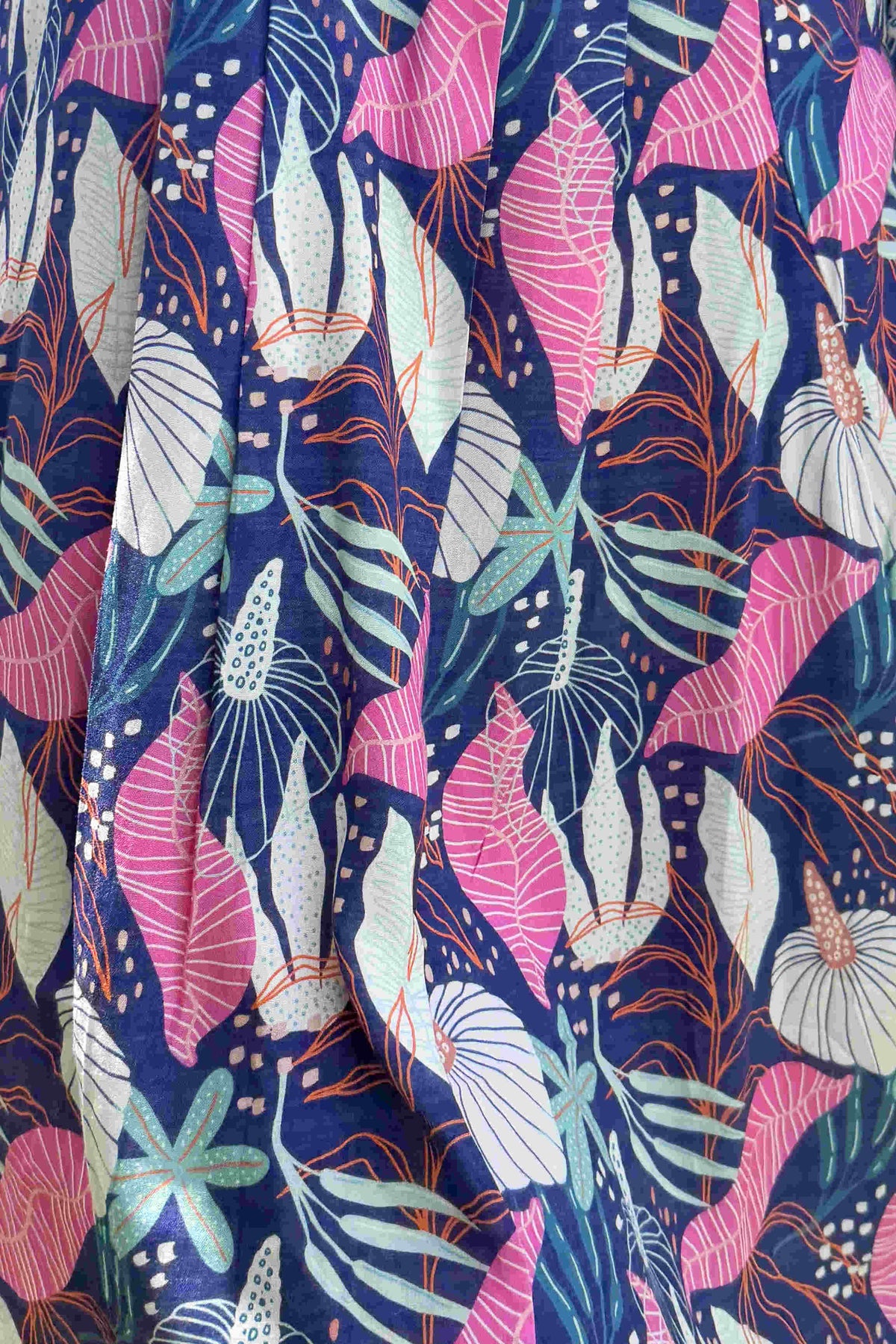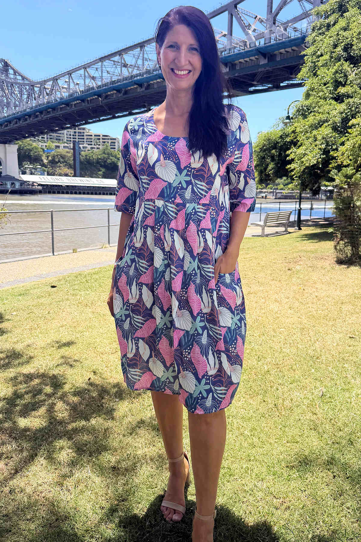 Regular price $59.99This sophisticated summer tunic combines timeless style with practical comfort. The denim blue base features an elegant pink and white floral print that adds visual interest without overwhelming the design. Constructed from 100% cool rayon, the non-stretch fabric is lightweight and breathable, perfect for warm weather while maintaining its shape and opacity. Refined box pleats across the front provide a graceful, flattering silhouette, complemented by functional front pockets. A rounded neckline and short sleeves complete the understated elegance, with the knee-length cut offering versatile styling options for both casual and semi-formal occasions.
