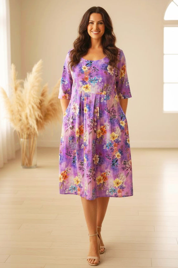 Regular price $59.99This elegant tunic dress combines timeless style with practical comfort. The rich purple canvas showcases a stunning floral design in soft pink and yellow tones, creating visual interest that transitions seamlessly from day to evening. Constructed from breathable 100% cool rayon, the non-transparent fabric maintains its shape without stretch, ideal for Australia's warm climate. Strategically placed box pleats across the front provide a flattering, refined silhouette, while discreet front pockets offer convenient functionality. Finished with a classic round neckline and short sleeves, this knee-length piece is a sophisticated wardrobe essential.