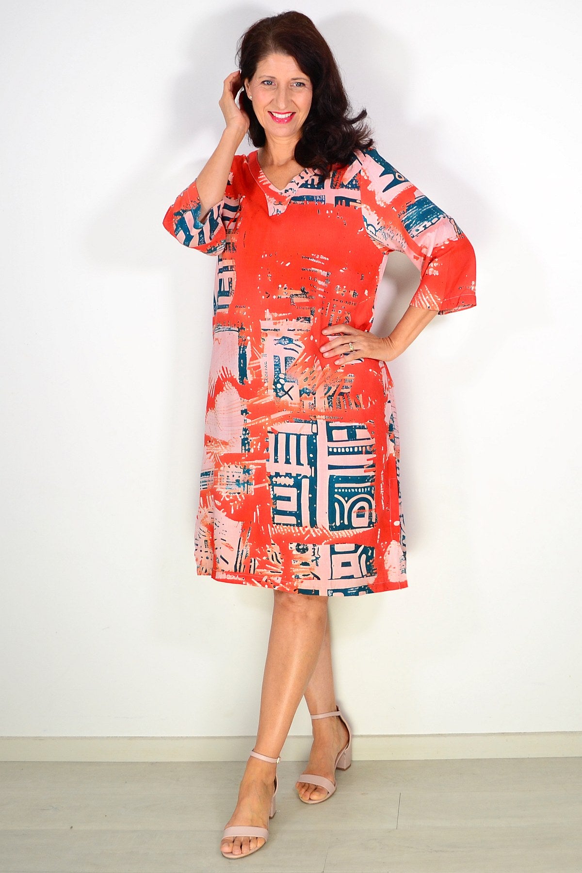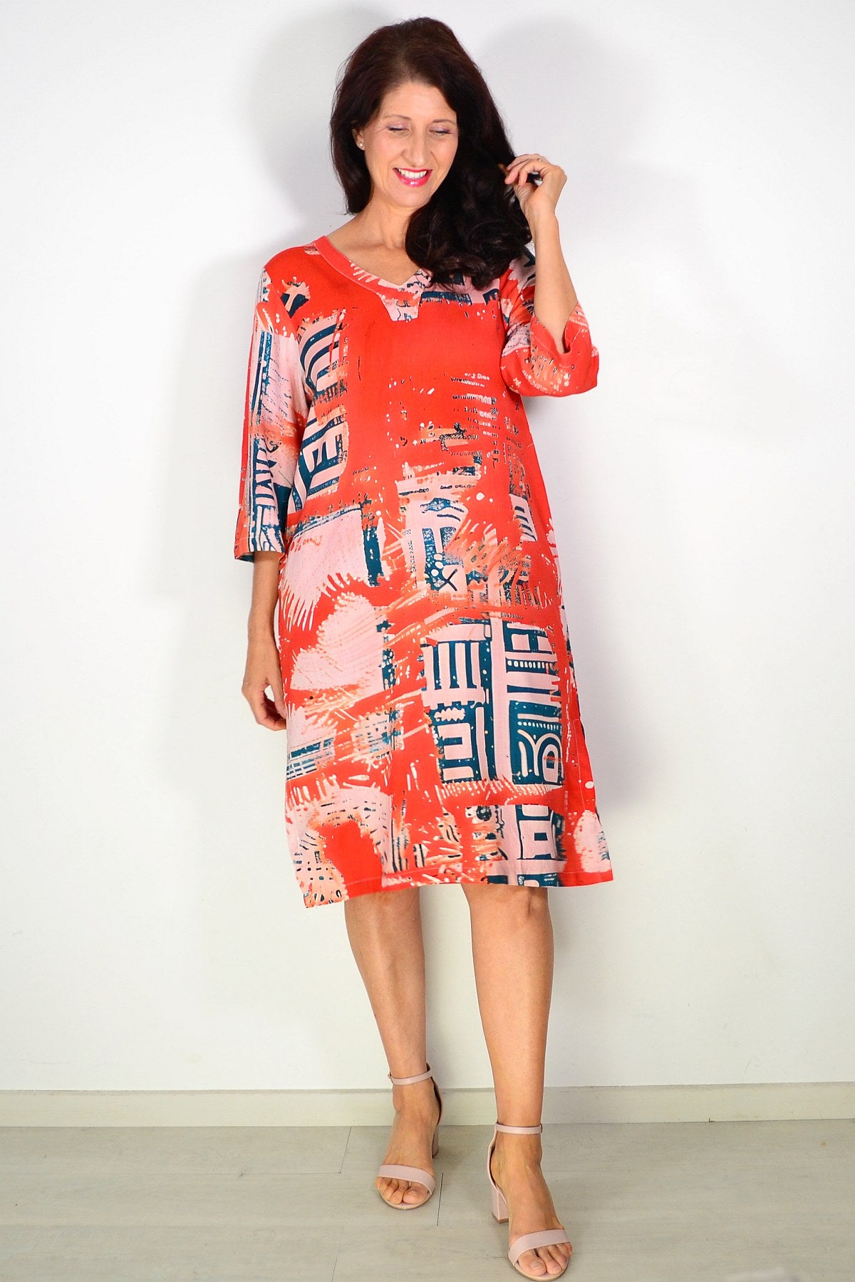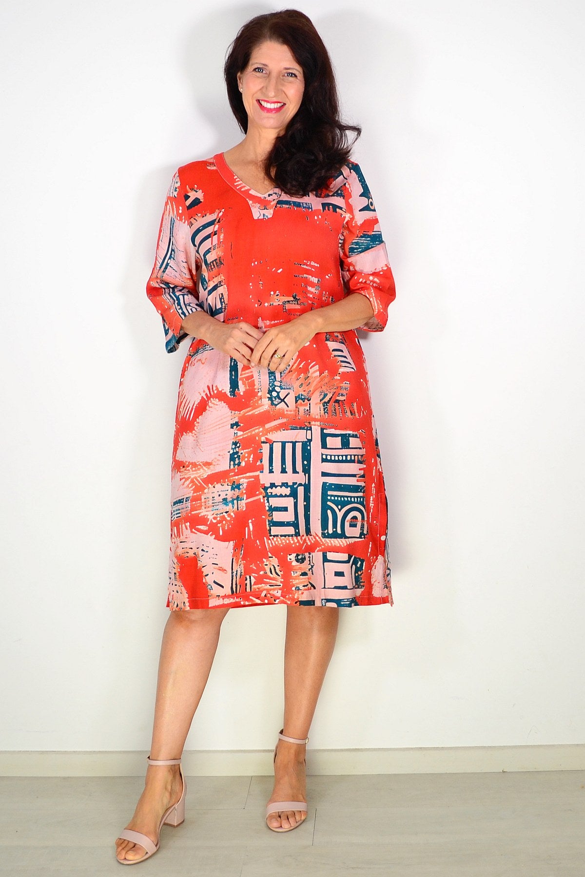 - Orange Salmon Linen Blend Tunic Dress. Main standout colours are orange, salmon, green