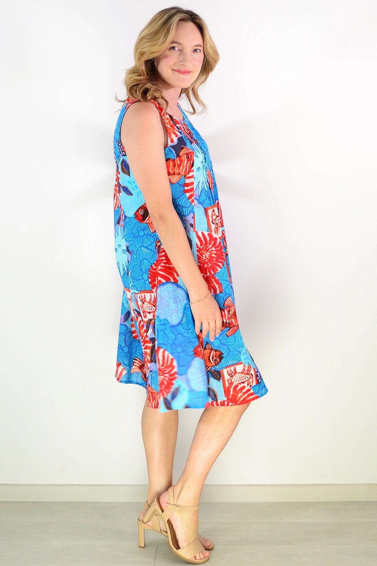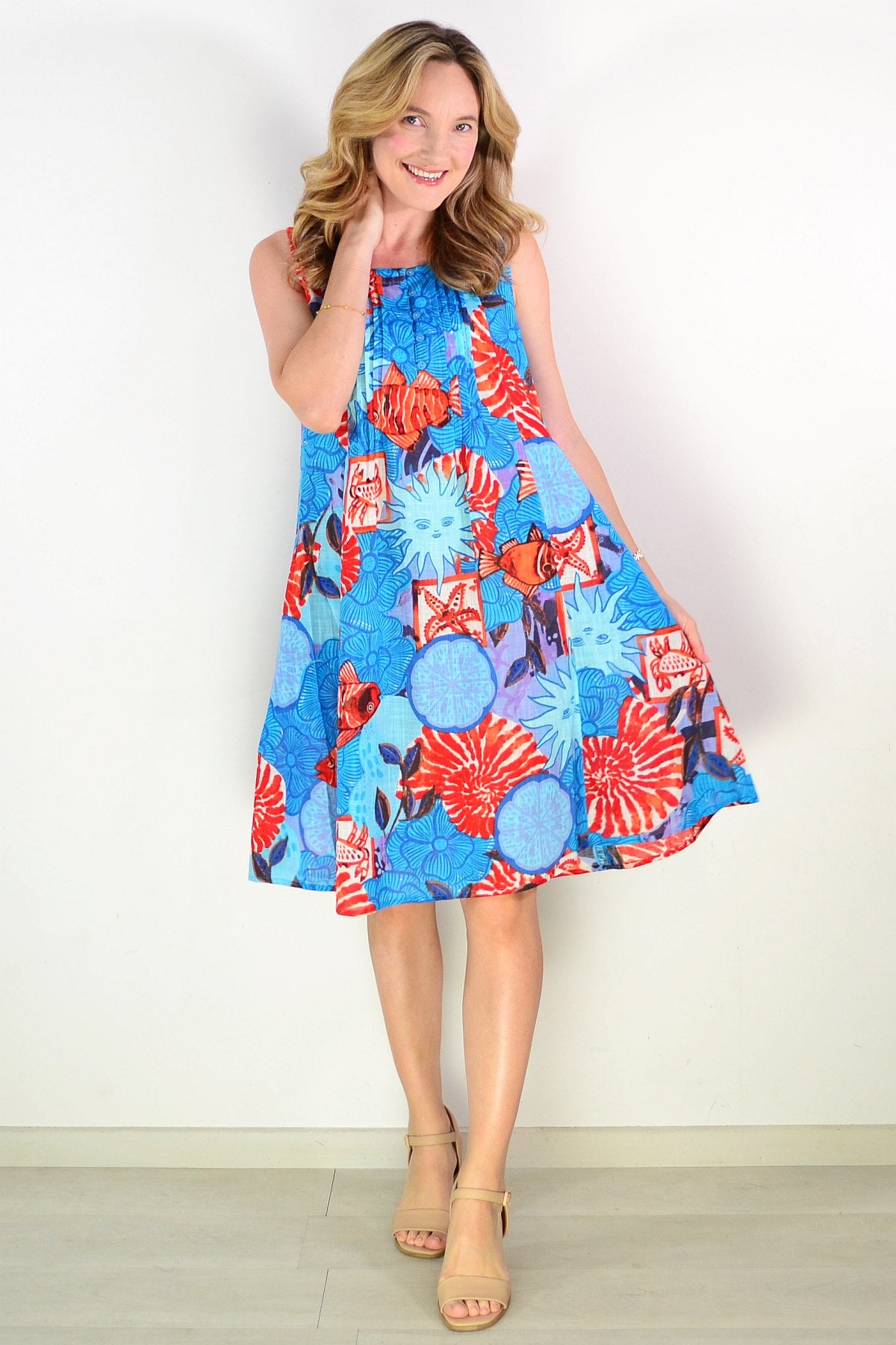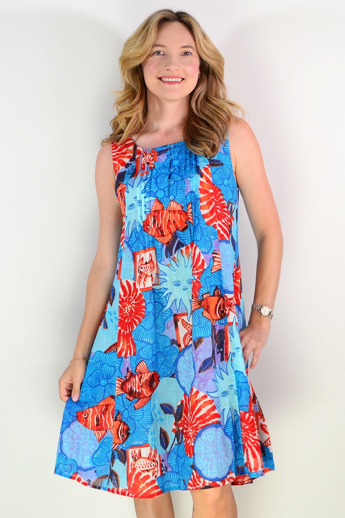 Regular price $69.00Embrace effortless elegance with the Estelle Crew Neck Sleeveless Tunic Dress, a sophisticated take on bohemian style. Crafted from pure 100% cotton, this piece features a captivating ocean-inspired print showcasing seahorses, lobsters, and starfish in striking coral and blue hues. The relaxed A-line silhouette flows beautifully with a tiered skirt, while the crew neckline, front button details, and subtle pleats add refined structure. Sleeveless and breathable, it's the perfect companion for warm-weather adventures with understated charm.