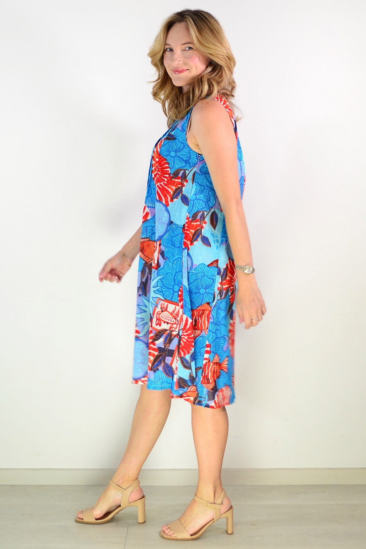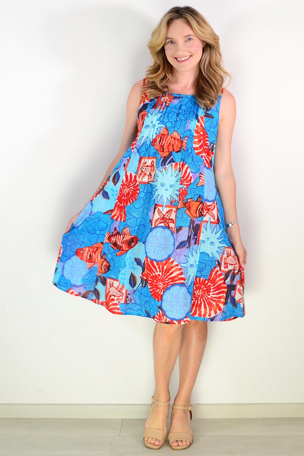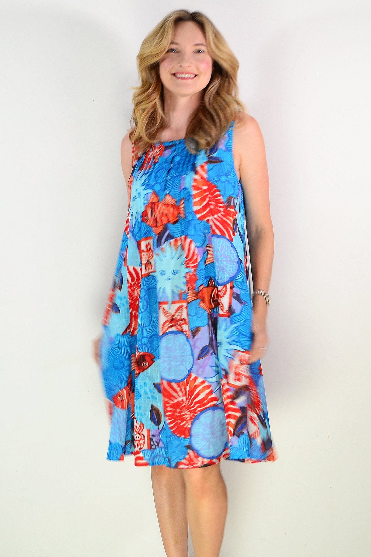 Regular price $69.00Embrace effortless elegance with the Estelle Crew Neck Sleeveless Tunic Dress, a sophisticated take on bohemian style. Crafted from pure 100% cotton, this piece features a captivating ocean-inspired print showcasing seahorses, lobsters, and starfish in striking coral and blue hues. The relaxed A-line silhouette flows beautifully with a tiered skirt, while the crew neckline, front button details, and subtle pleats add refined structure. Sleeveless and breathable, it's the perfect companion for warm-weather adventures with understated charm.