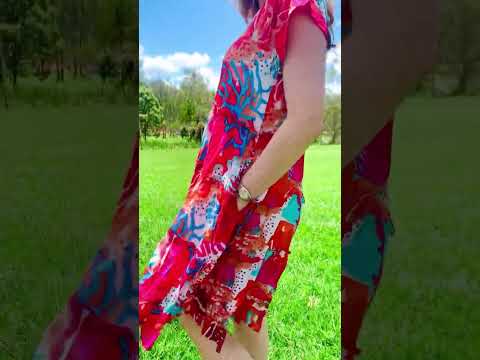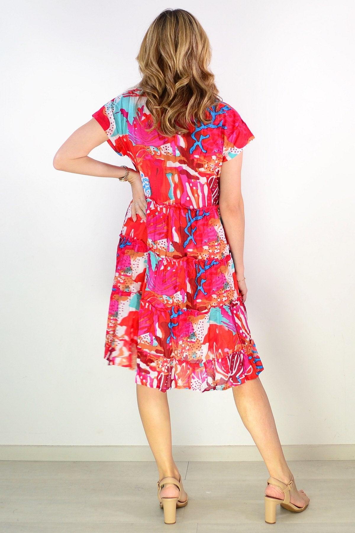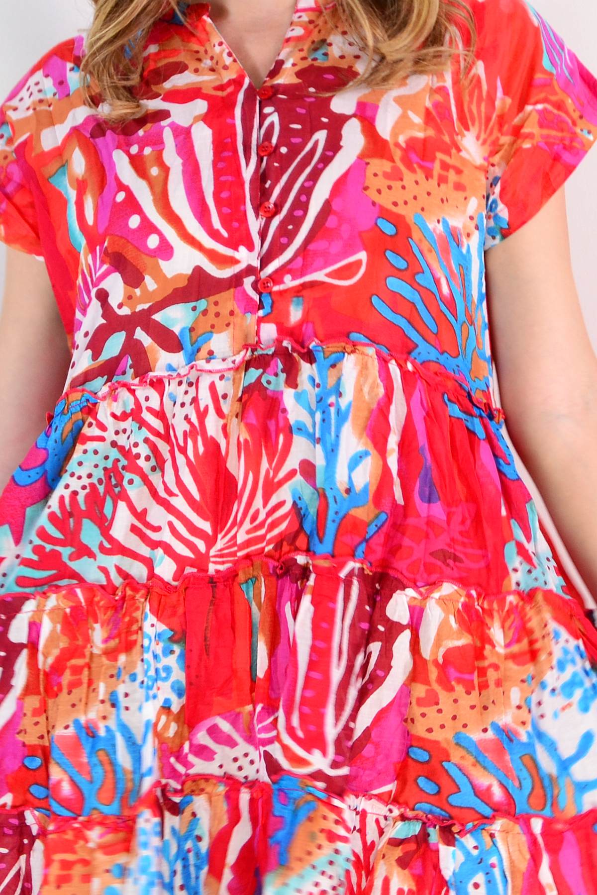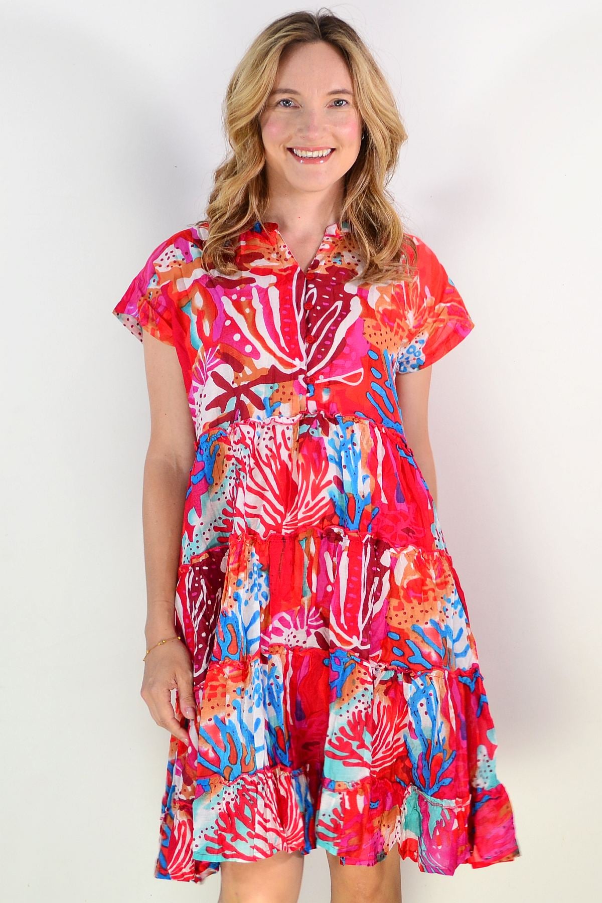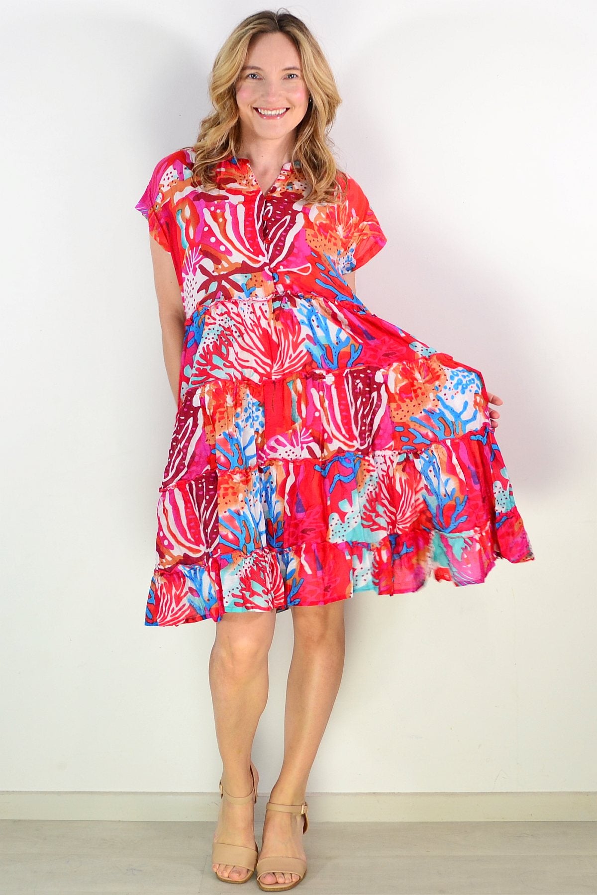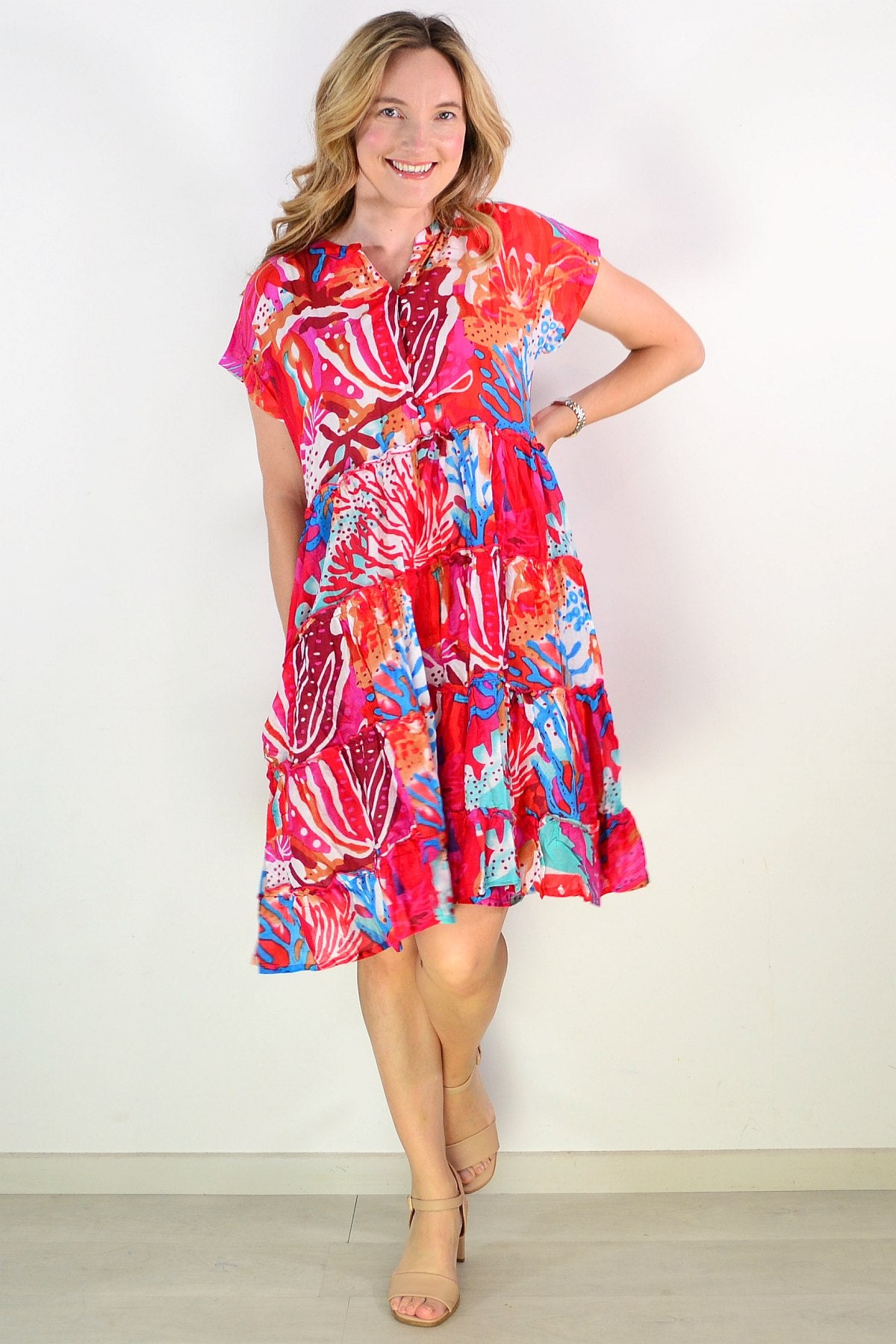 Regular price $69.00The Leela V Neck Tunic Smock Dress epitomises relaxed sophistication. Made from luxuriously soft 100% cotton, this piece drapes beautifully in a flowing A-line silhouette that skims the body gracefully, hitting just below the knee. Thoughtful front bust pintuck detailing creates visual interest and enhances the feminine silhouette, while cap sleeves and a V neckline offer timeless appeal. Four functional buttons provide practical styling versatility, and the vibrant coral print—accented with pink, red, and blue—brings joyful colour to your everyday wardrobe.