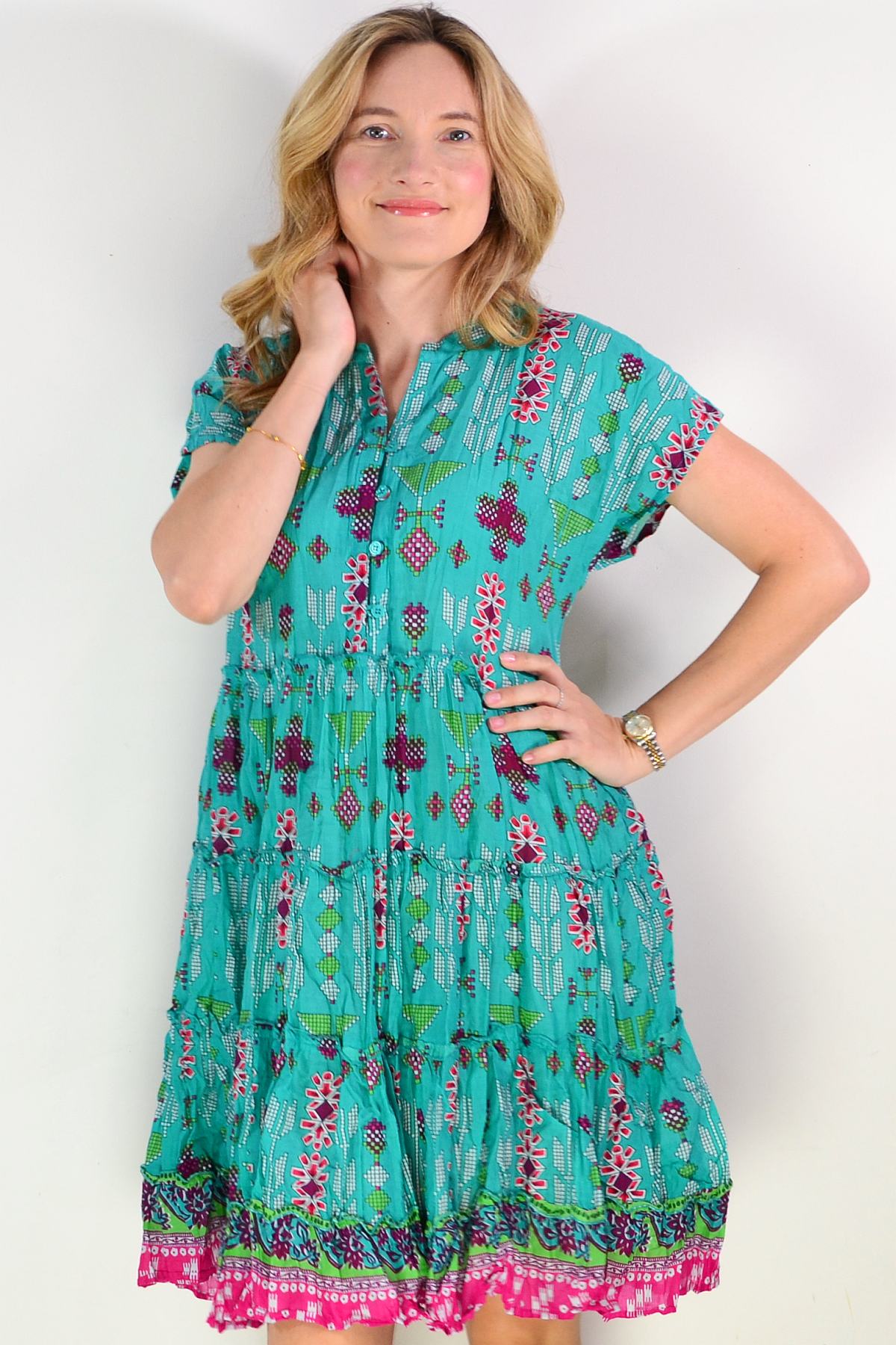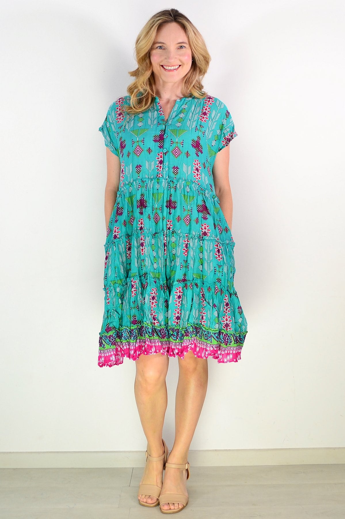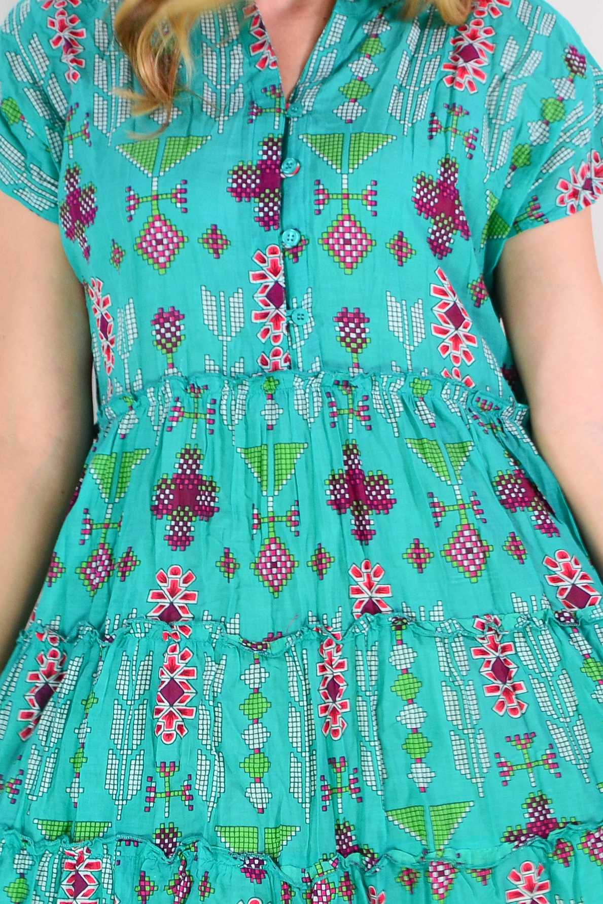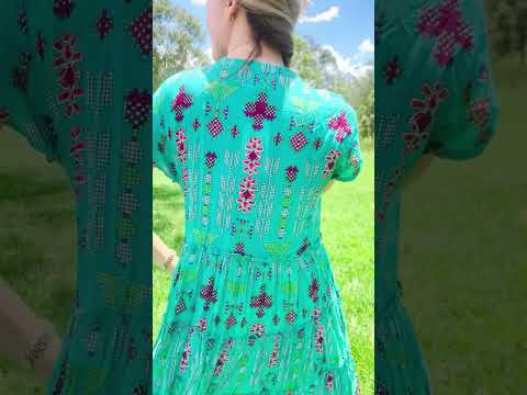 Regular price $69.00The Leela V Neck Green Smock Dress combines effortless elegance with everyday comfort. Crafted from soft, breathable 100% cotton, this relaxed A-line silhouette drapes beautifully with a flattering smock design. Cap sleeves and a V neckline with functional buttons create a refined look, while delicate front bust pintucks add dimension and feminine grace. The striking geometric print in rich green and purple tones makes a sophisticated statement. Knee-length and wonderfully versatile, this dress transitions seamlessly from casual outings to relaxed gatherings.