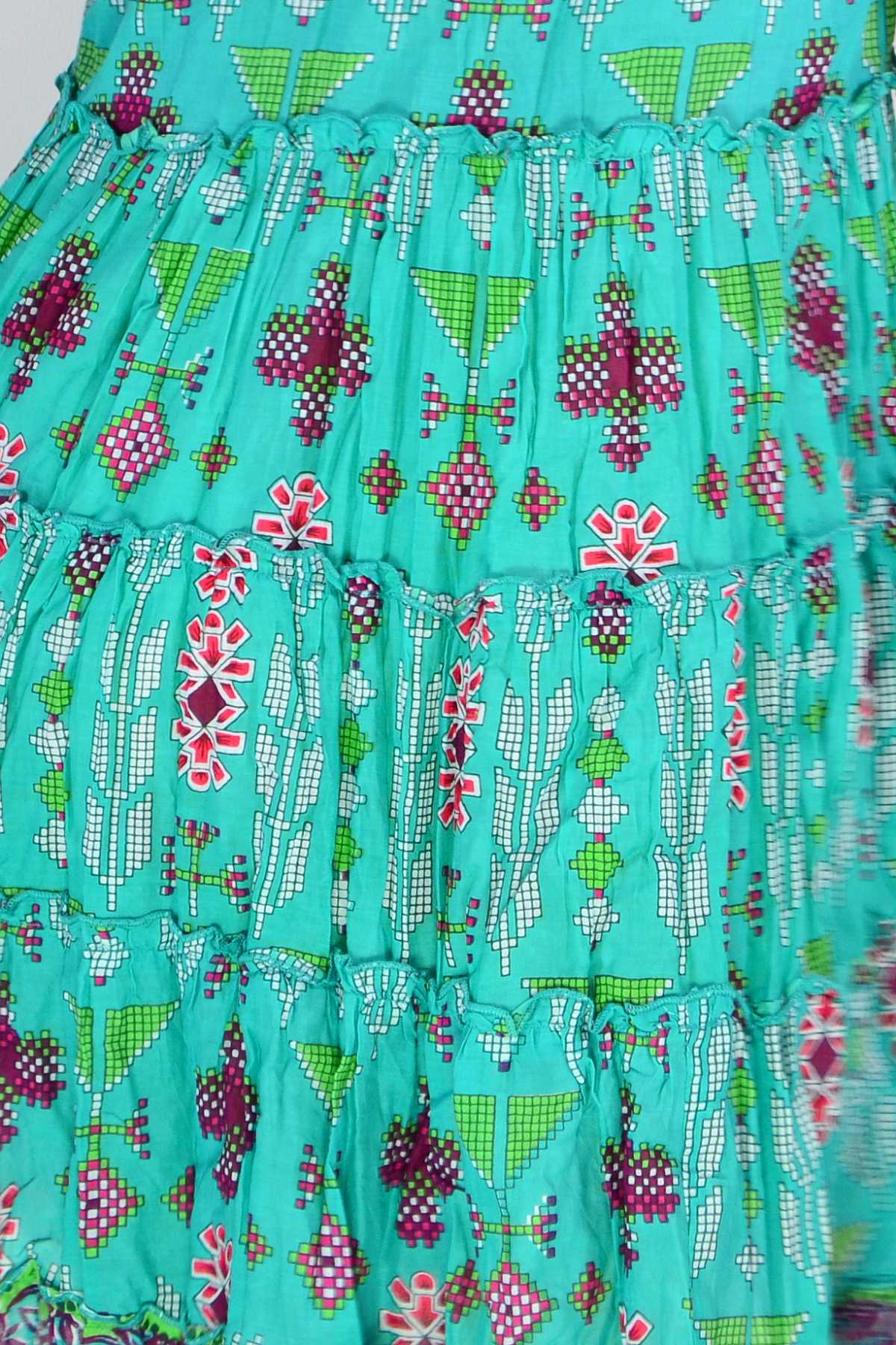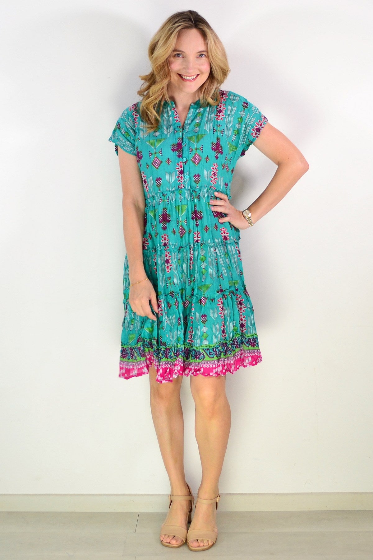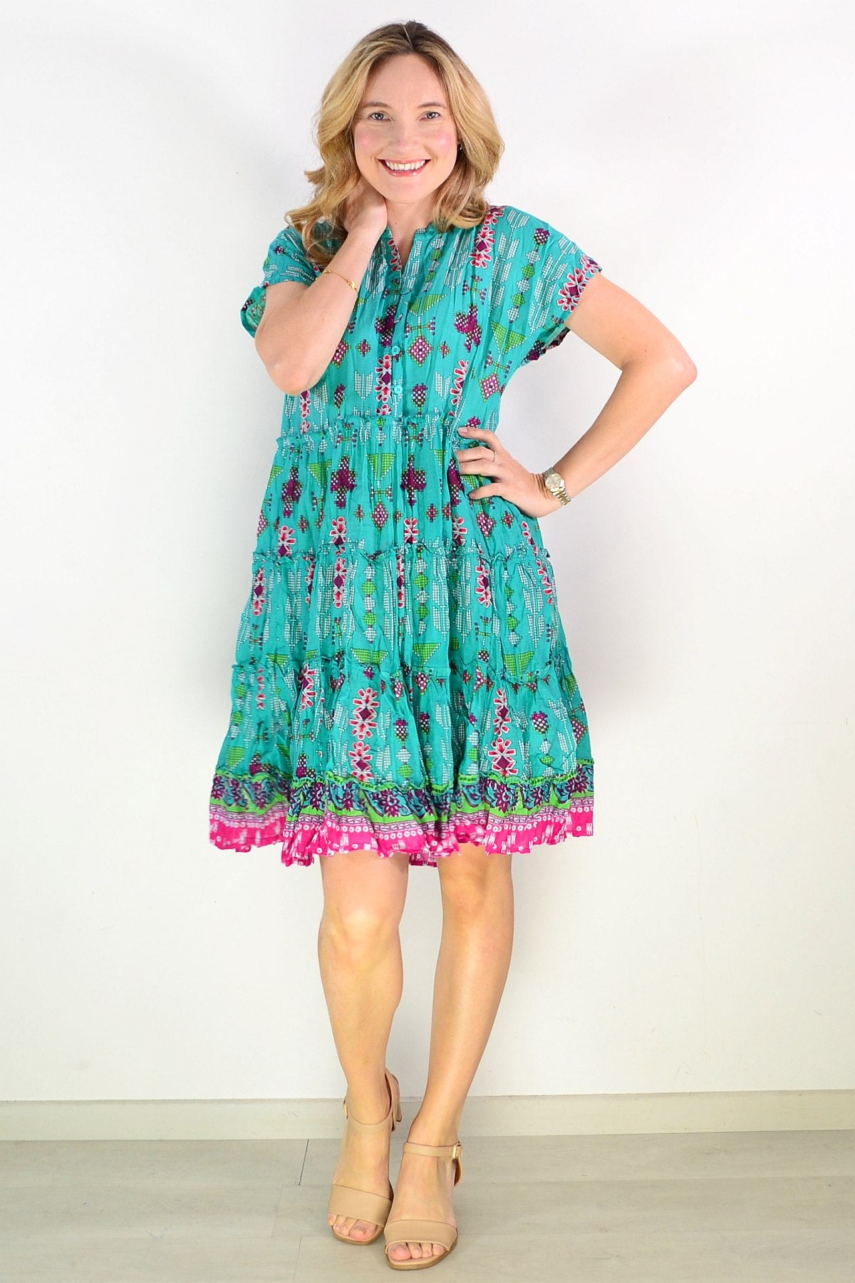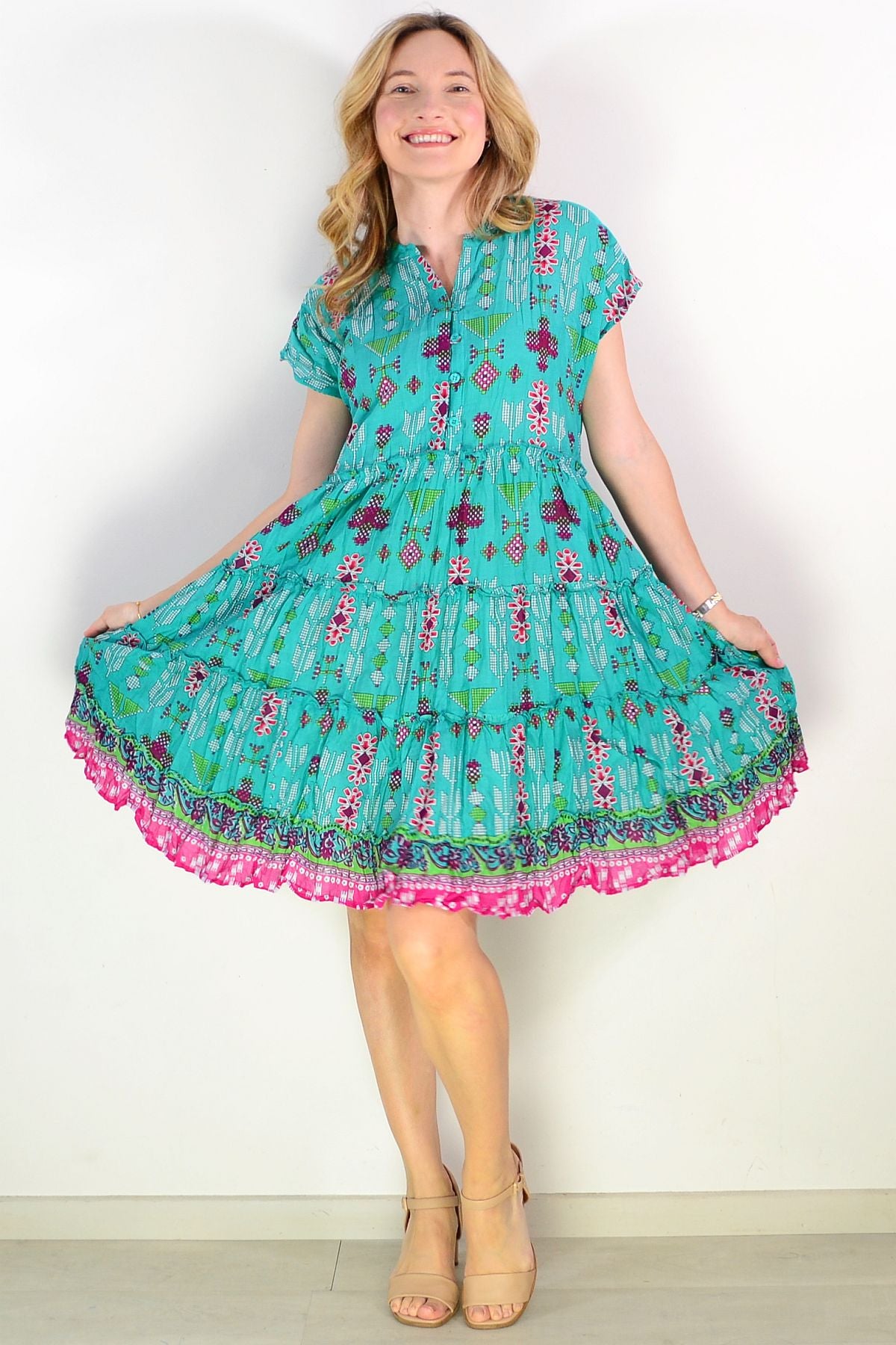 Regular price $69.00The Leela V Neck Green Smock Dress combines effortless elegance with everyday comfort. Crafted from soft, breathable 100% cotton, this relaxed A-line silhouette drapes beautifully with a flattering smock design. Cap sleeves and a V neckline with functional buttons create a refined look, while delicate front bust pintucks add dimension and feminine grace. The striking geometric print in rich green and purple tones makes a sophisticated statement. Knee-length and wonderfully versatile, this dress transitions seamlessly from casual outings to relaxed gatherings.