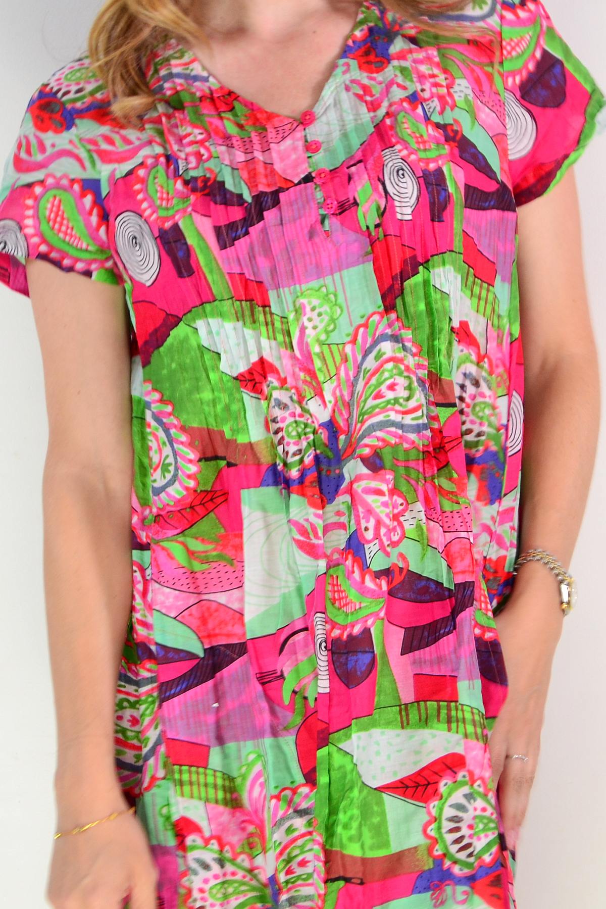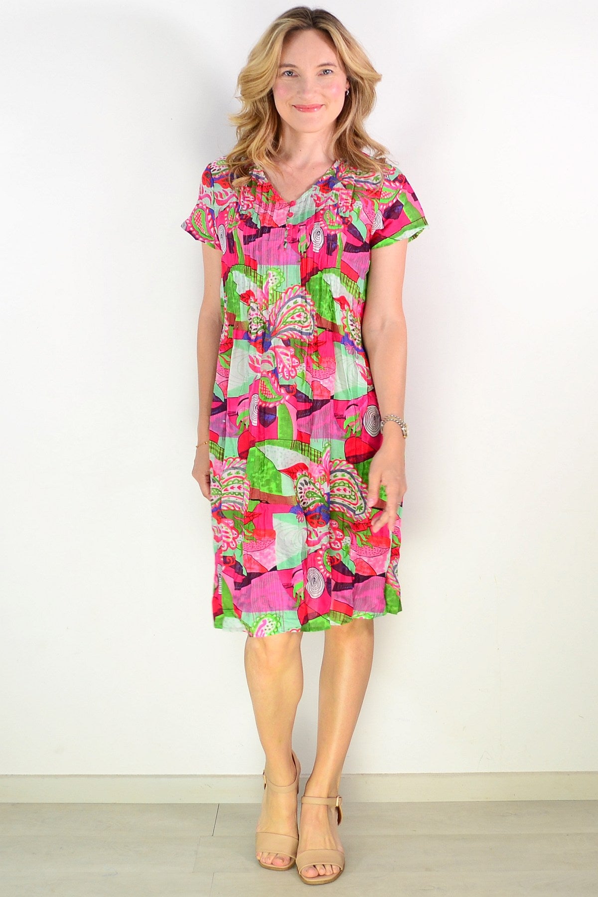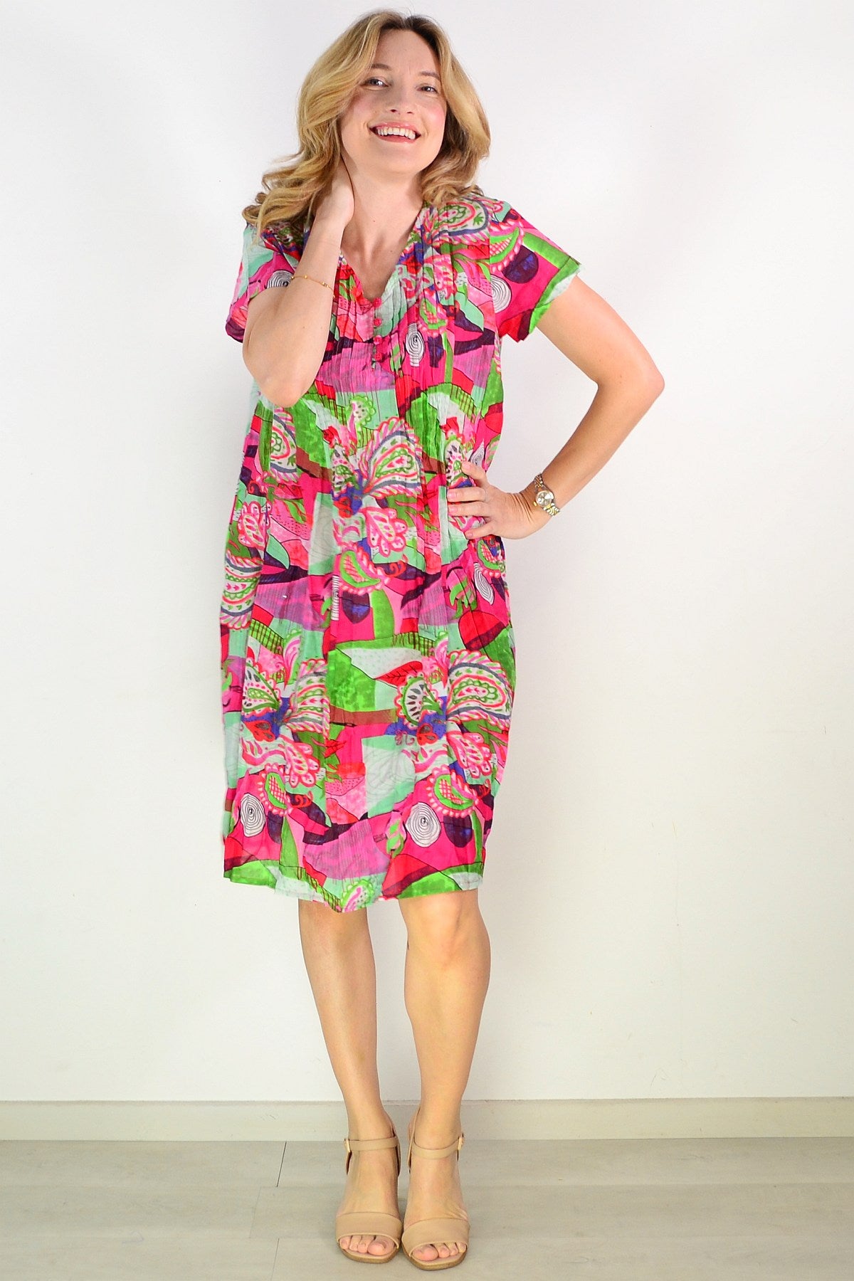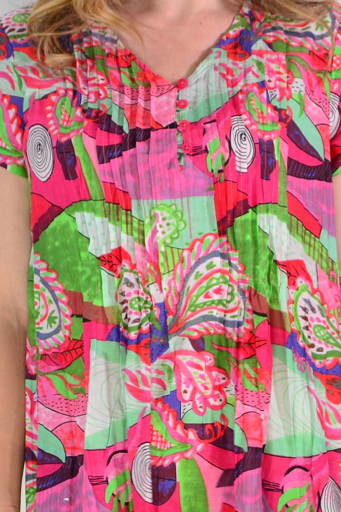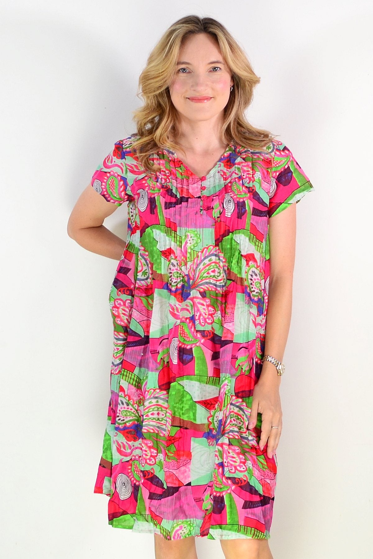 Regular price $69.00The Nicola Cap Sleeve Cotton Tunic Dress combines effortless elegance with everyday comfort. Crafted from soft, breathable 100% cotton, this piece features a relaxed A-line silhouette with a gracefully tiered skirt that moves beautifully. Refined front bust pintuck detailing adds dimension and a distinctly feminine touch, while the V neckline and cap sleeves create a flattering frame. Practical side pockets and a vibrant abstract print in striking lime and pink tones complete this versatile wardrobe essential.