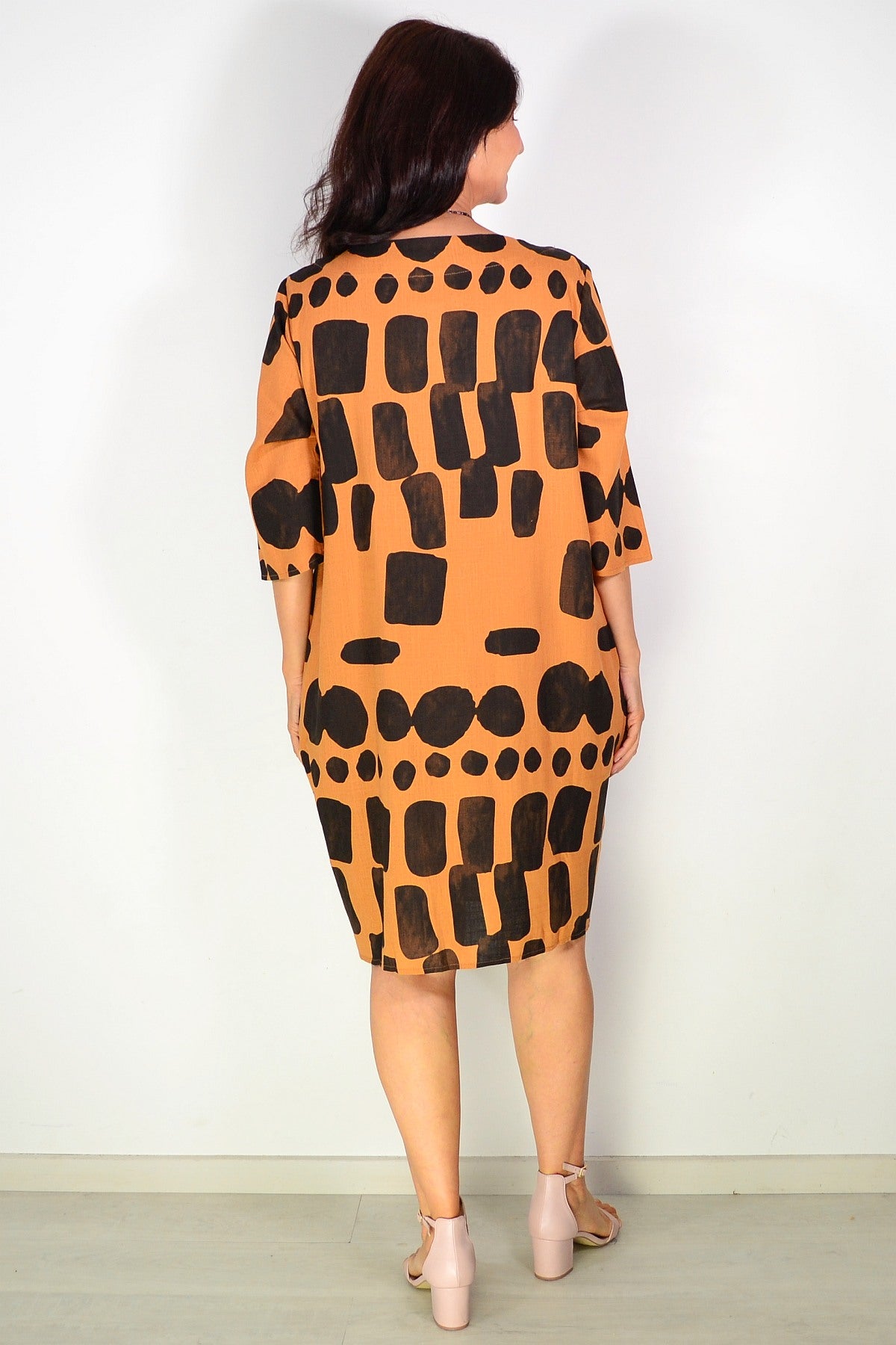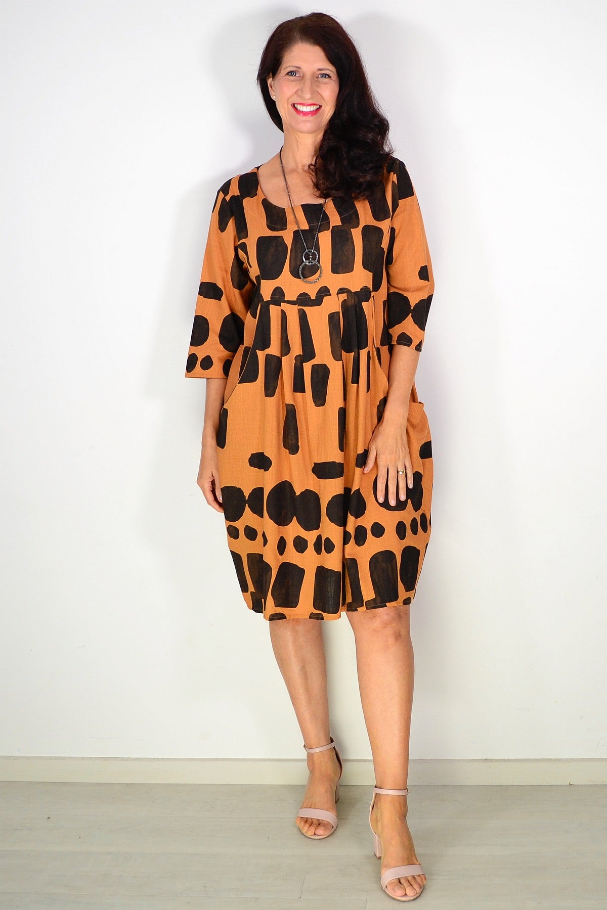 Regular price $69.99Elevate your summer wardrobe with the Orange Black Print Tunic Dress, featuring a lively orange base contrasted by a refined black abstract print. Crafted from summer non-stretch fabric, this dress incorporates box pleats across the front to provide structure and enhance comfort. Practical side pockets, a classic round neckline, and elegant elbow-length sleeves complete this sophisticated and fluid silhouette.