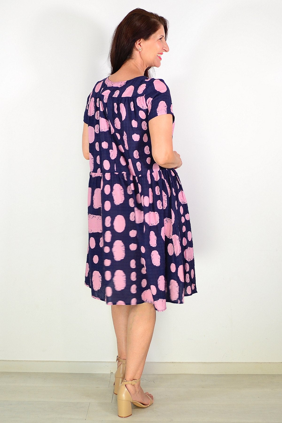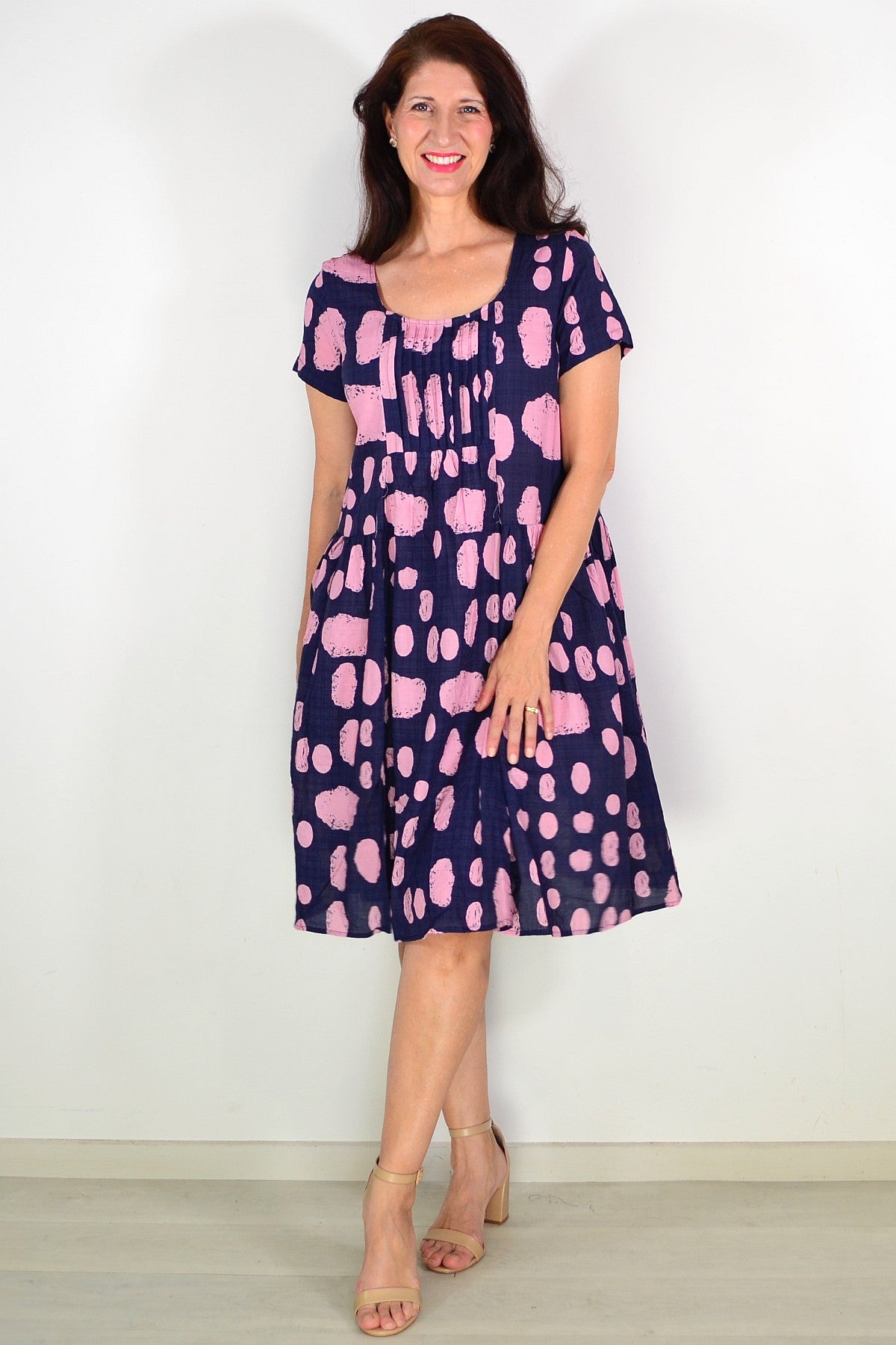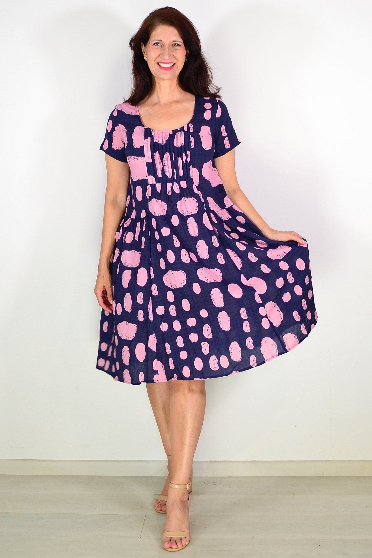 Navy Pink Spot Pleated Casual Tunic Dress