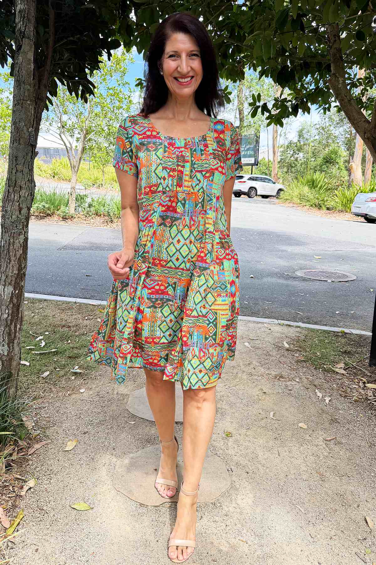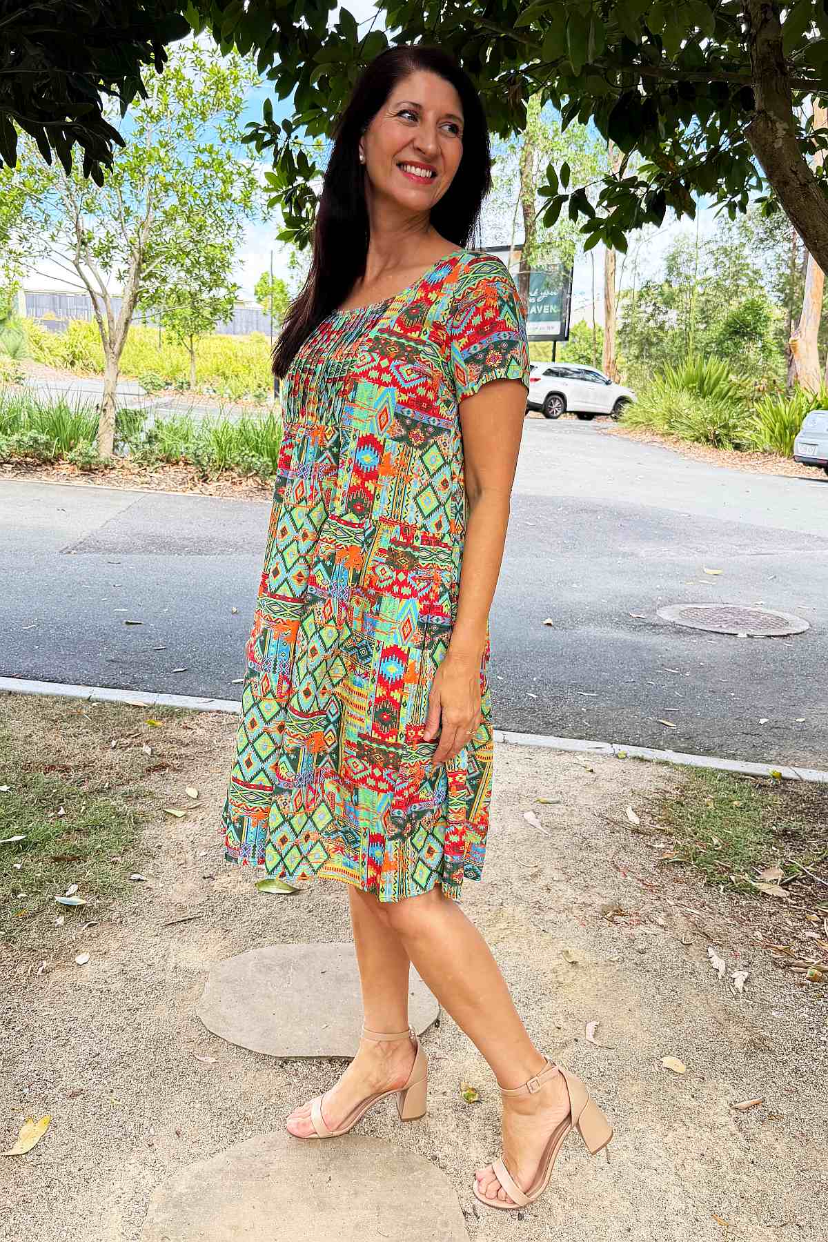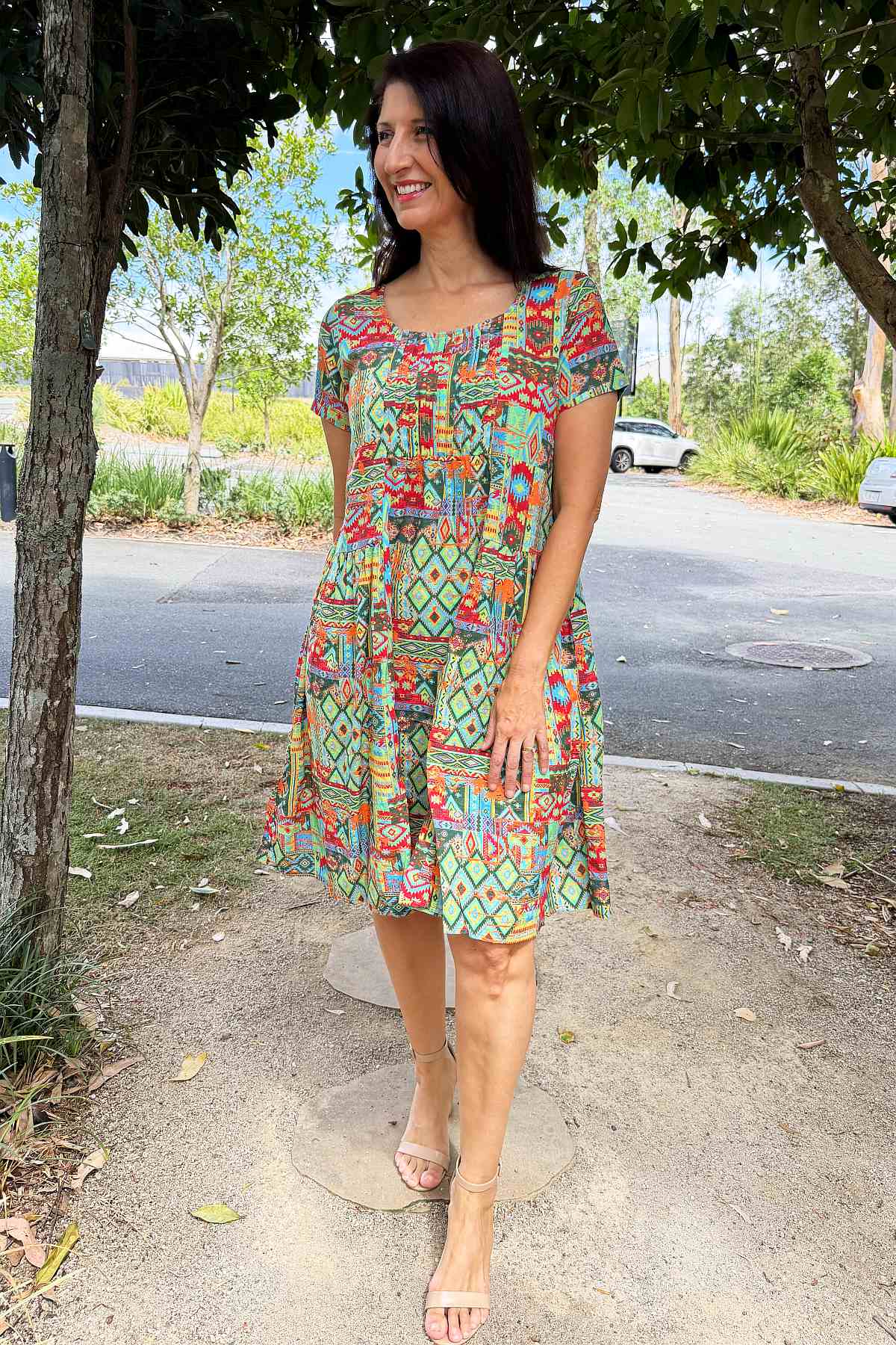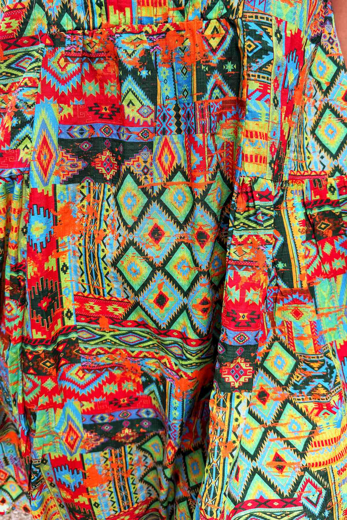 Regular price $59.99This season's must-have tunic dress combines contemporary style with timeless appeal. Set against a vibrant neon green backdrop, an intricate Aztec motif in coral and blue creates visual intrigue and movement. Woven from a sumptuous 65% cotton and 35% rayon blend, the fabric feels wonderfully soft against the skin while maintaining its structured form. The A-line silhouette is enhanced by elegant pintuck pleats positioned at the bust, allowing freedom of movement whilst flattering your frame. Short sleeves and a graceful scoop neckline offer understated sophistication, while the knee-length hem strikes the perfect balance between casual and refined. Every piece features its own distinctive print variation, making it uniquely yours.