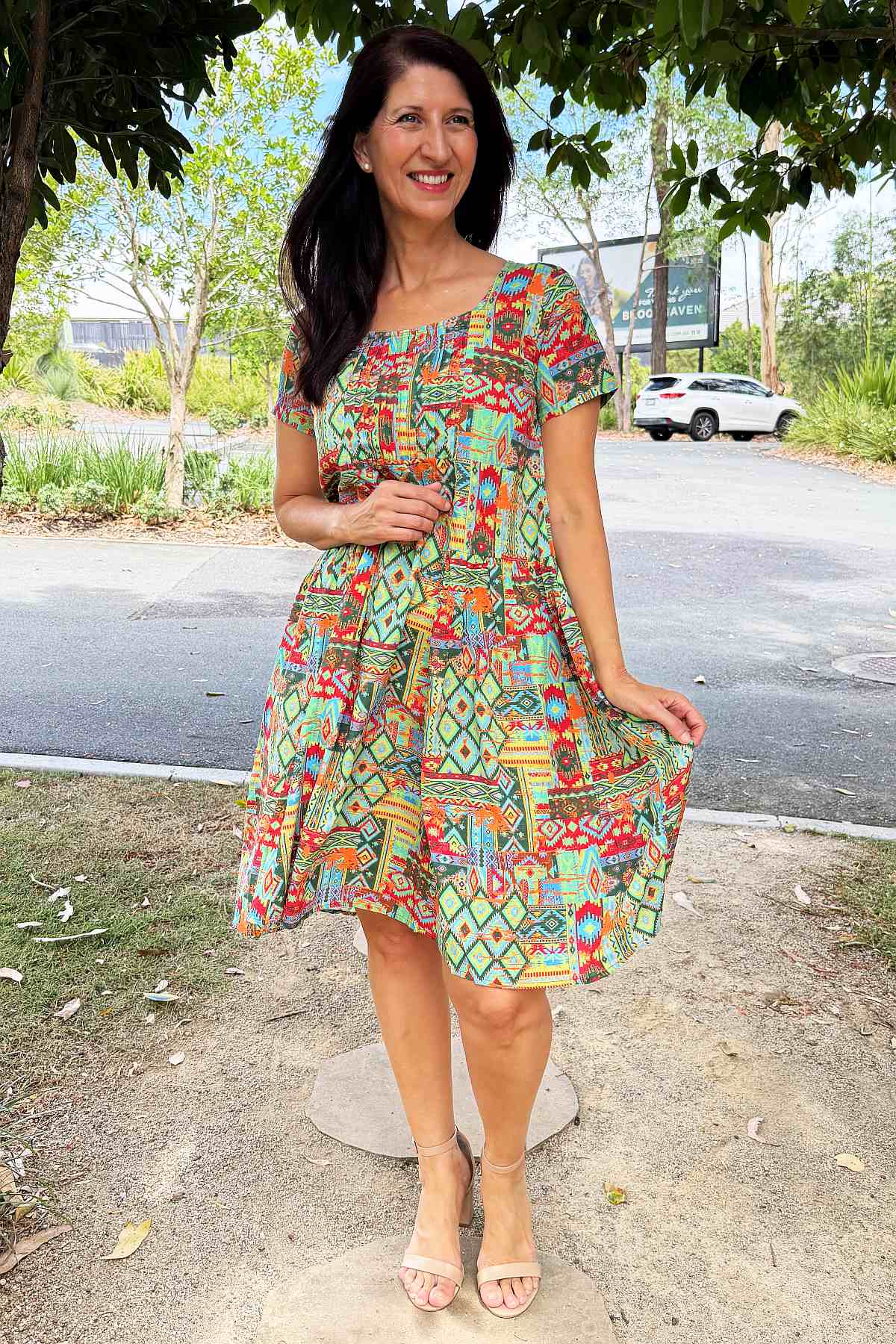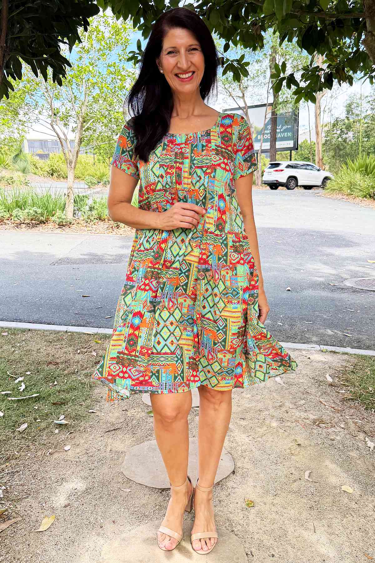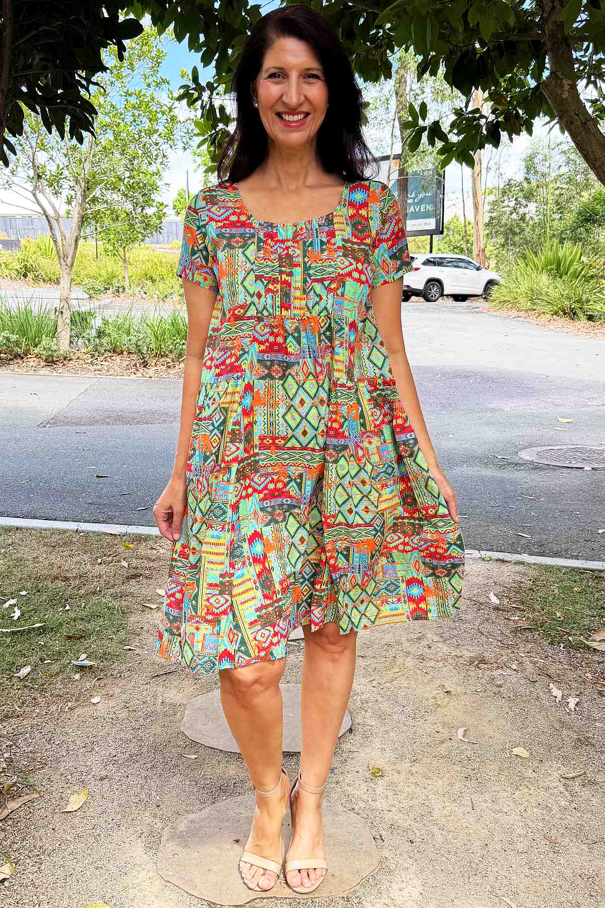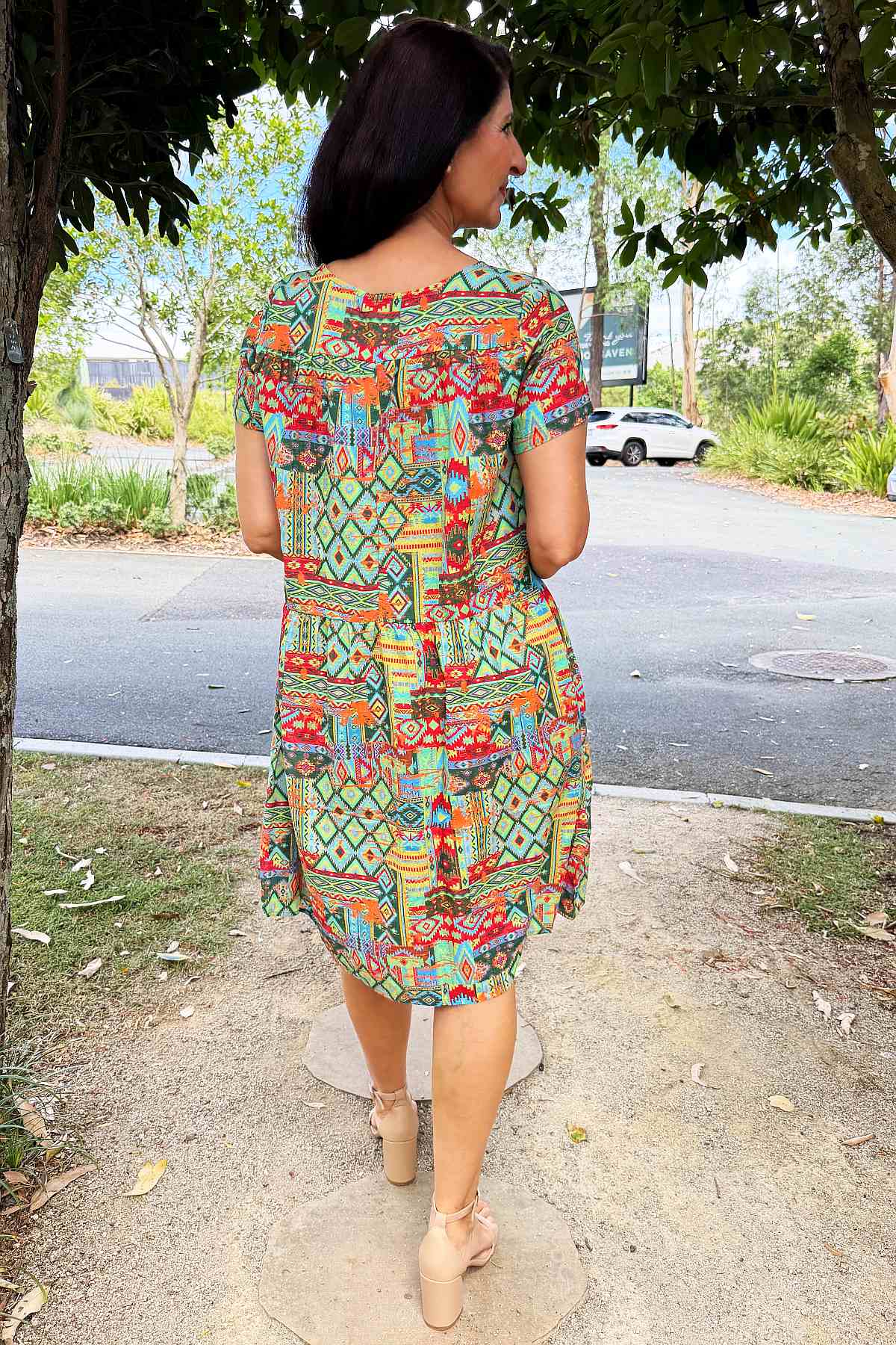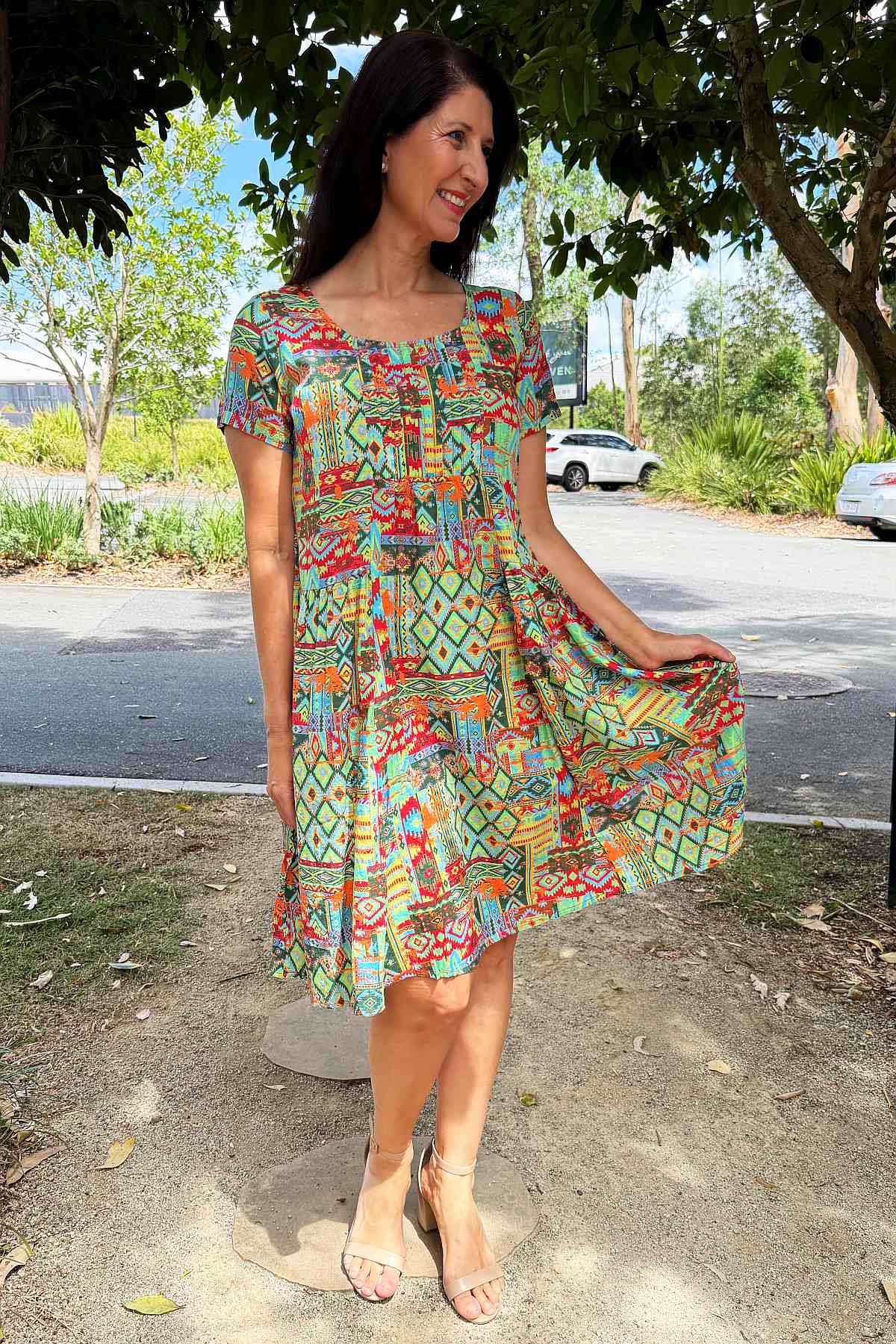 Regular price $59.99This season's must-have tunic dress combines contemporary style with timeless appeal. Set against a vibrant neon green backdrop, an intricate Aztec motif in coral and blue creates visual intrigue and movement. Woven from a sumptuous 65% cotton and 35% rayon blend, the fabric feels wonderfully soft against the skin while maintaining its structured form. The A-line silhouette is enhanced by elegant pintuck pleats positioned at the bust, allowing freedom of movement whilst flattering your frame. Short sleeves and a graceful scoop neckline offer understated sophistication, while the knee-length hem strikes the perfect balance between casual and refined. Every piece features its own distinctive print variation, making it uniquely yours.