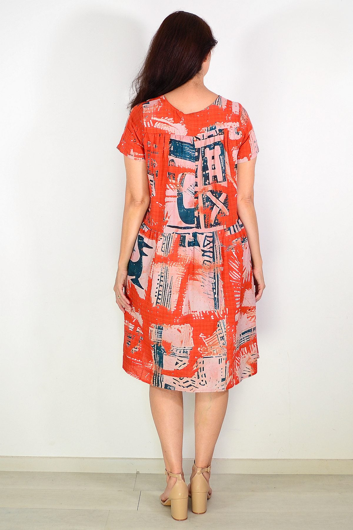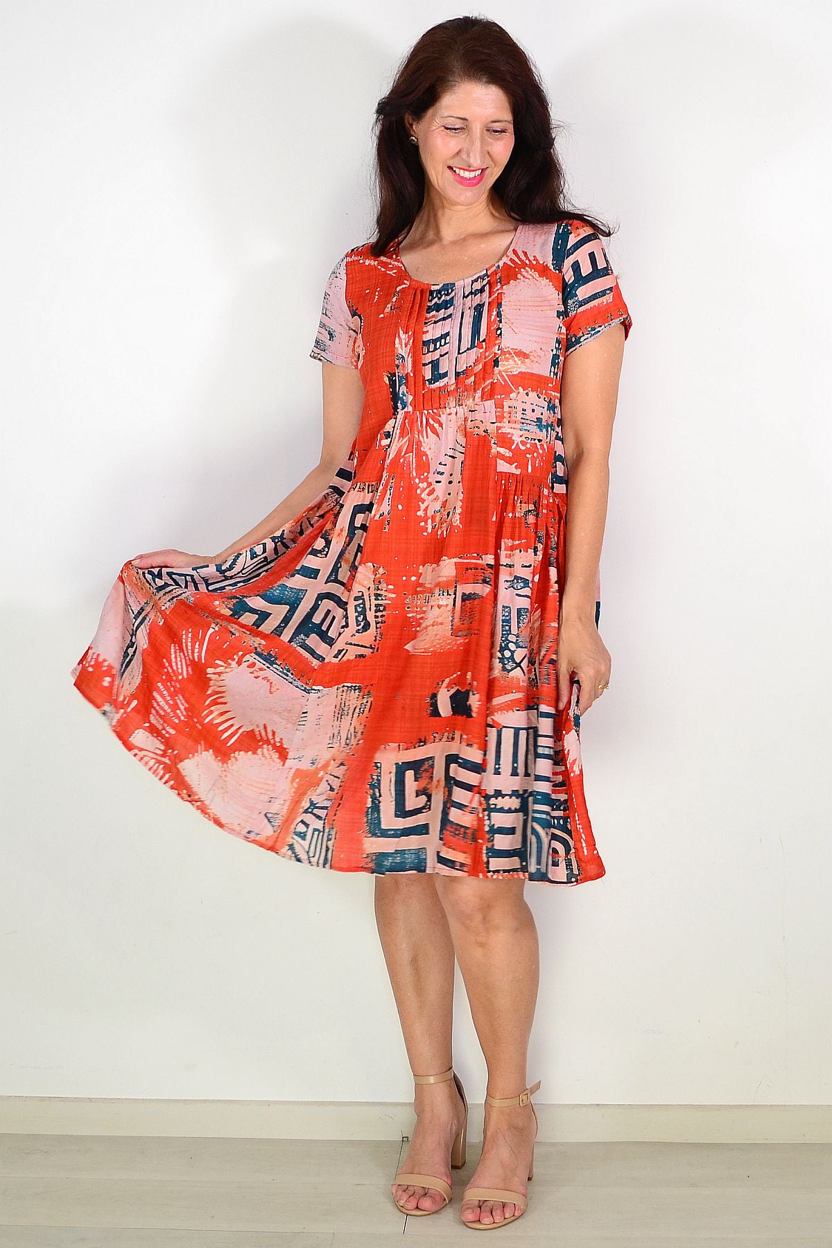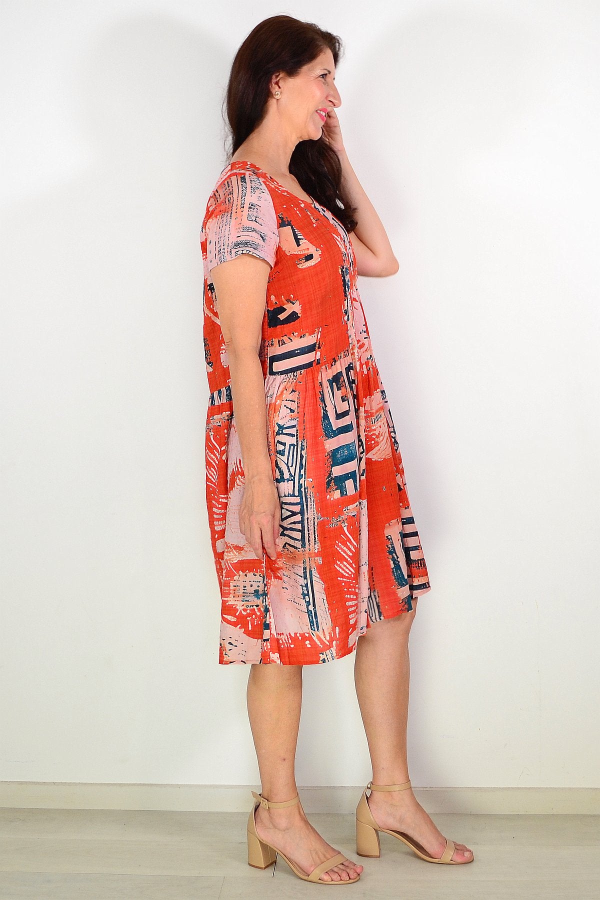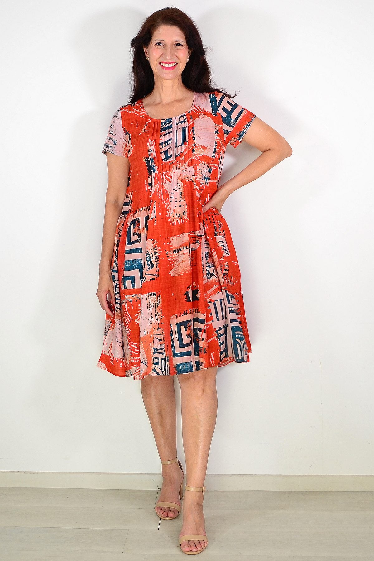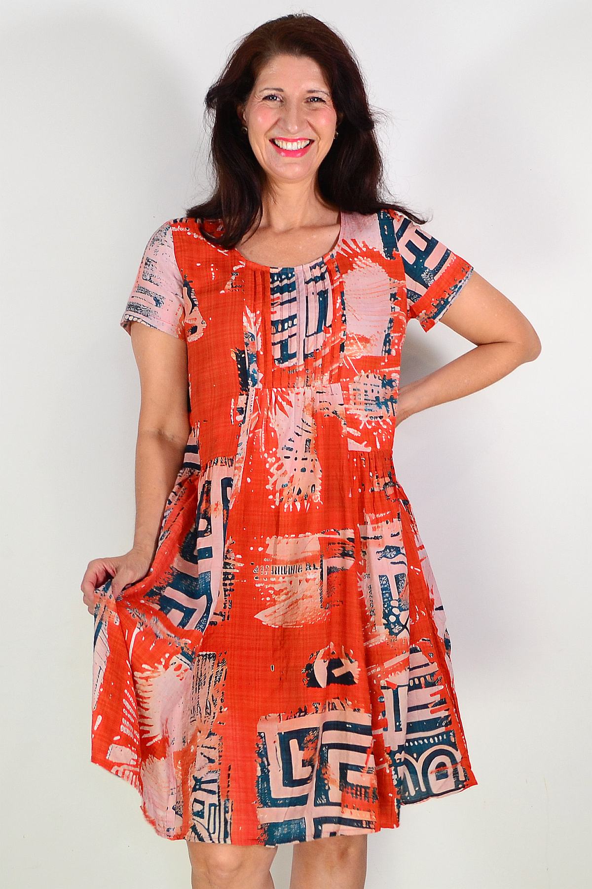 Regular price $59.99Radiant and refined, this orange abstract tunic dress brings warmth and character to your seasonal wardrobe. Crafted from a breathable cotton-rayon blend, the summer-weight fabric drapes beautifully without restriction. Vibrant orange and salmon tones dance across a blue background, with each garment showcasing its own distinctive print variation. Strategic pintuck pleats at the bust enhance mobility while sculpting a graceful silhouette, while the A-line silhouette flows to a knee-skimming hem. The scoop neckline and short sleeves deliver understated sophistication, making this versatile piece equally suited to casual gatherings or relaxed social occasions.