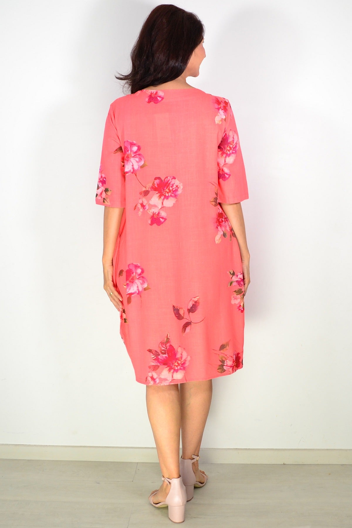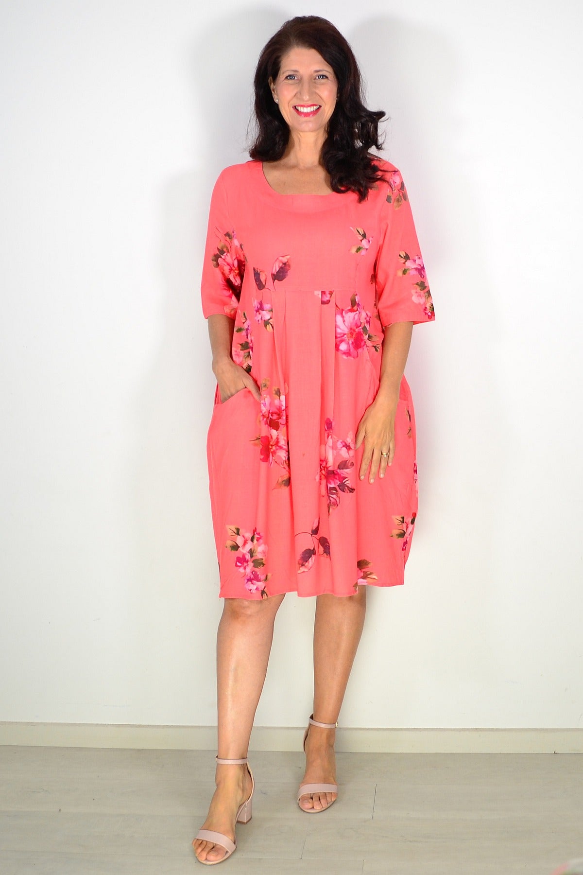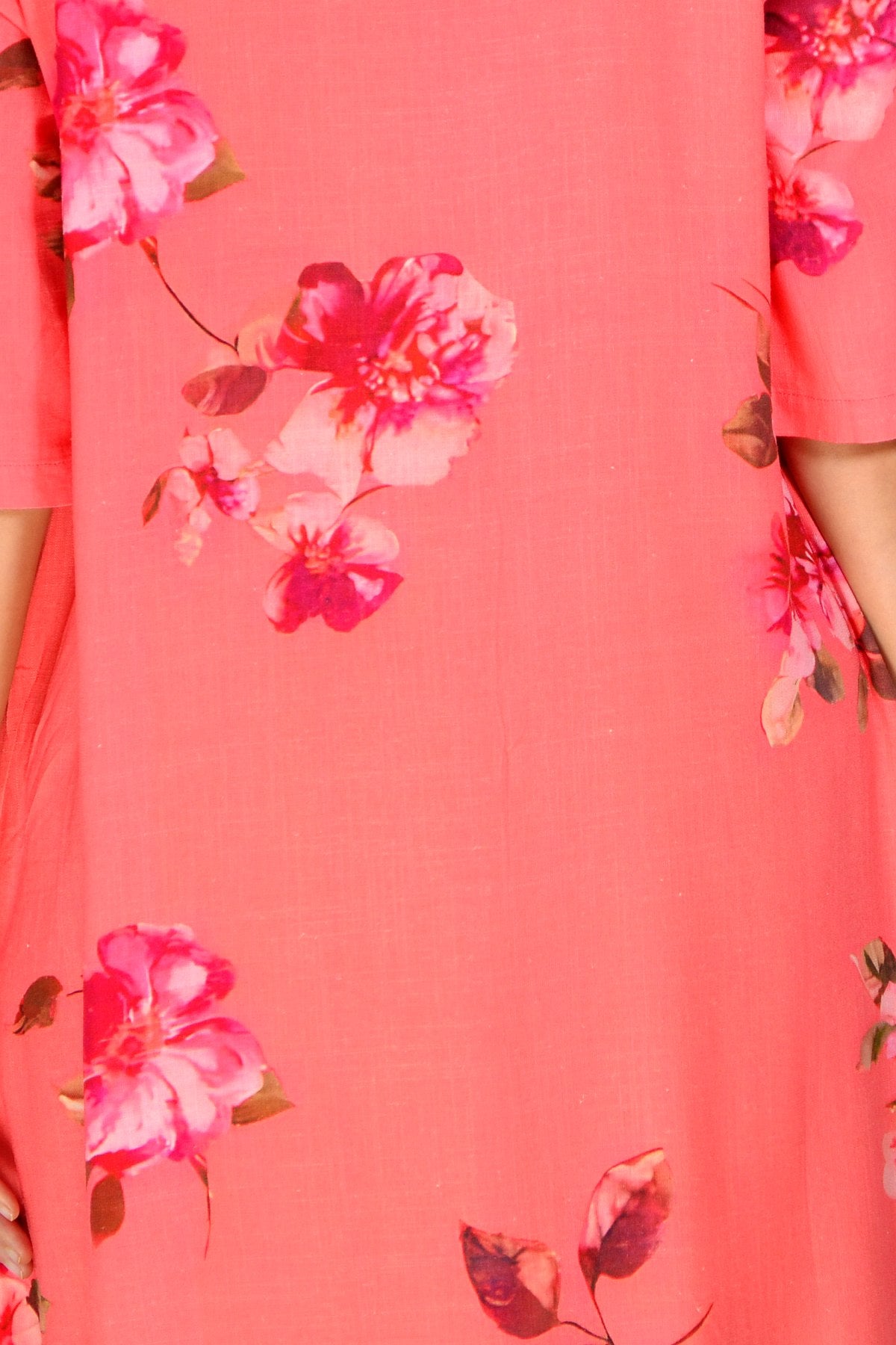 - Pink Peach Floral Print Midi Dress Tunic: Linen blend base with a vibrant background and a floral print