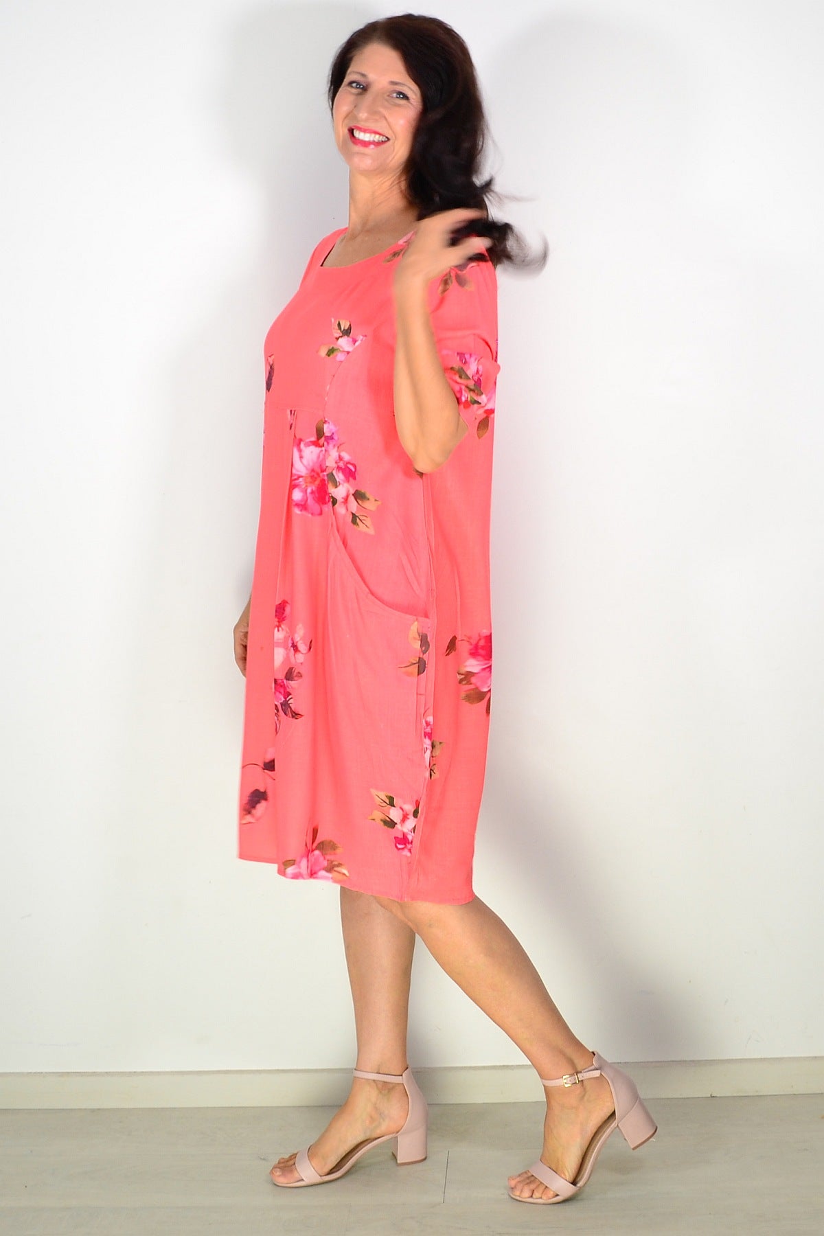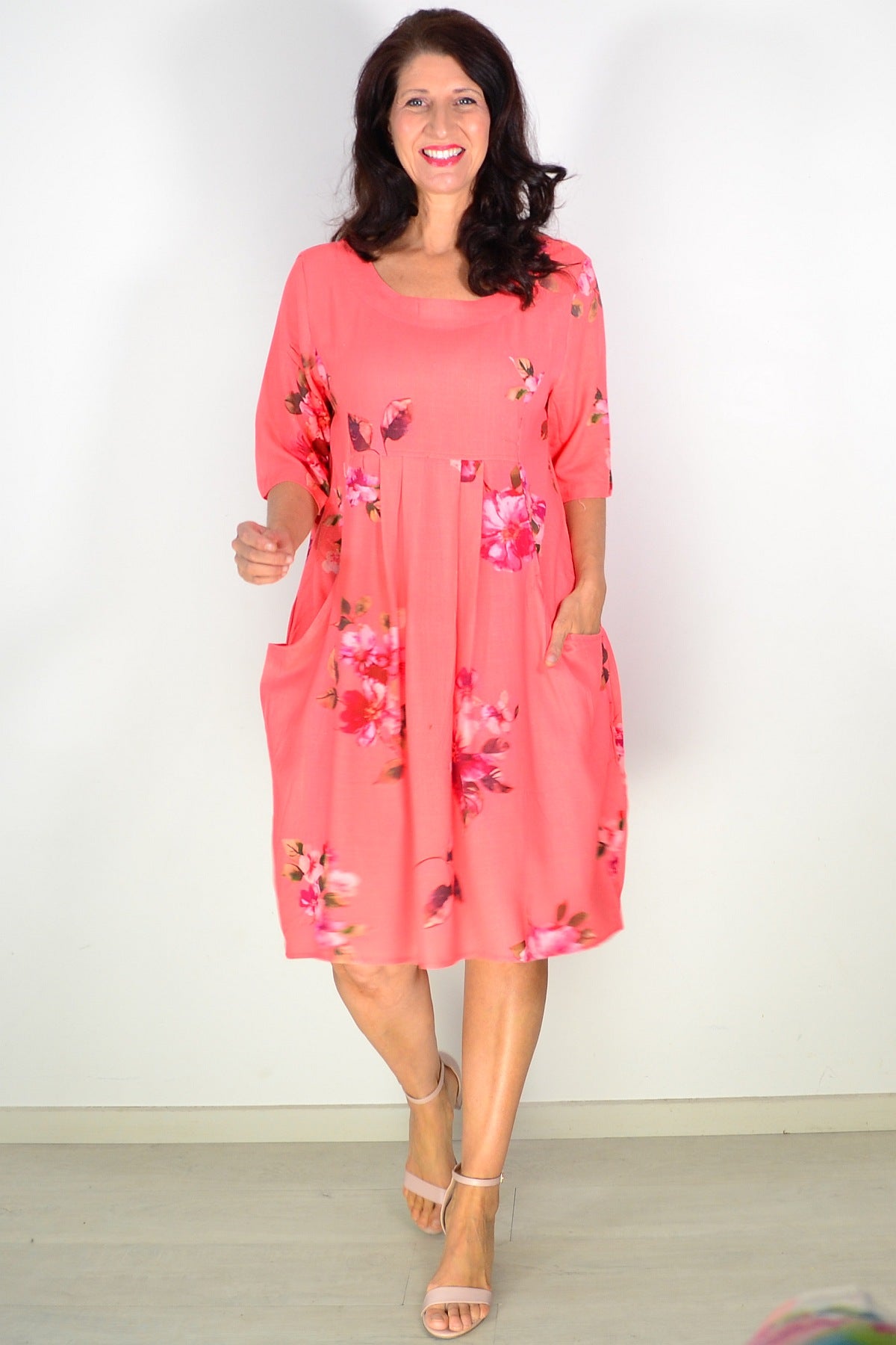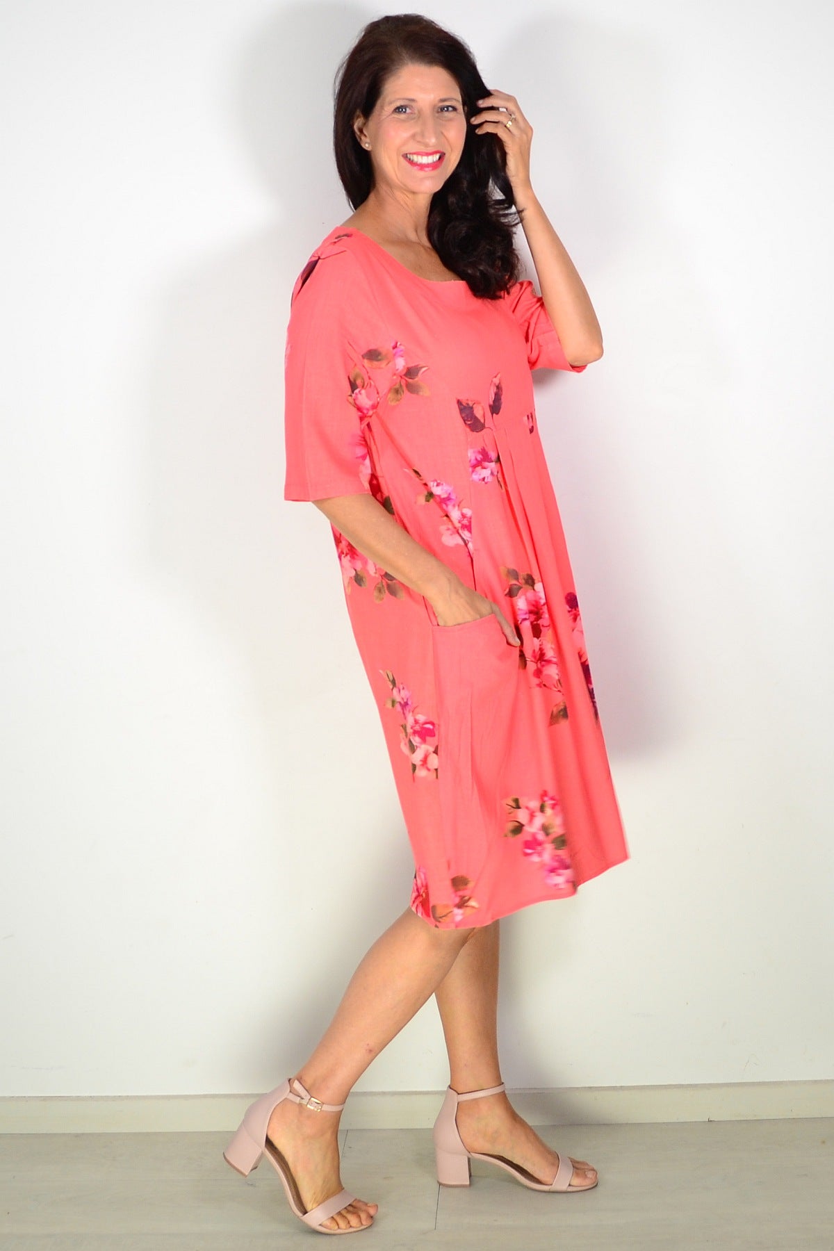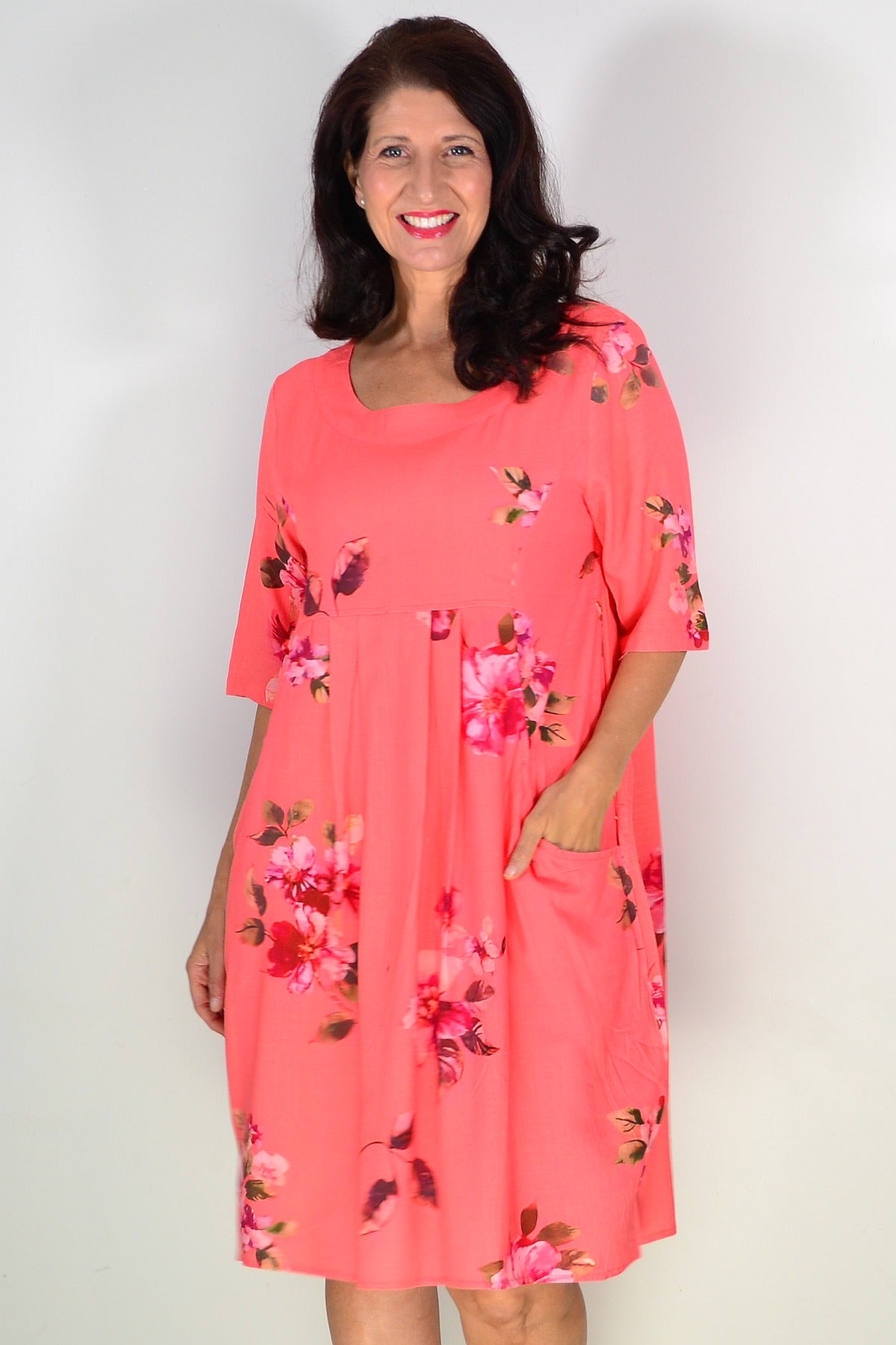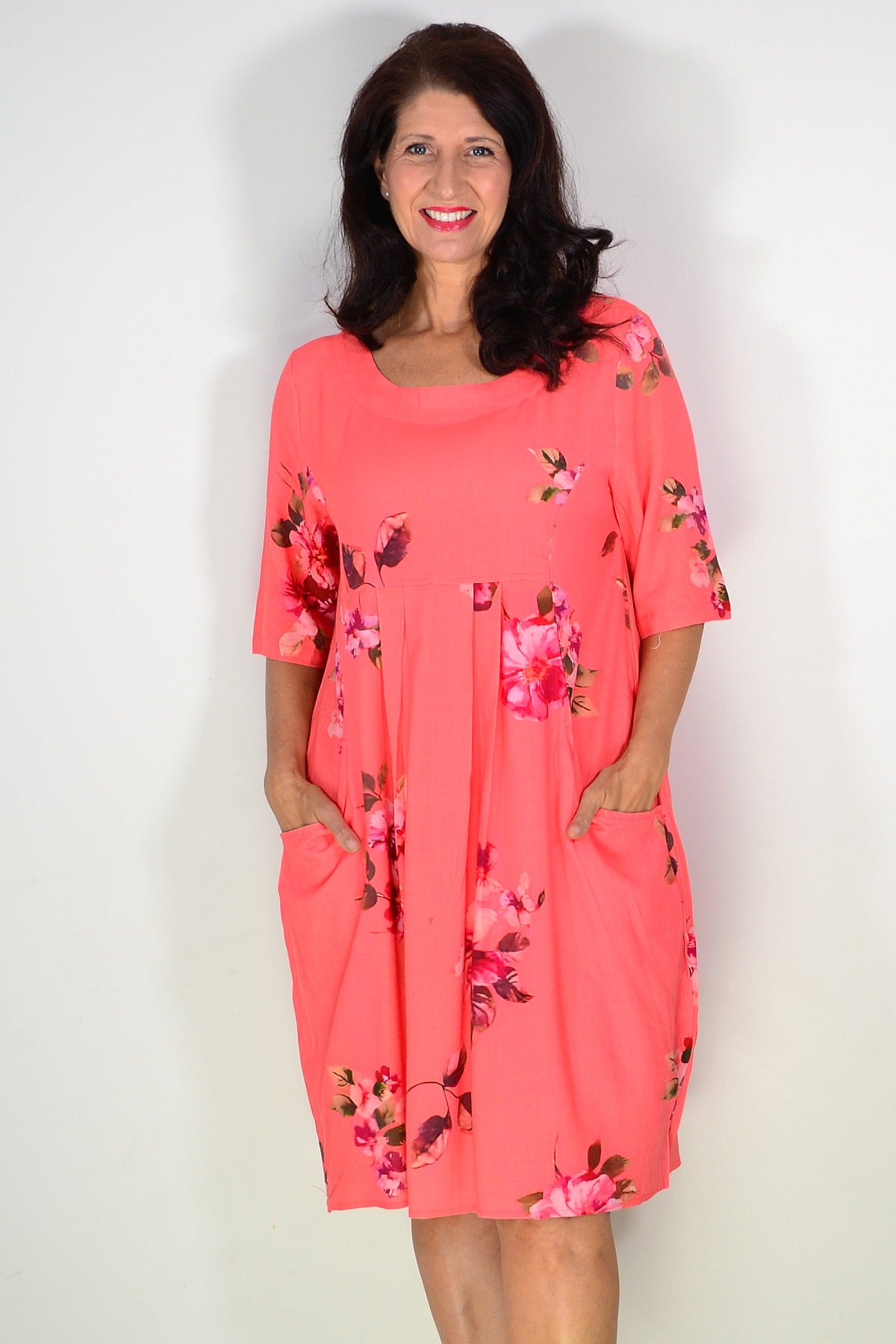 Pink Peach Floral Print Midi Dress Tunic is available in size 10 to 20 - Please have a look at our sizing guide to help you selected the size that compliments you