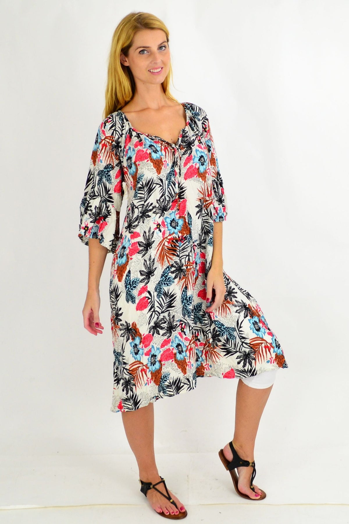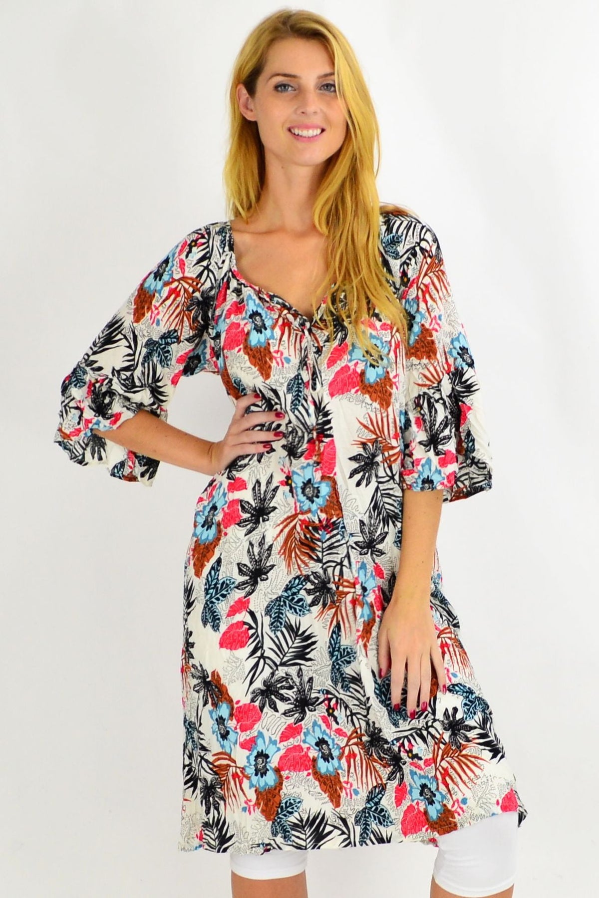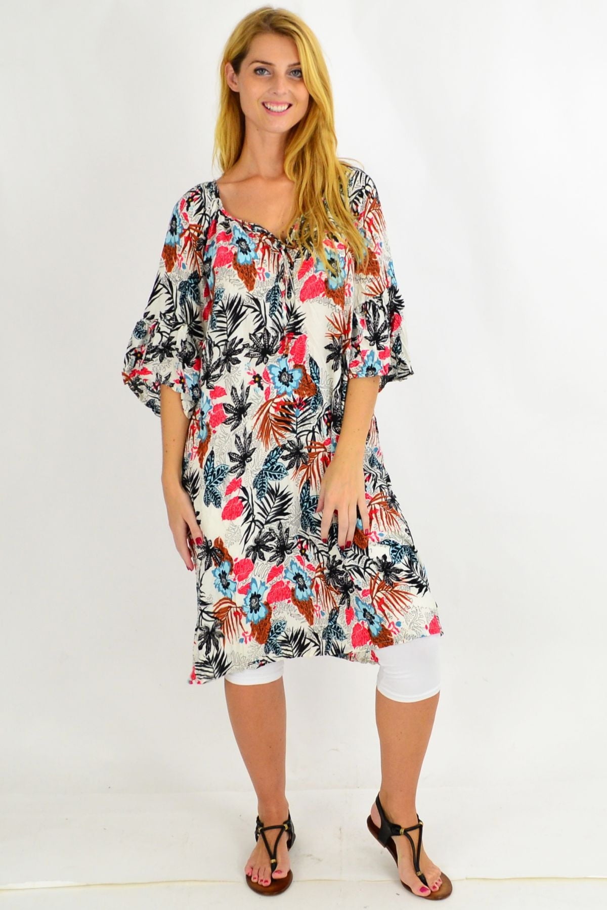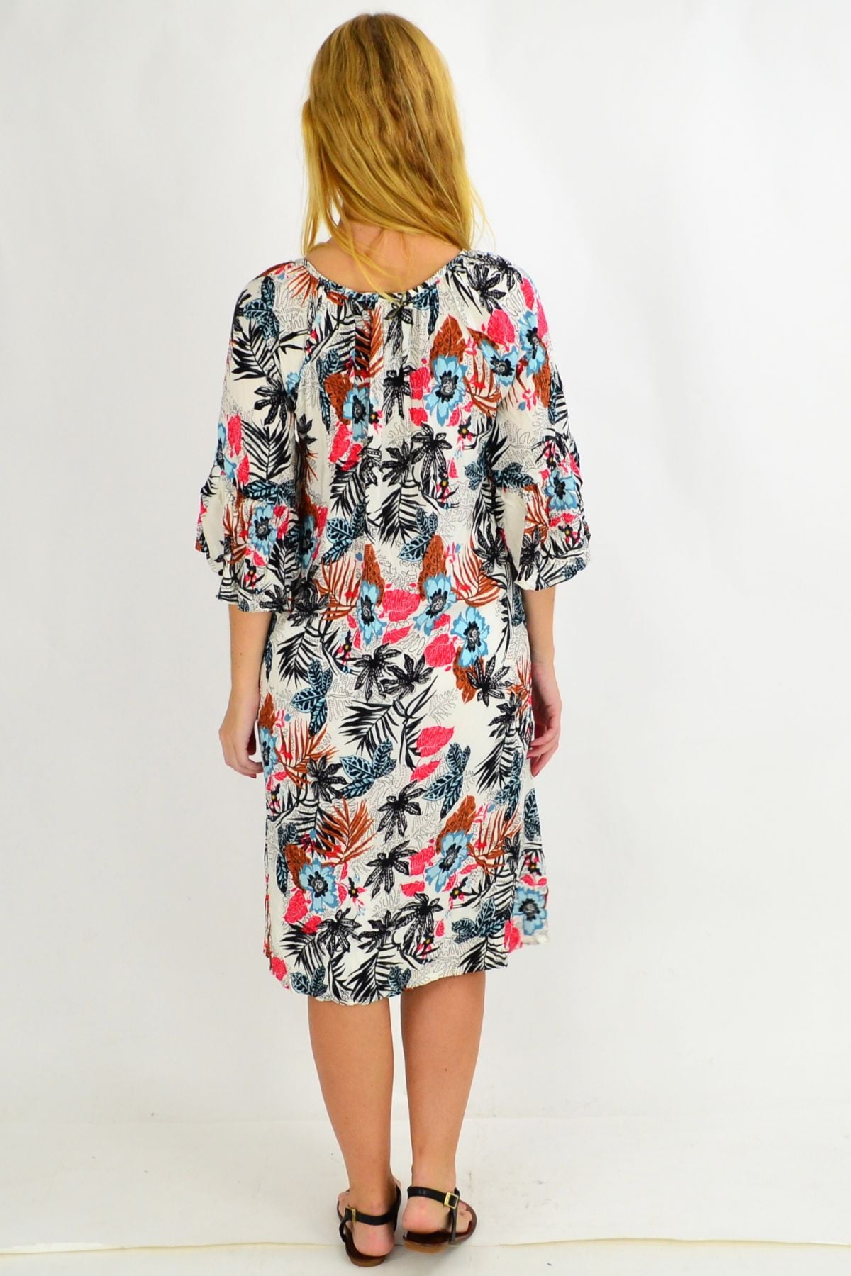 Regular price $49.99This Amy Tropical Dress is a must have this season. It features a A-line design cut from a soft, light fabric that will never need ironing. With seamless 3/4 sleeves that end in bell cuffs, a round notch neck with ties and a hemline that hangs longer at the sides. This style can easily be dressed up or down, and looks equally gorgeous for a casual beach day or dressed up with heel for a hot summer night.