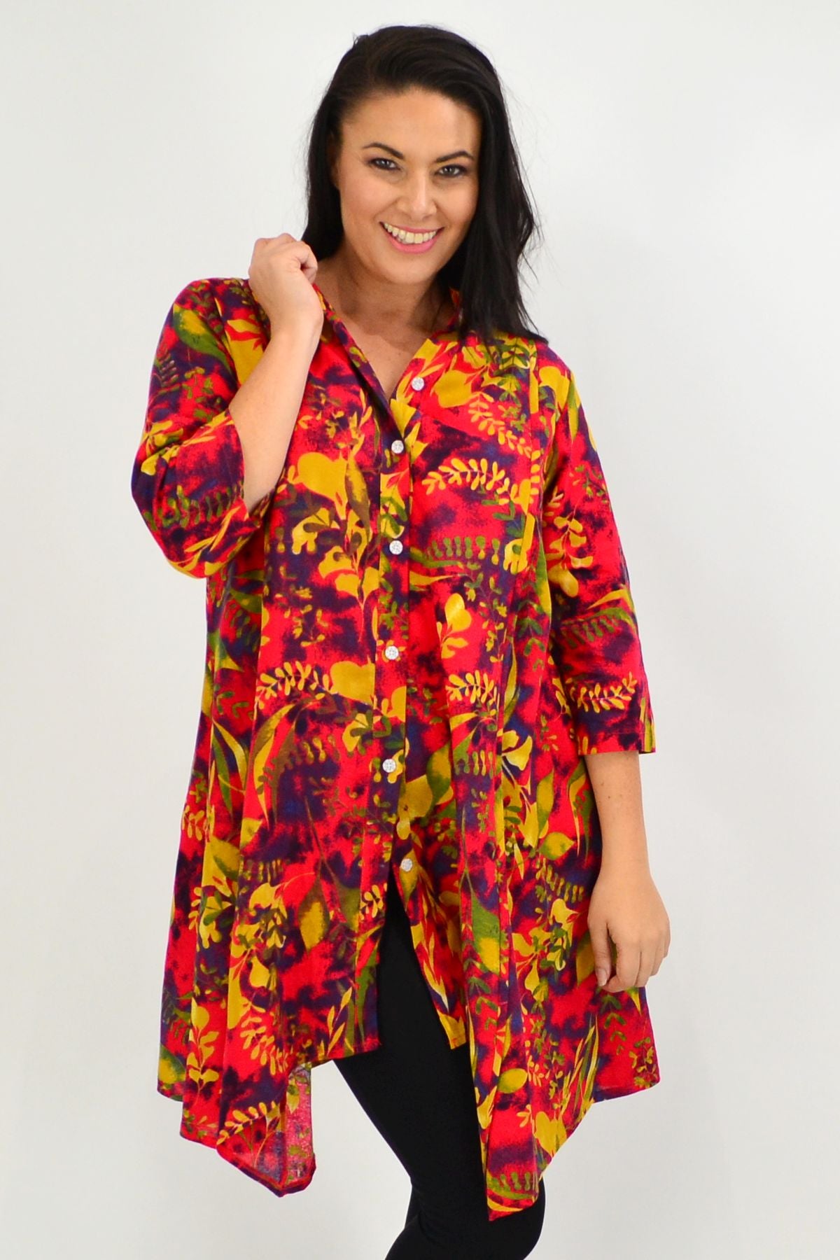 The Autumn Leaves Stand Collar Long Shirt is available in size 16 to 22 - Please have a look at our sizing guide to help you selected the size that compliments you