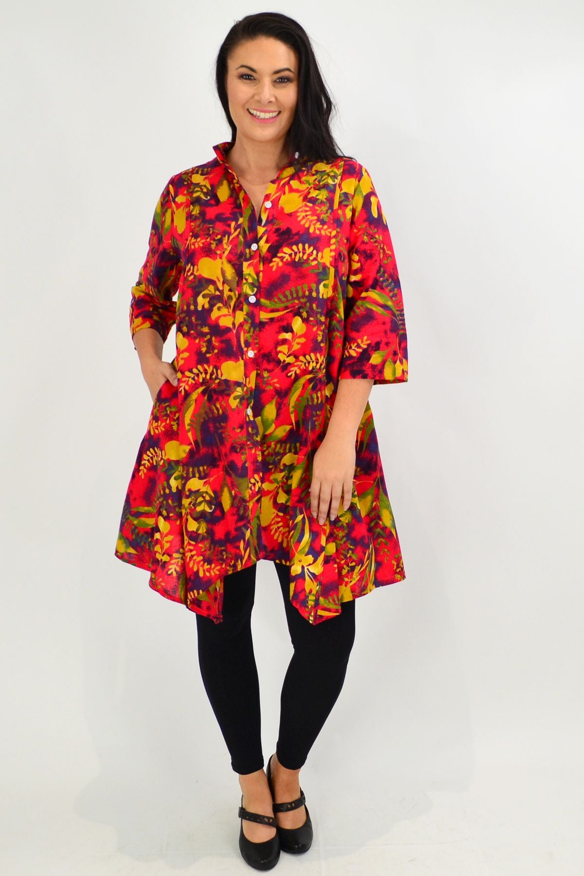 Regular price $59.99The Autumn Leaves Stand Collar Long Shirt is made in a woven cotton fabric with a stand collar, 3/4 sleeves in a A line cut and is perfect for the turn of the season. Match with leggings and flats for an everyday look