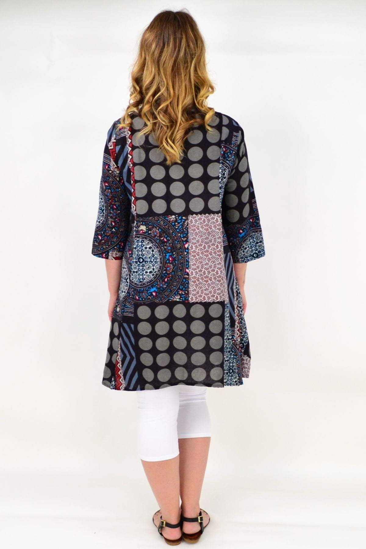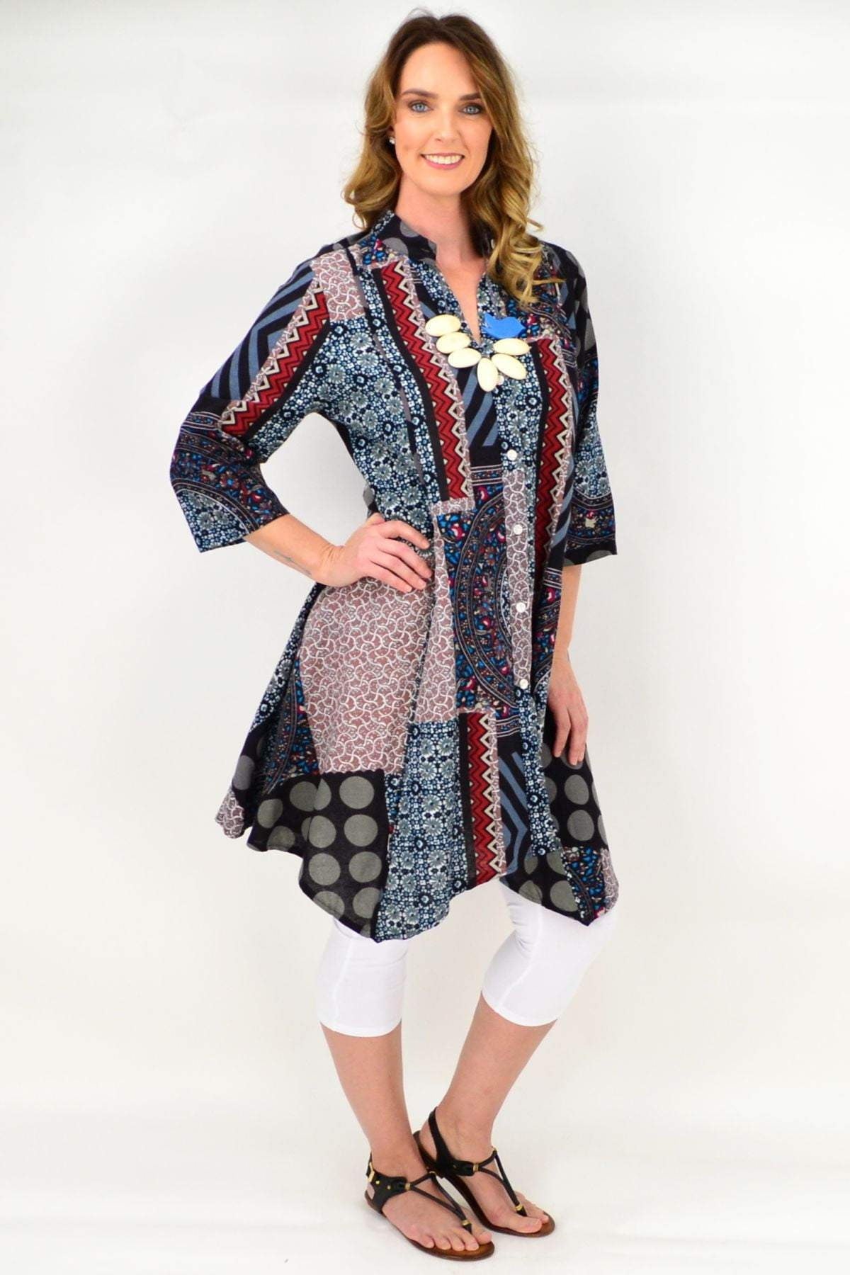 Regular price $59.99This Aztec Amaya Tunic Top is very versatile and easy to wear. It can be worn open or closes and is made in a thicker cotton in a relaxed A line shape, with 3/4 sleeves and hideaway side pleats. Team with 3/4 capris and sandals or add leggings and boots for a fabulous look