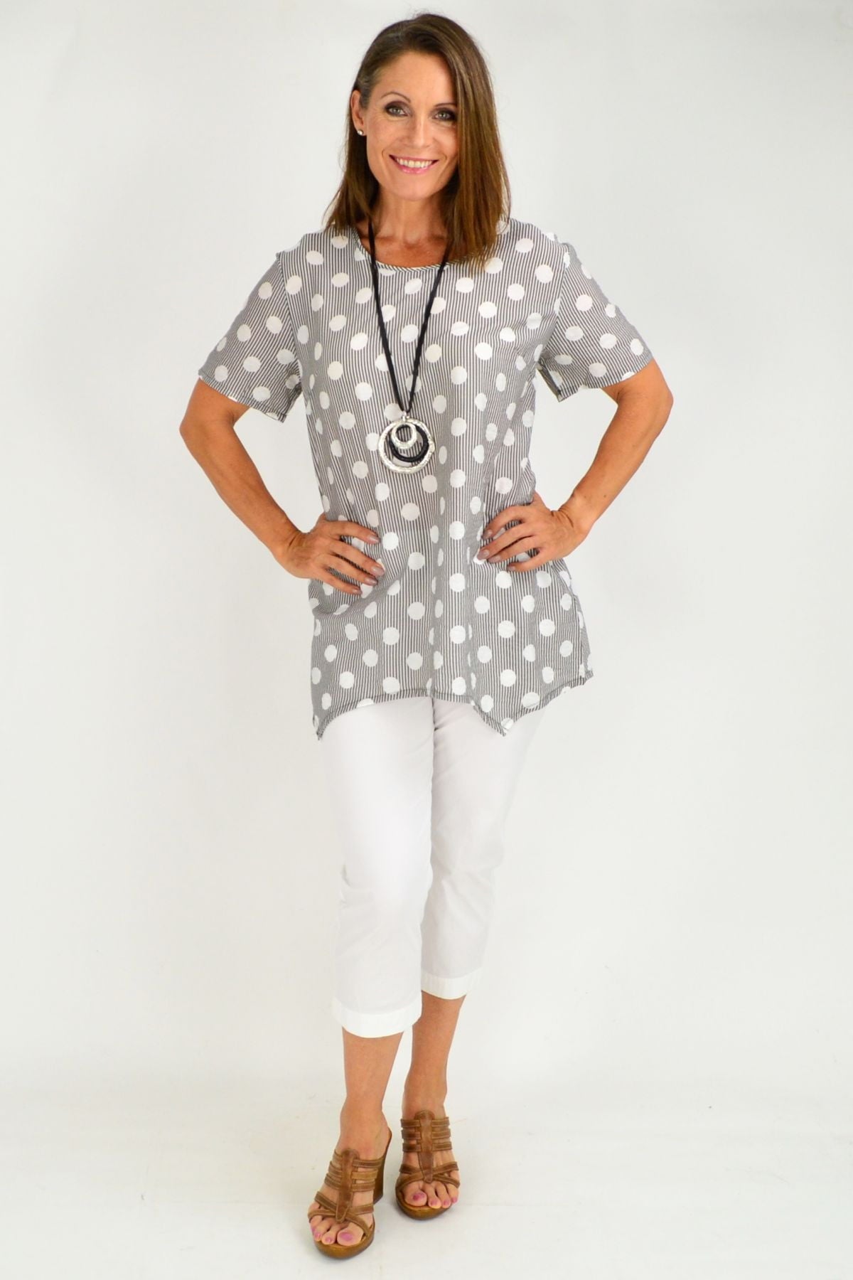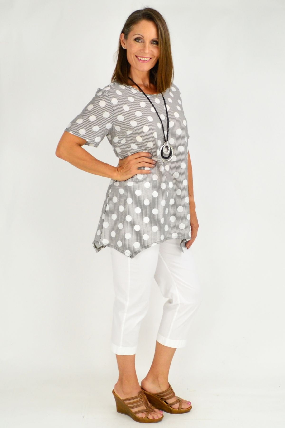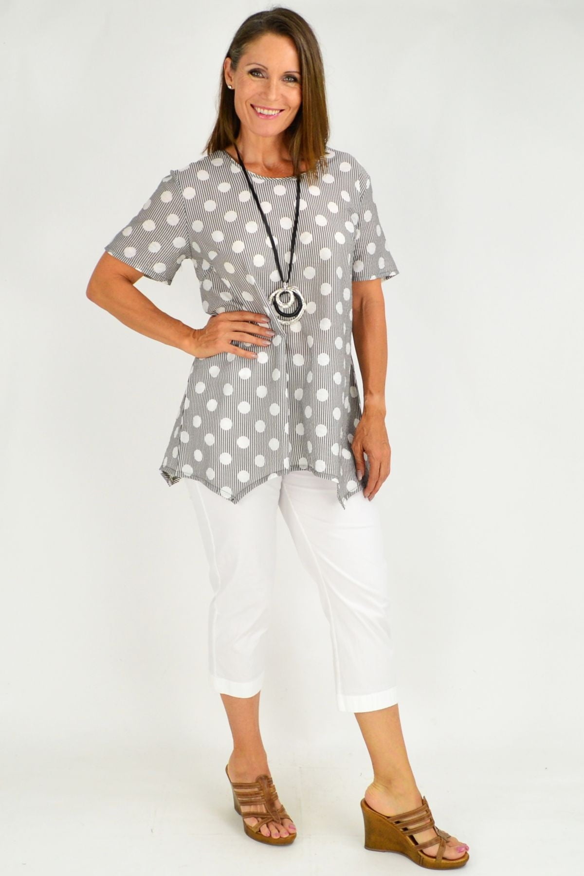 The Stacey Spot tunic blouse is made in a soft cool rayon mix fabric with short sleeves and black and white spot print. Pair it with capris and a summer hat for a stylish look this season