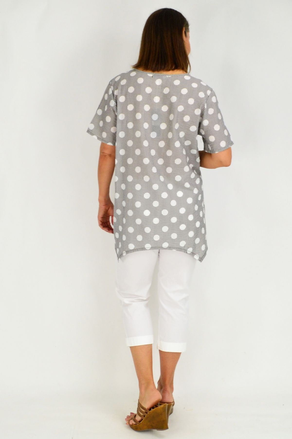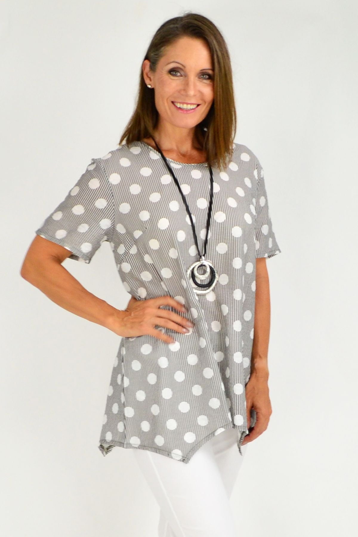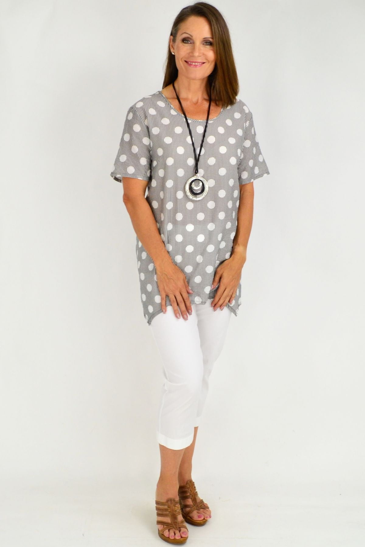 The Stacey Spot tunic blouse is made in a soft cool rayon mix fabric with short sleeves and black and white spot print. Pair it with capris and a summer hat for a stylish look this season